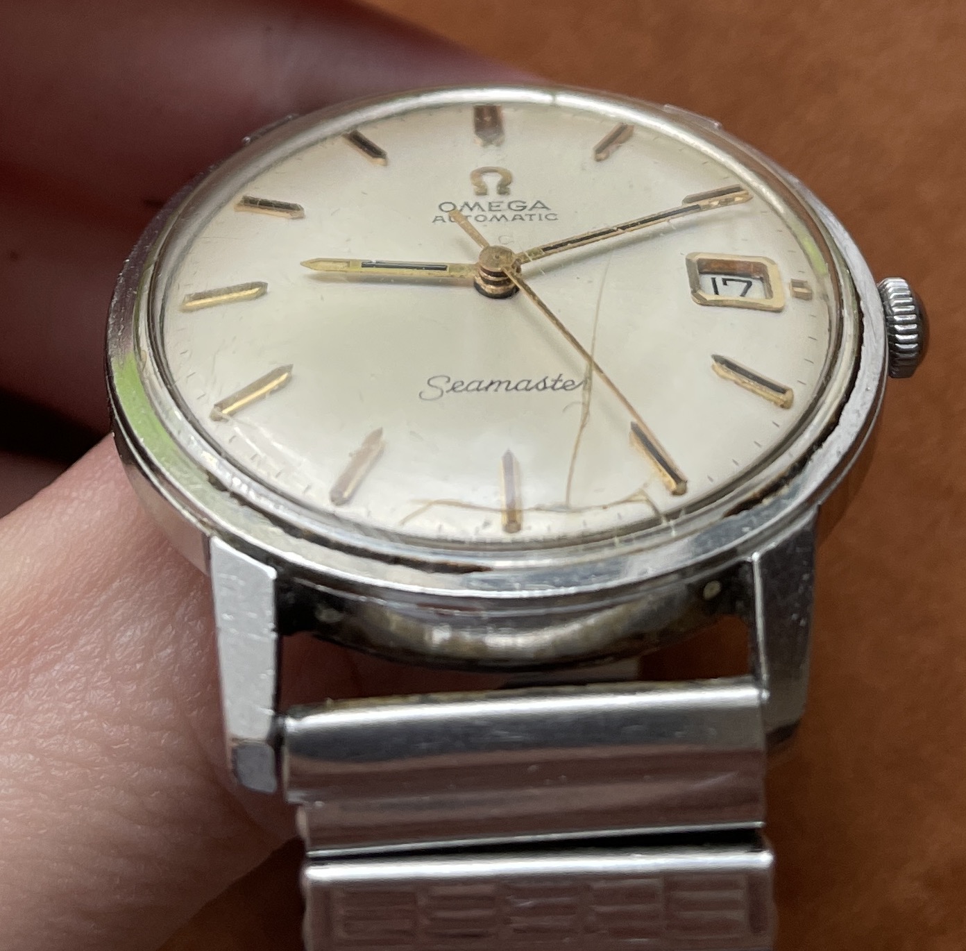 crystal: original crystal with omega logo in the middle. There is a large line/crack at 6, and a new crystal is required.