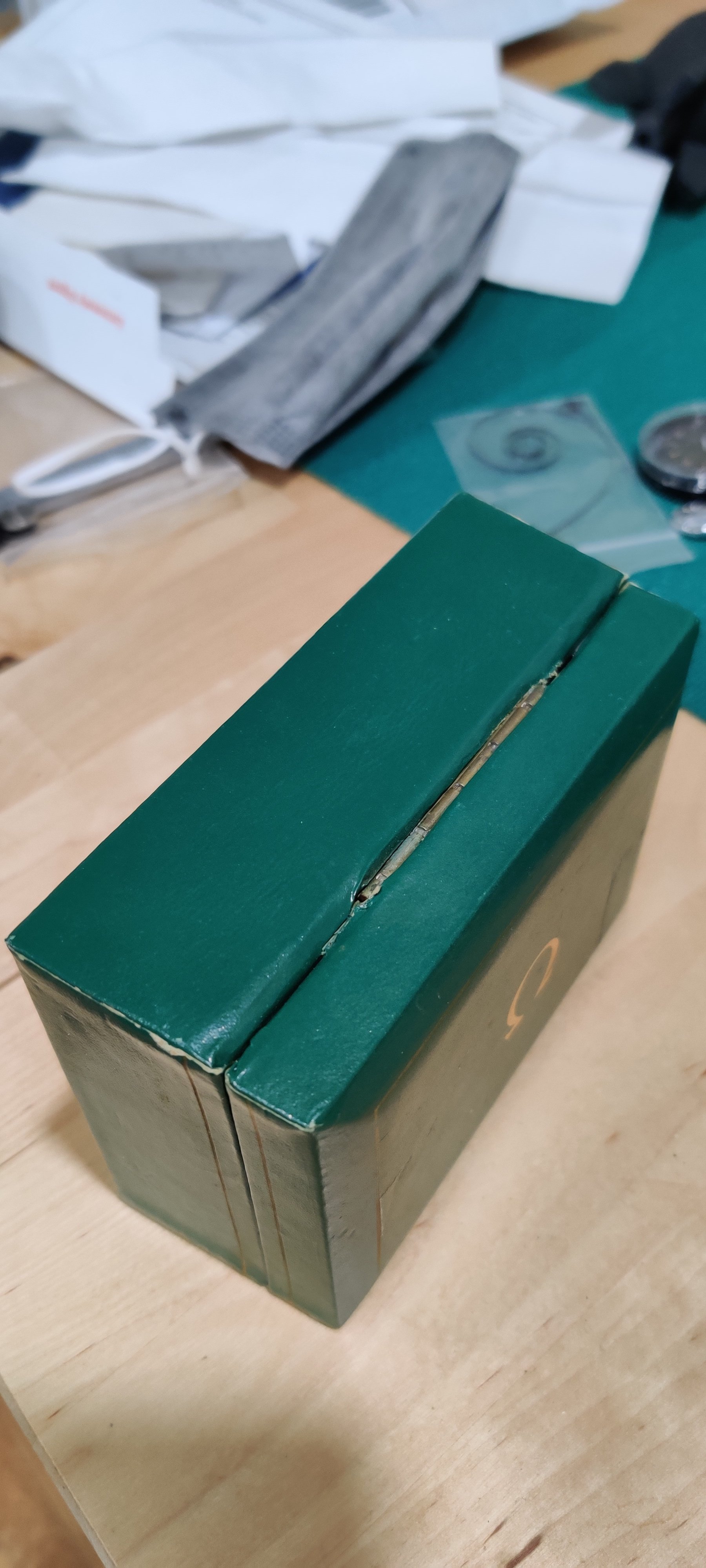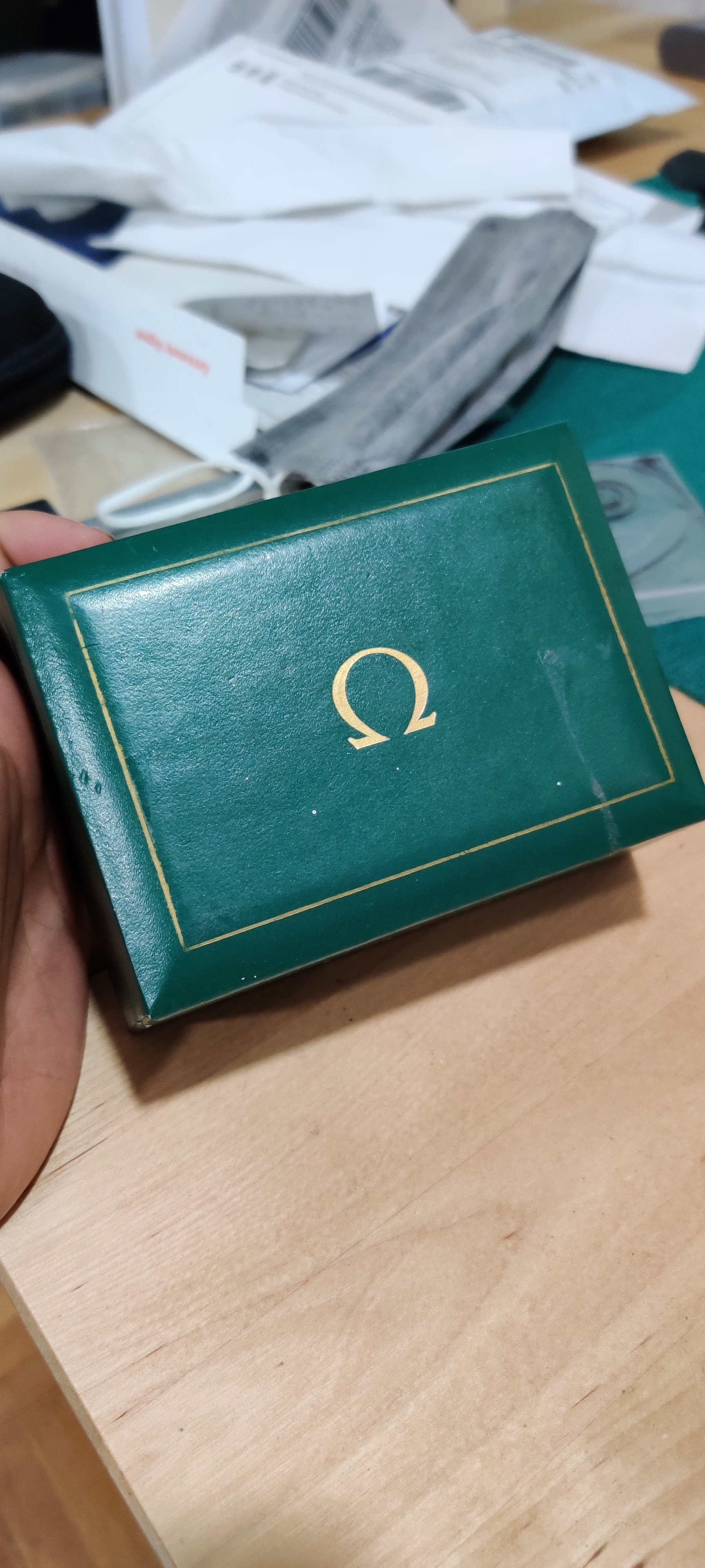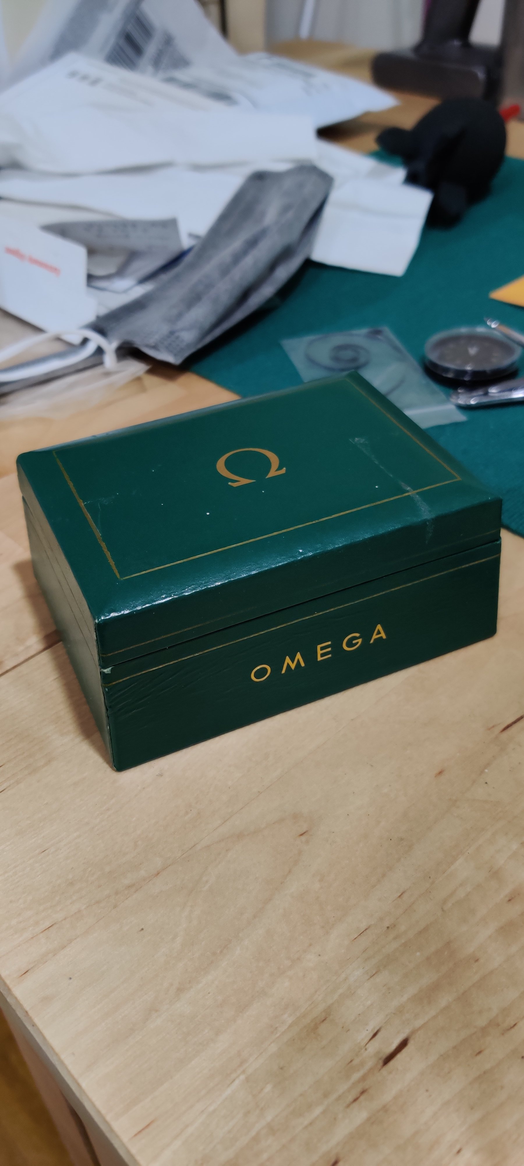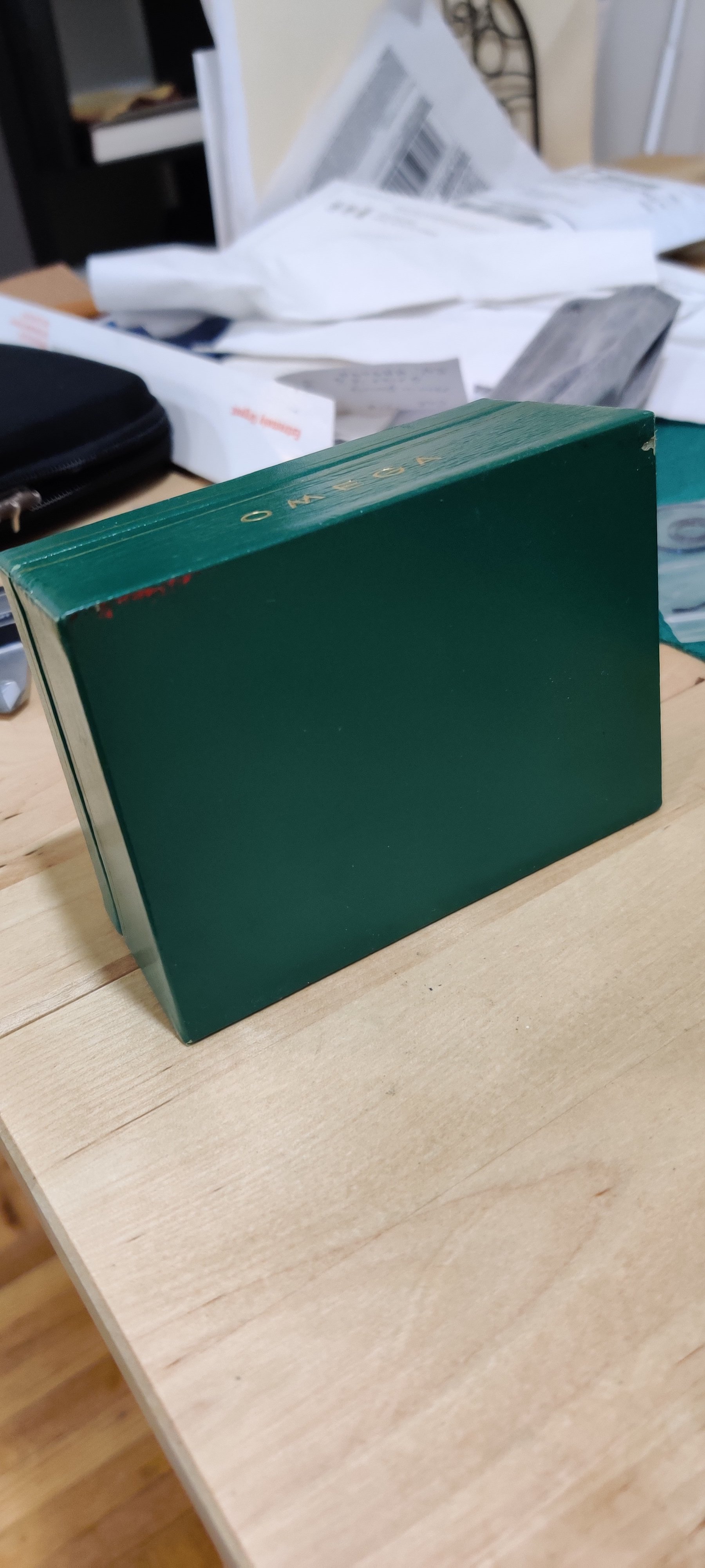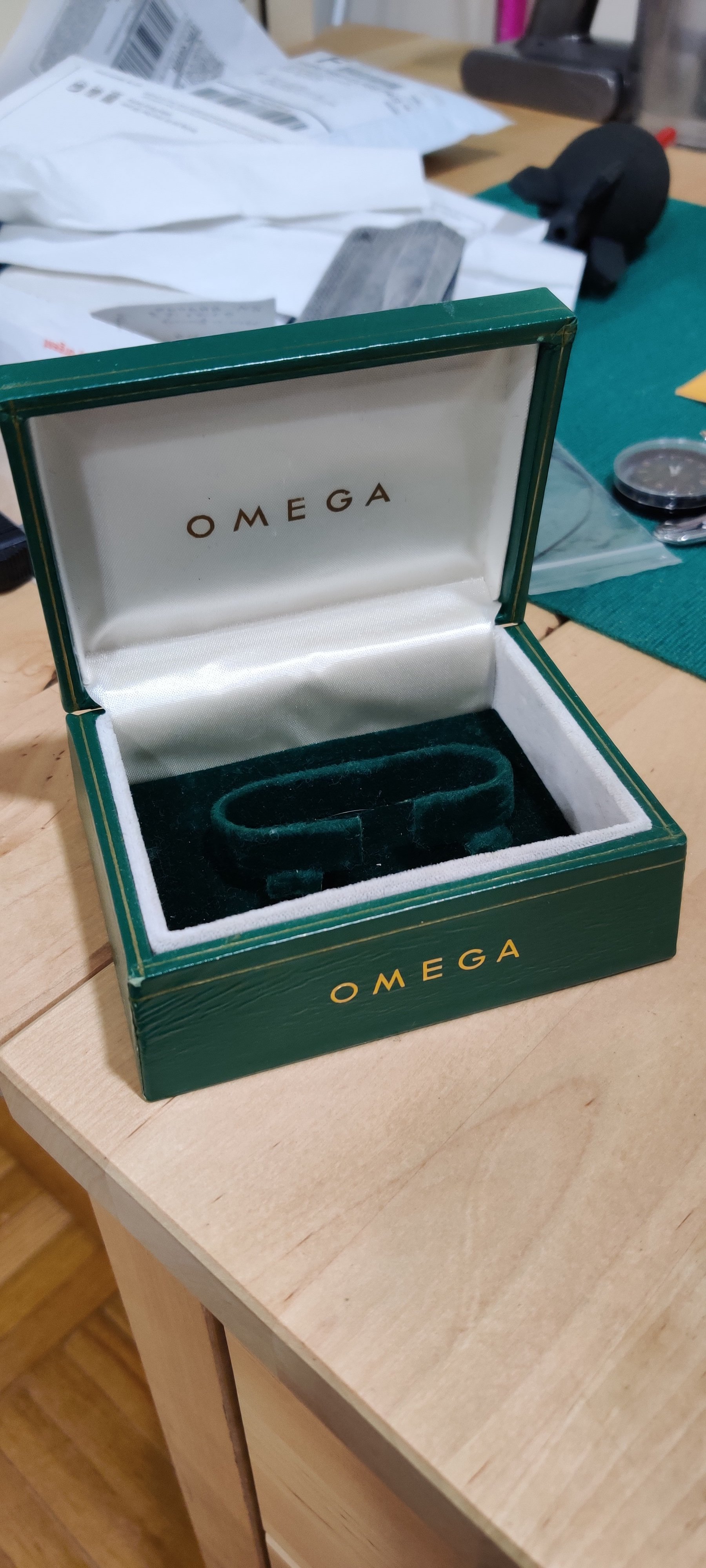 Sold - Green Omega Box - $65 shipped USA. A little worn, the inside is nice. Smaller than usual but I'm thinking it might be for a 40s or 50s piece.