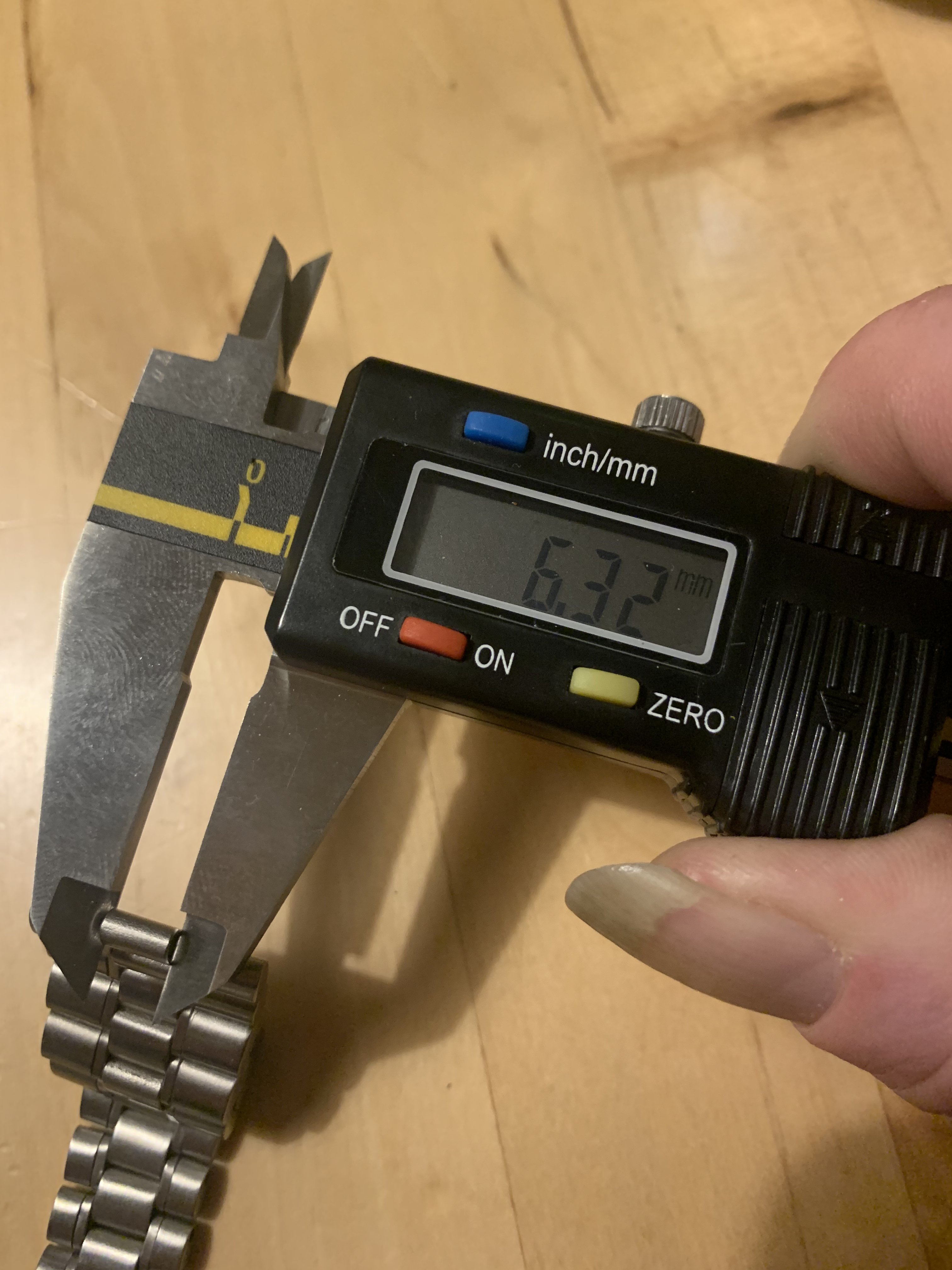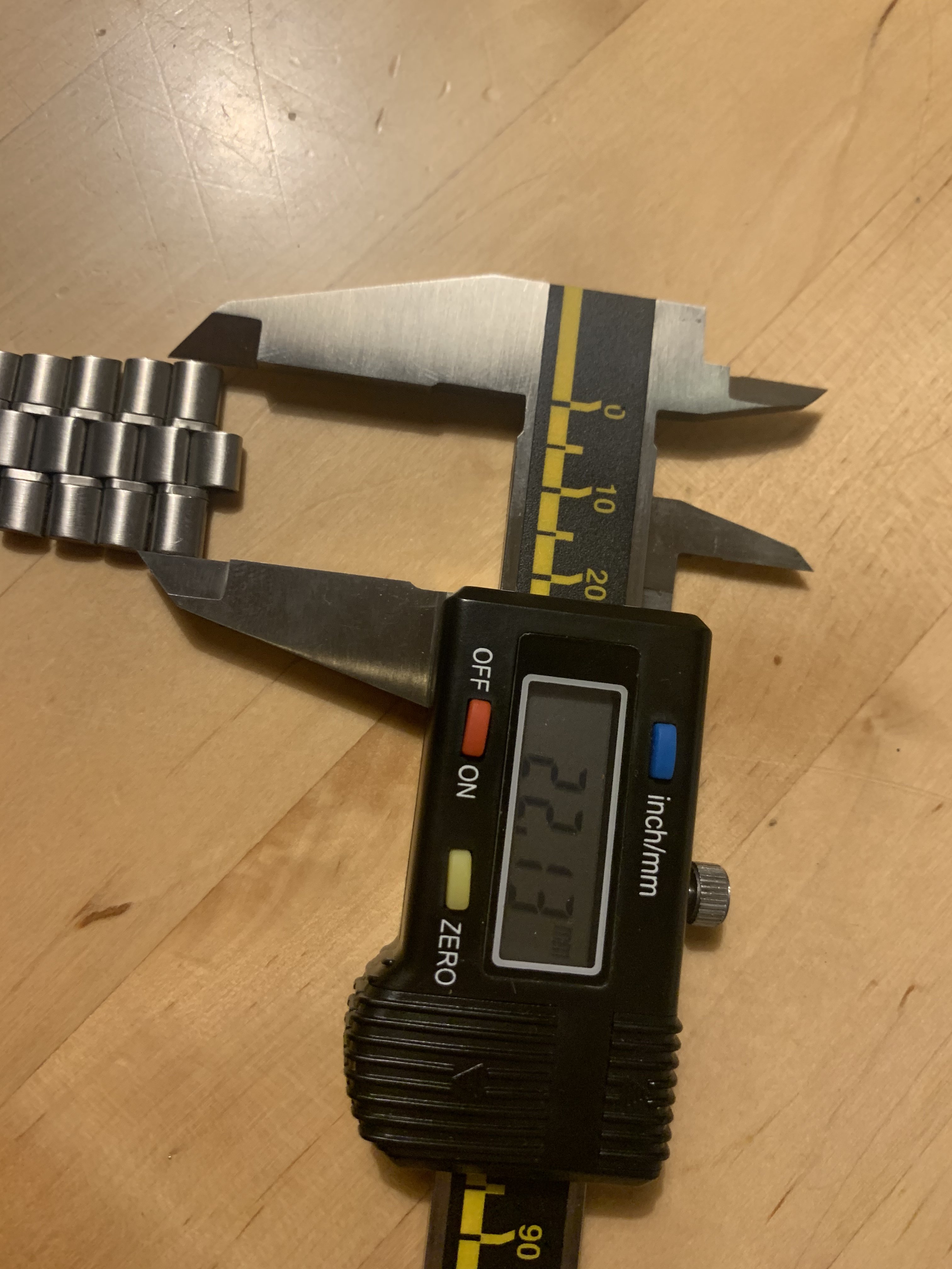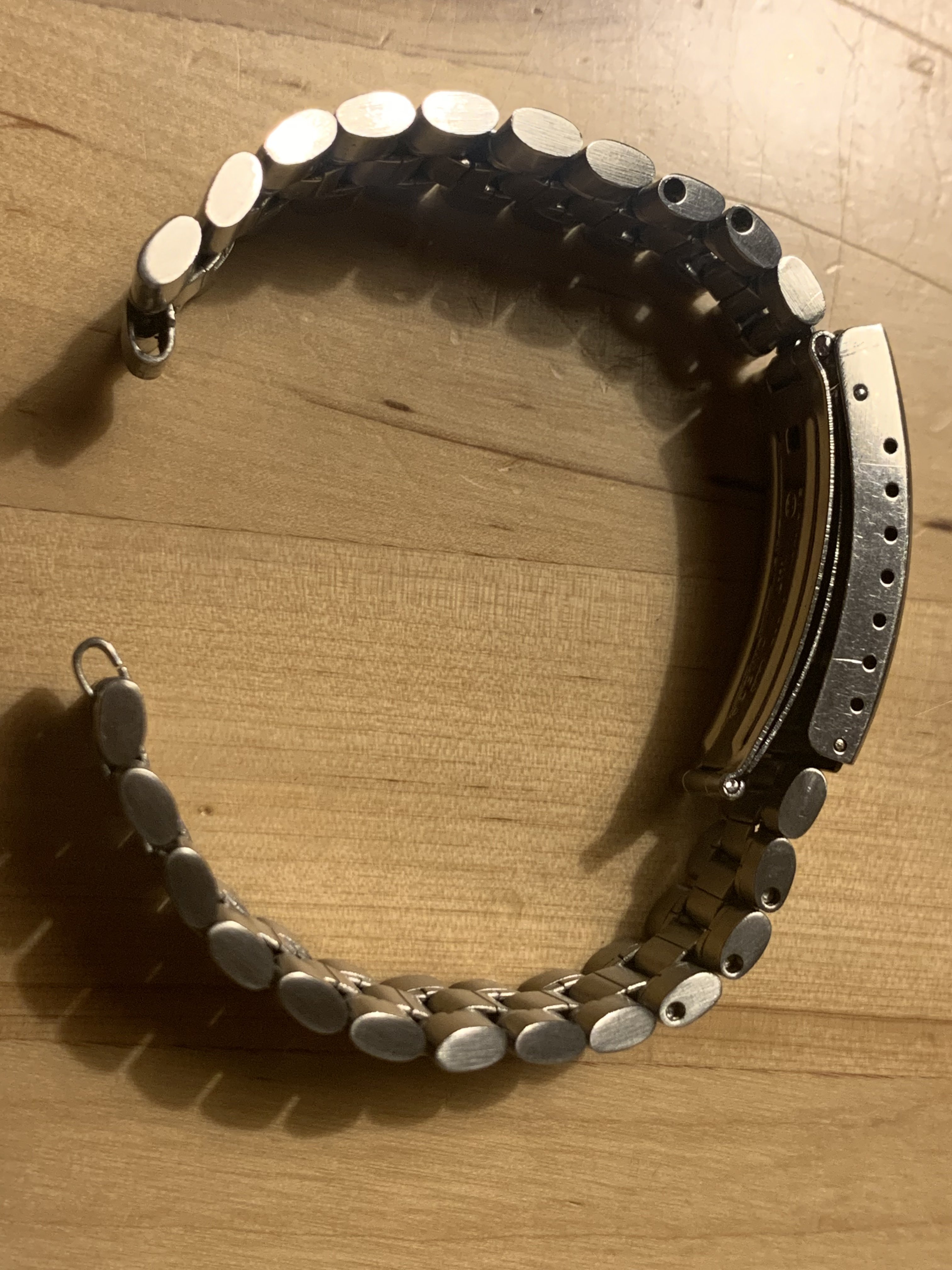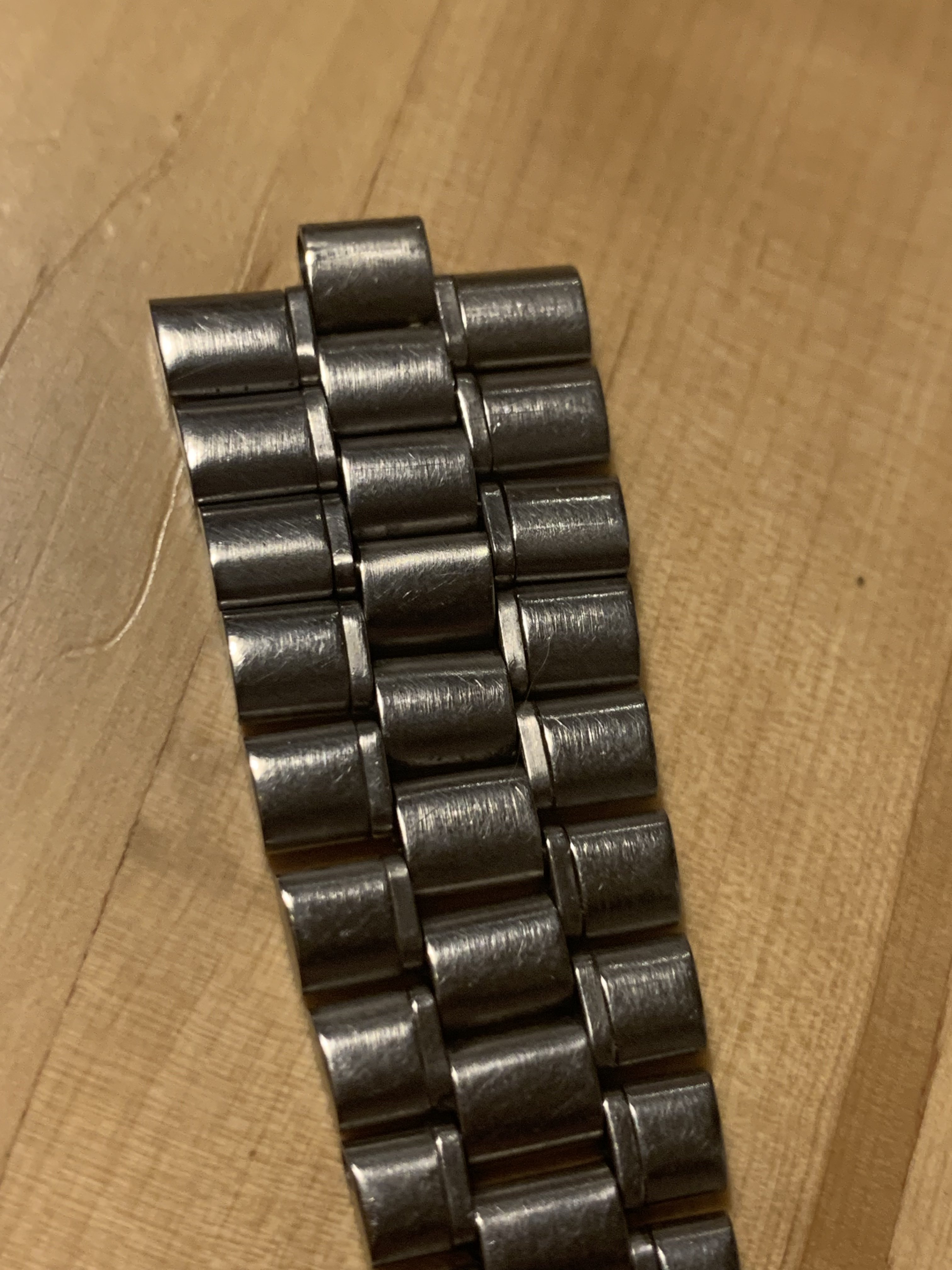 The bracelet has no major marks or dents, only a few fine scratches which could be easily polished. It has little stretch, did‘t get a polish from me and the clasp closes tight and firm. It has 23 links and a length of about 17,5 cm without end links.