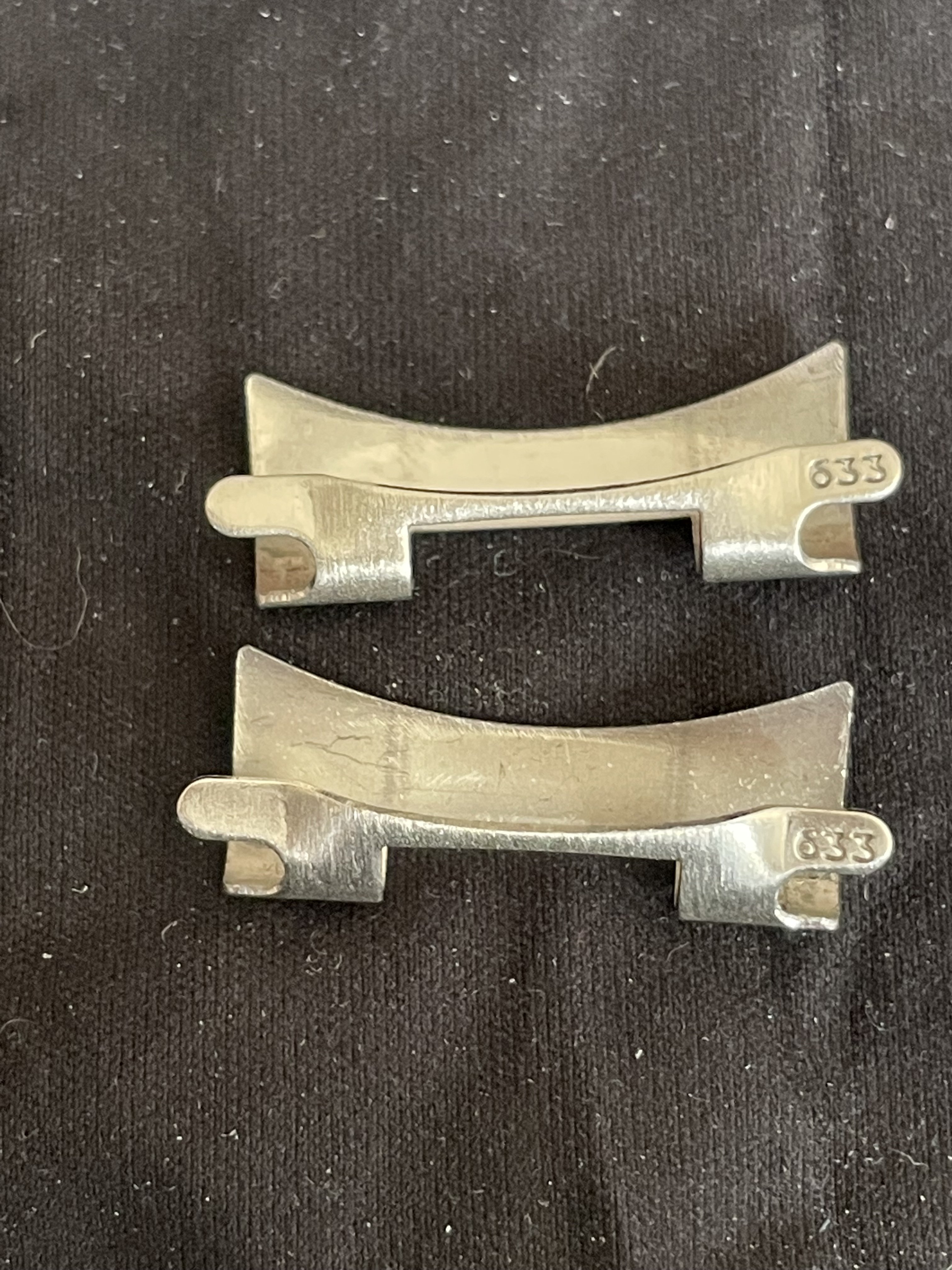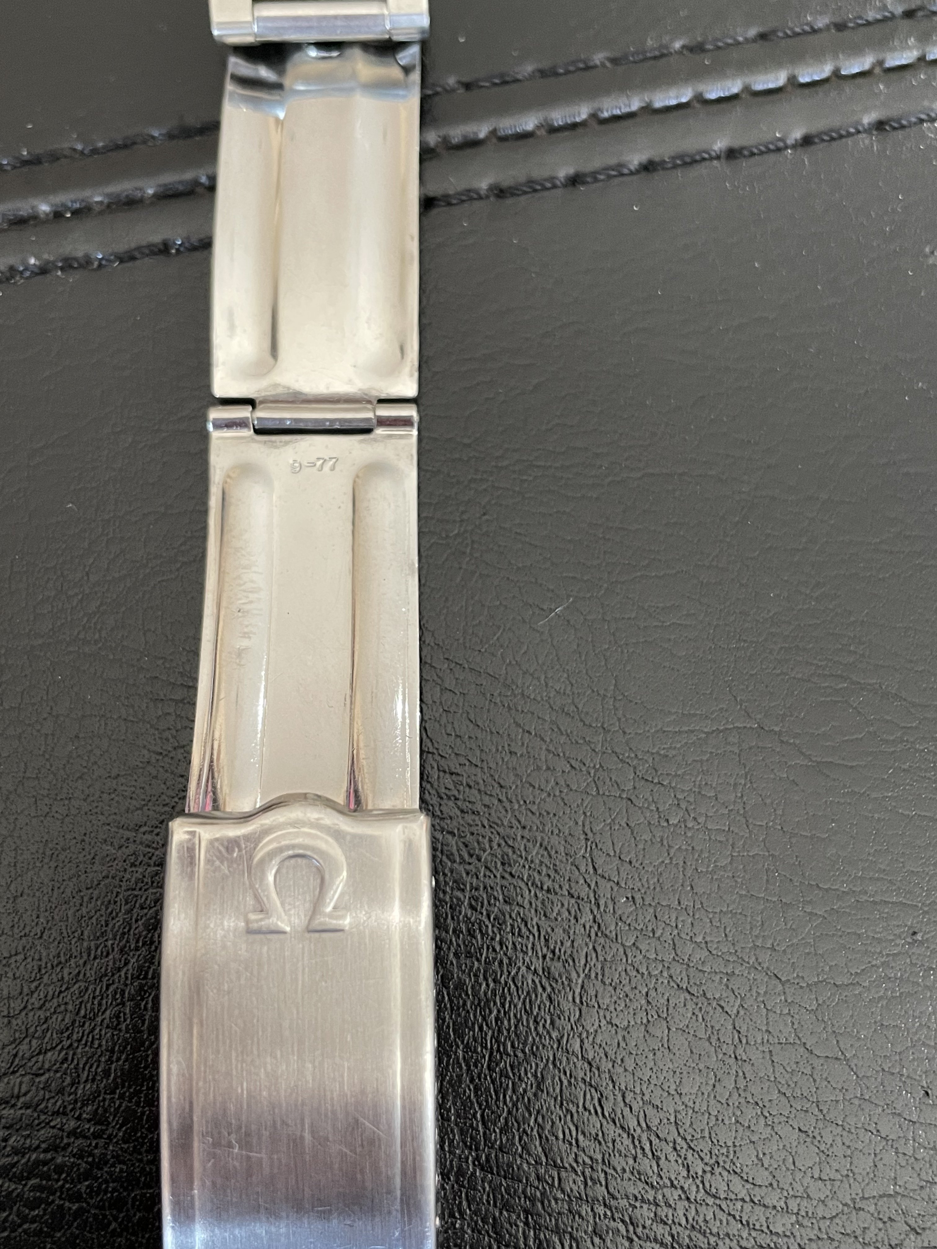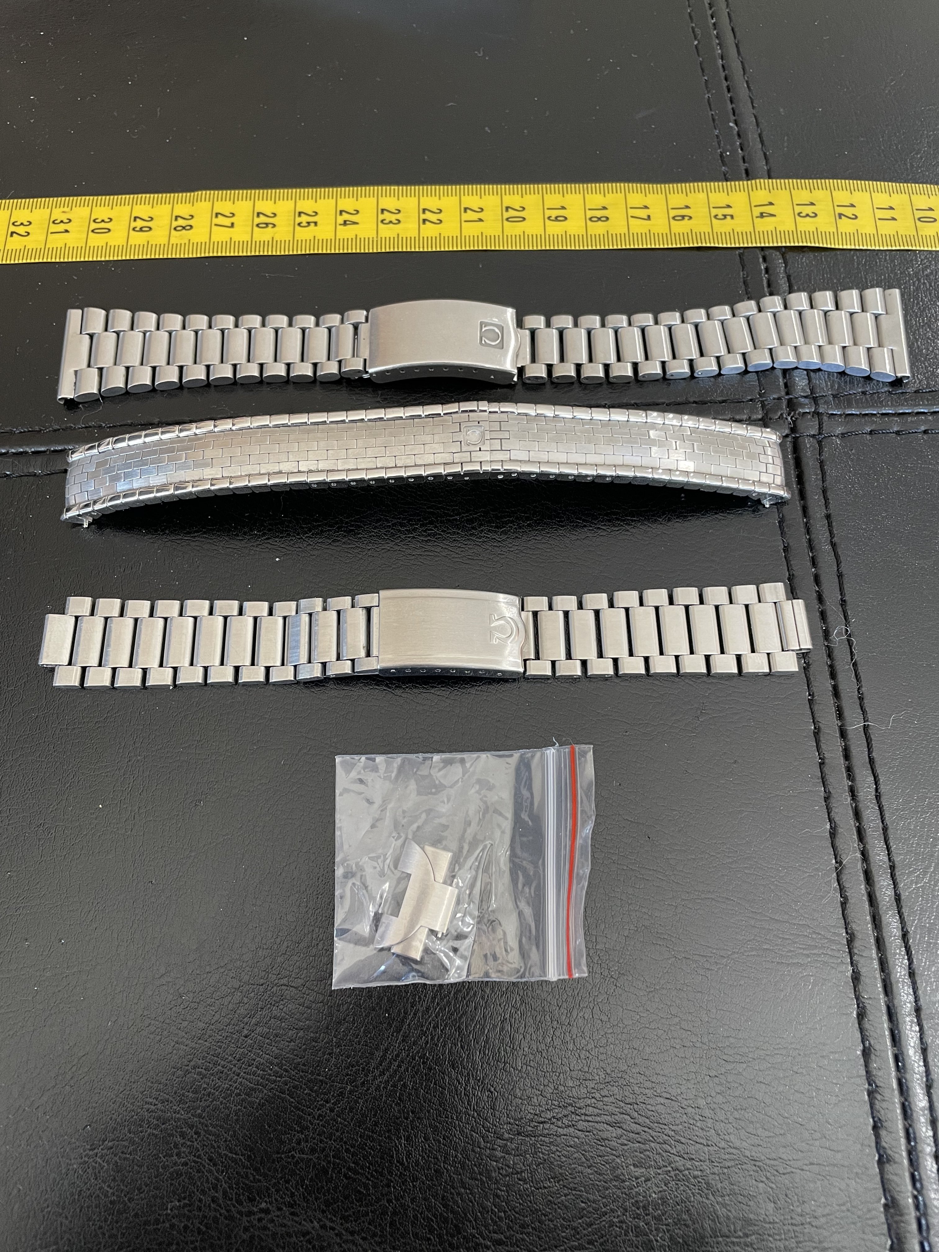 1. Omega 6600/945 armadillo/bricks bracelet. 16mm curved ends, sliding single fold clasp, used for a short period by Mrs. P on a deVille but considered too dressy. 16 cm length, 10 removable links. Asking $600 usd shipped.