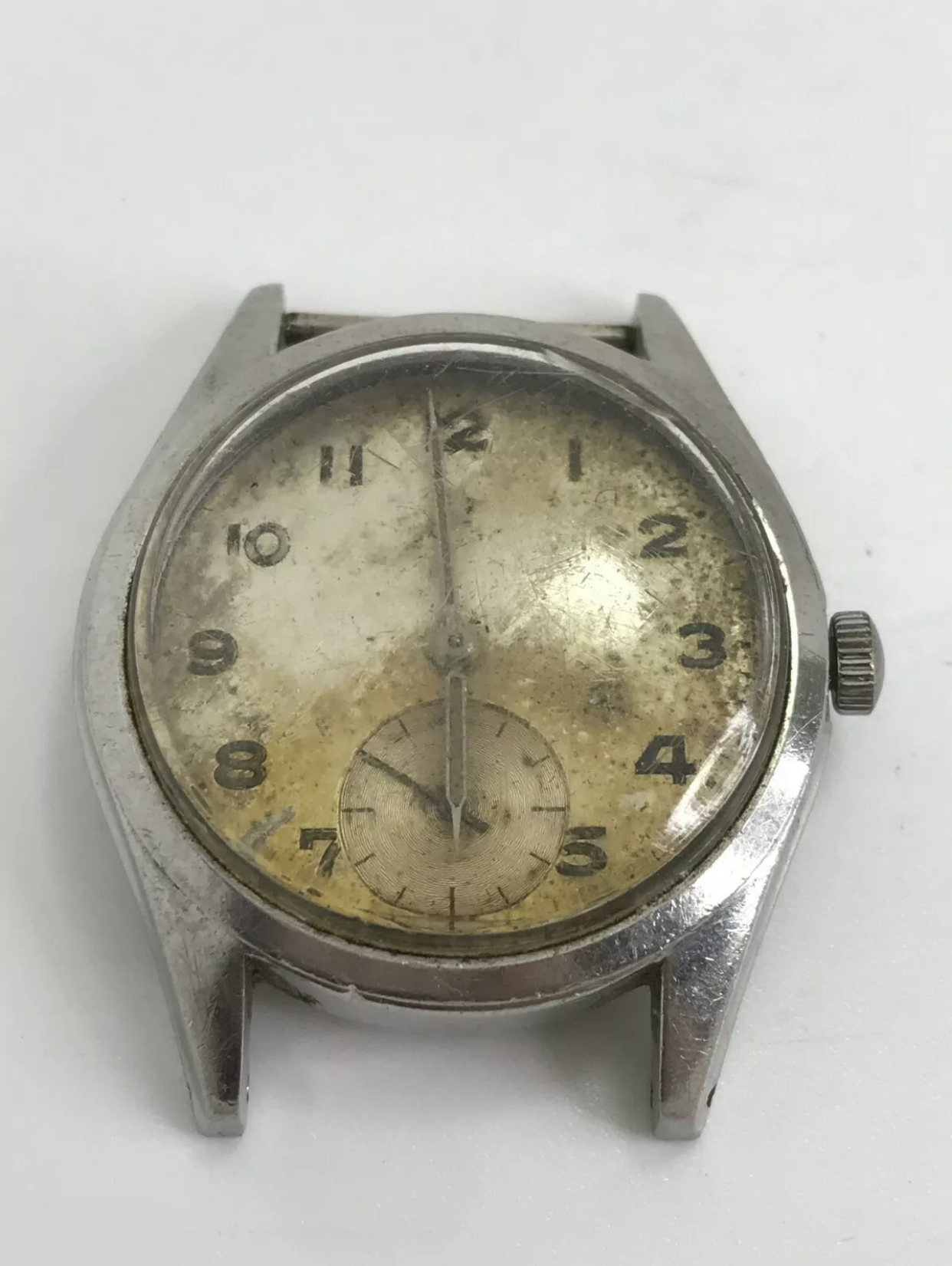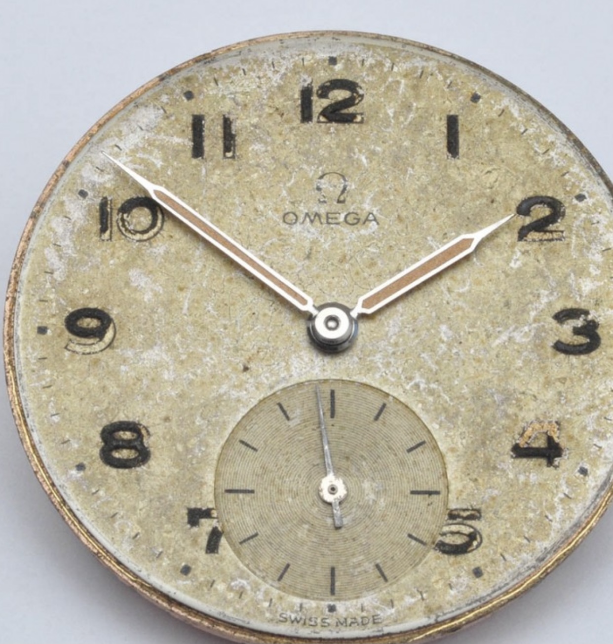 The second hand is original, but minute and hour hand need replacing. Syringe style, since the numerals are luminous, so should be the hands. Hole diameters is 1.40 and 0.75mm, length of the hands should be 15-16mm for the minute, 10-11mm for the hour hand if I'm not mistaken. I'm open for both steel and gold.