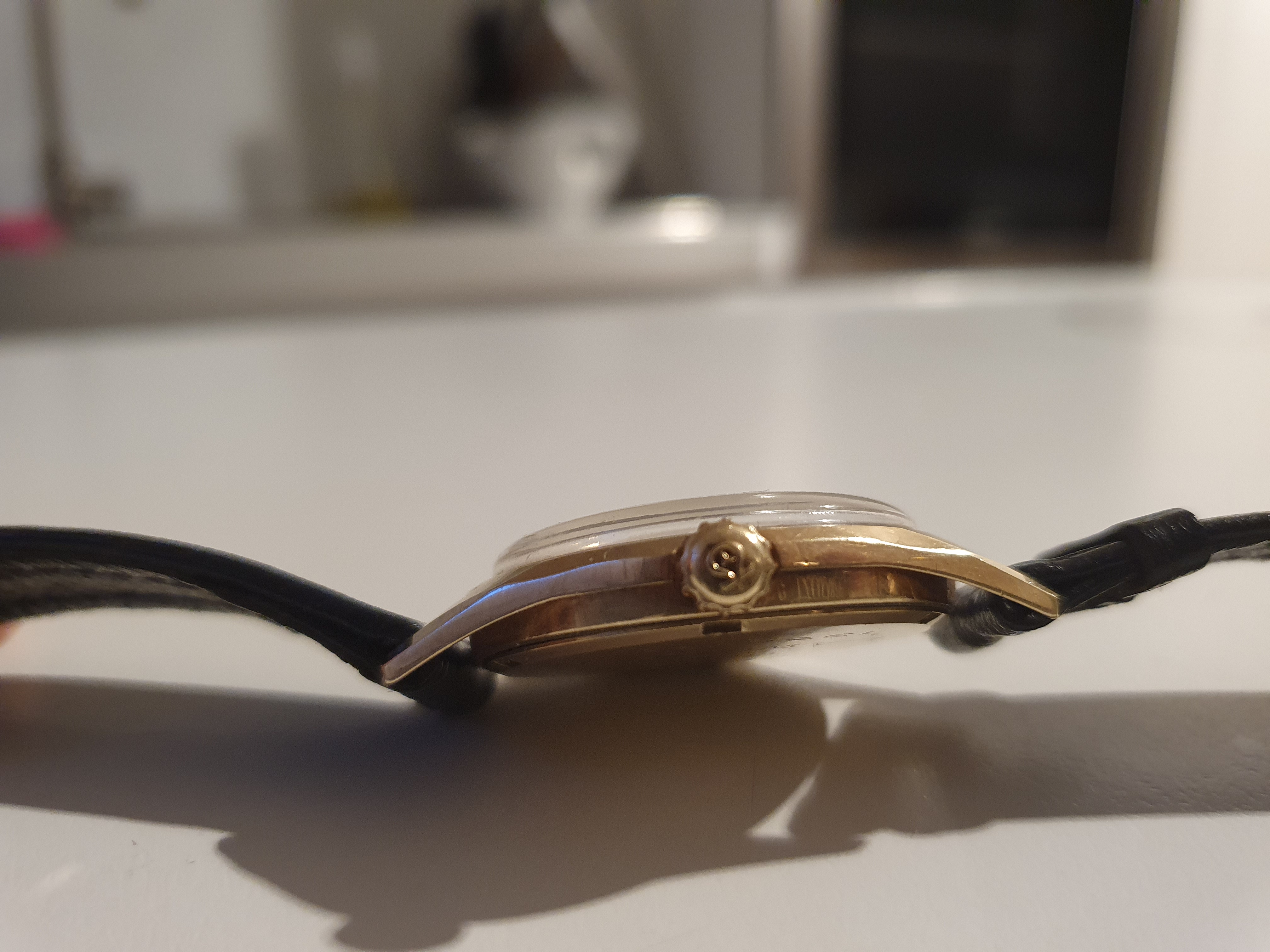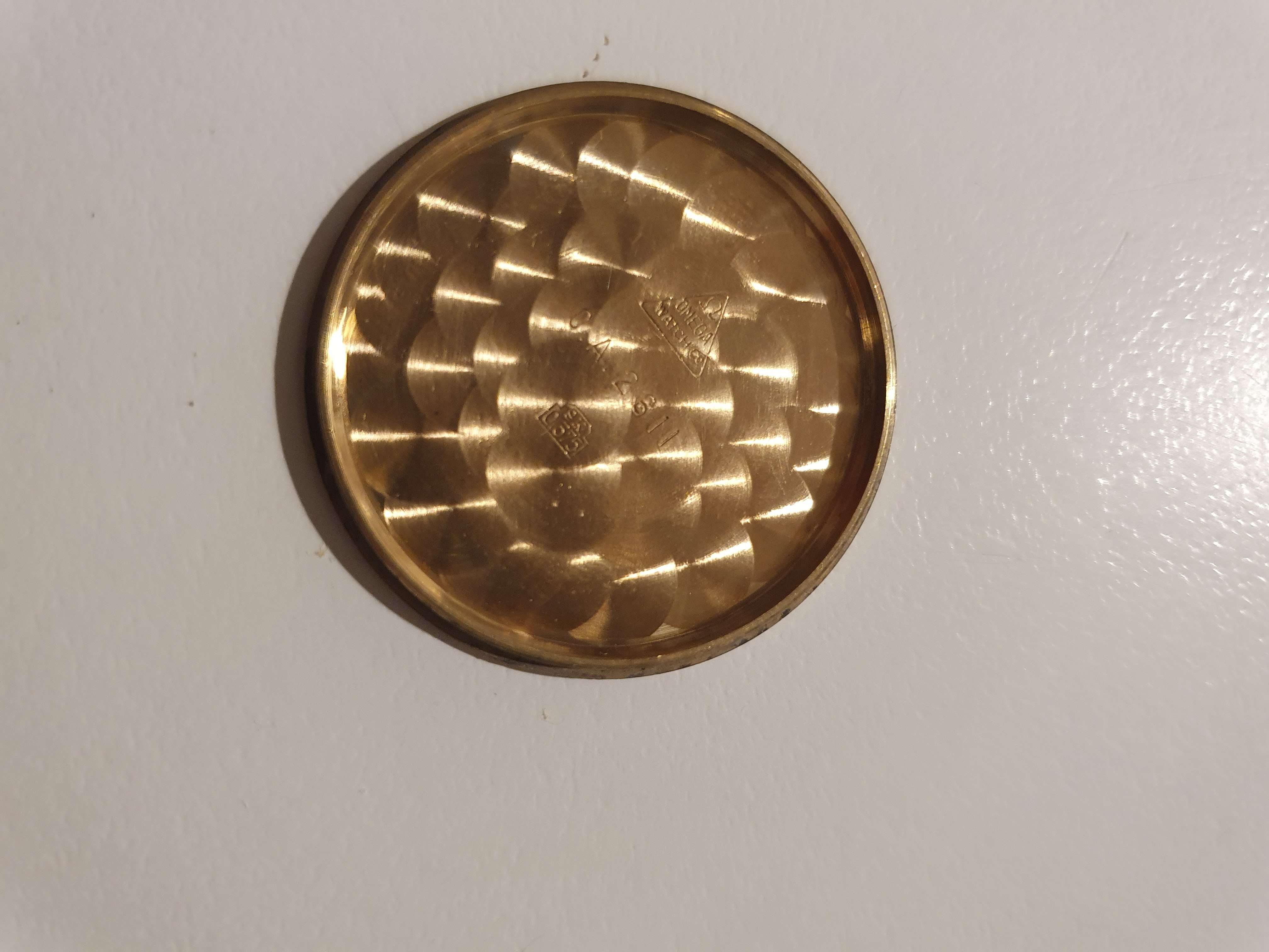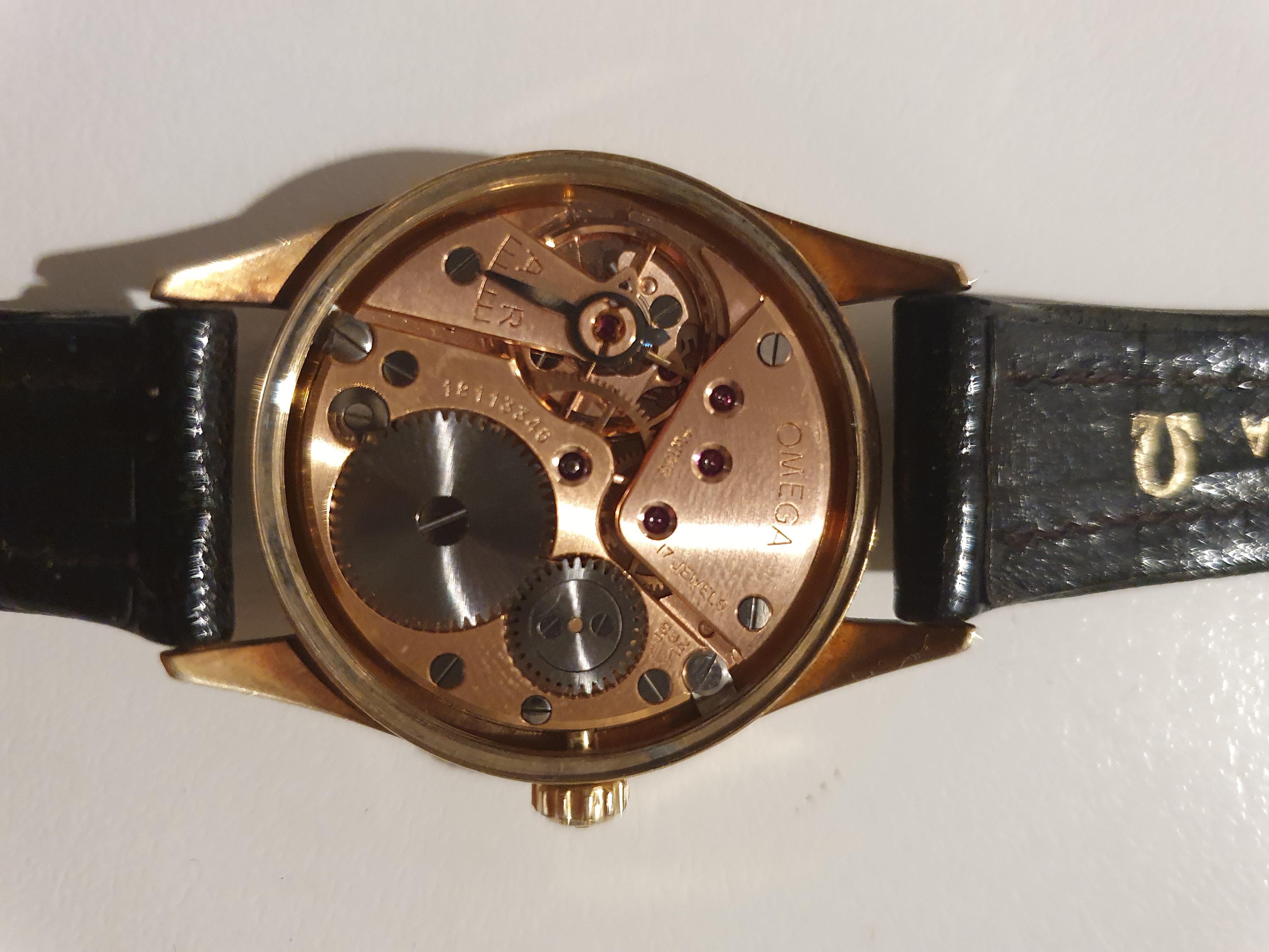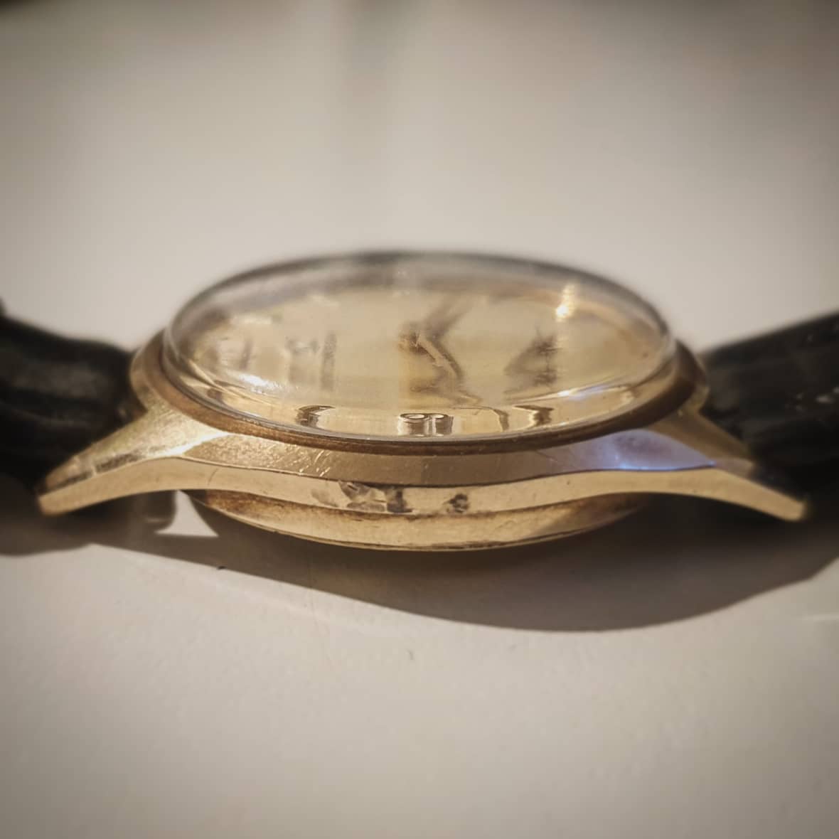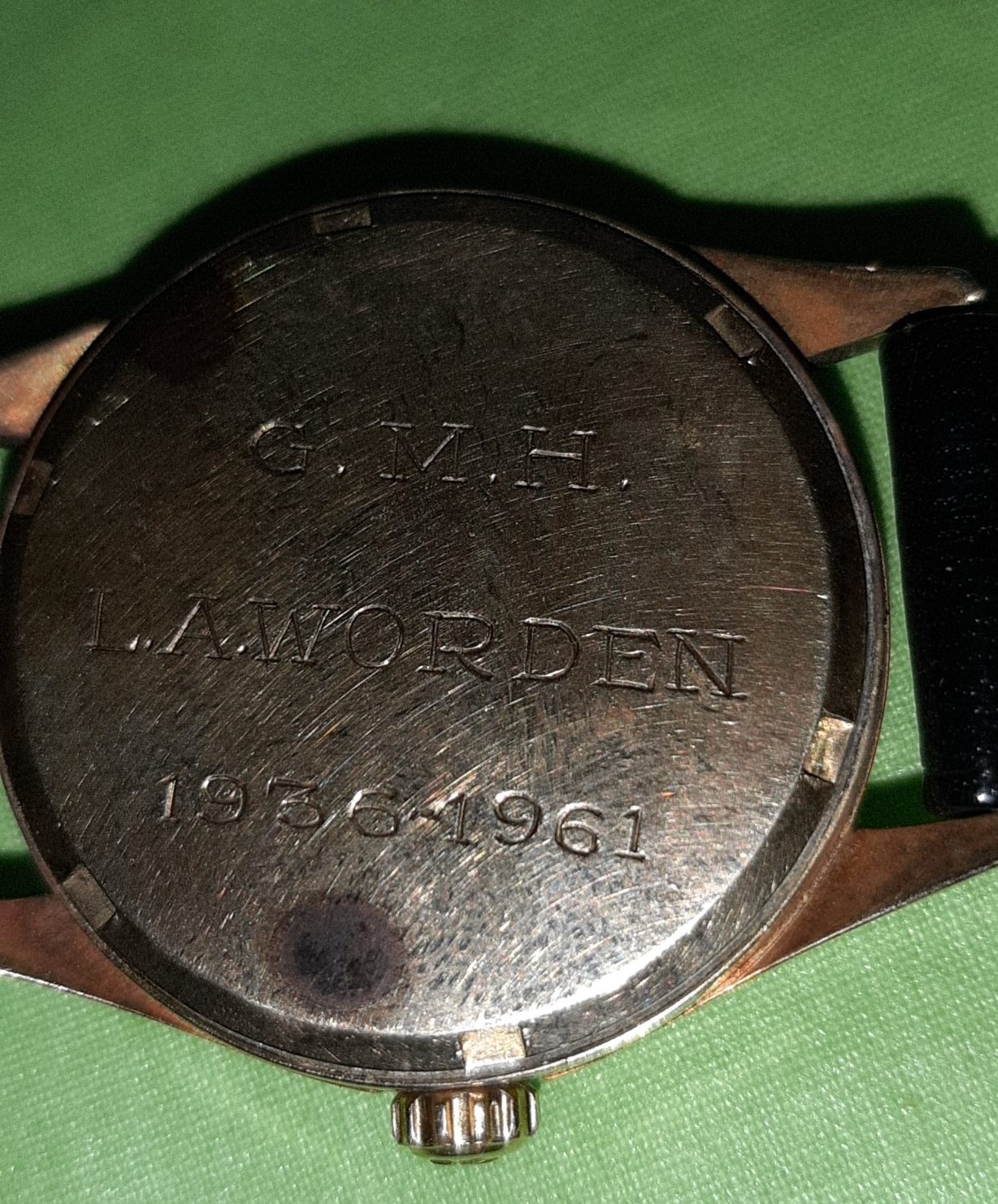The watch seems original at first, it comes in a 9k gold case, with original strap and gold bucle, box, Naiad crown, signed crystal ... the works. The caseback is engraved with G.M.H. Laworden 1936-1961.