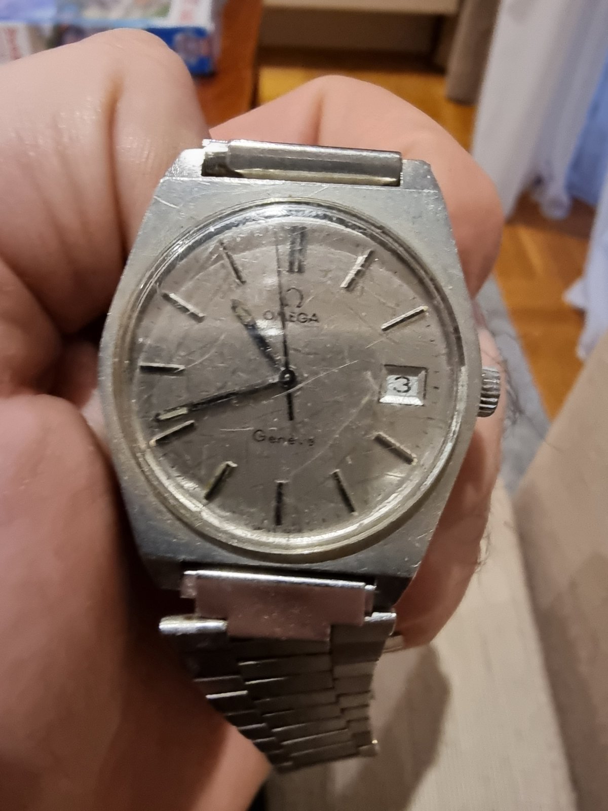 looks like ref 136.0049 in stainless steel, Geneve hand winding cal 613, serial number dates to 1972, need clear photo of inside of caseback to know for sure. Case is quite beat up and scarred but probably not polished, which is a good thing. Movement doesnt look terrible, some discoloration around periphery but may be reflection. Crystal probably too far gone for polishing- would replace crystal and service the watch- may clean up nicely and be a nice daily wearer, nice 70's lines. Do you already own the watch? Here are a couple of photos from ebay listings (not mine) to show how it may clean up and asking prices. For idea of its actual worth do ebay advanced search on SOLD watches, not listings as asking prices are just that. If you own the watch and have it cleaned up (est cost service with crystal replacement maybe $200-250) please post the "after" photos