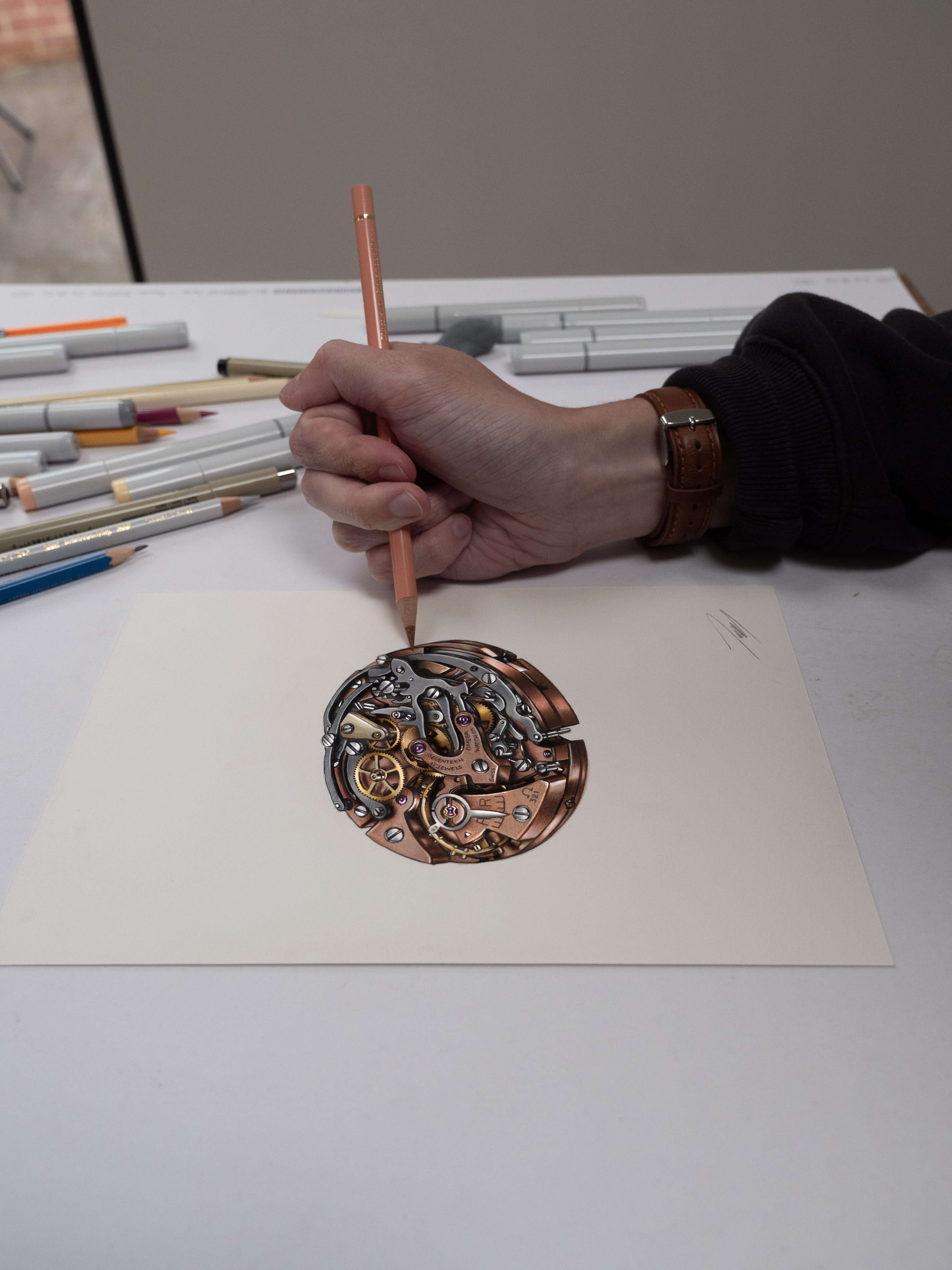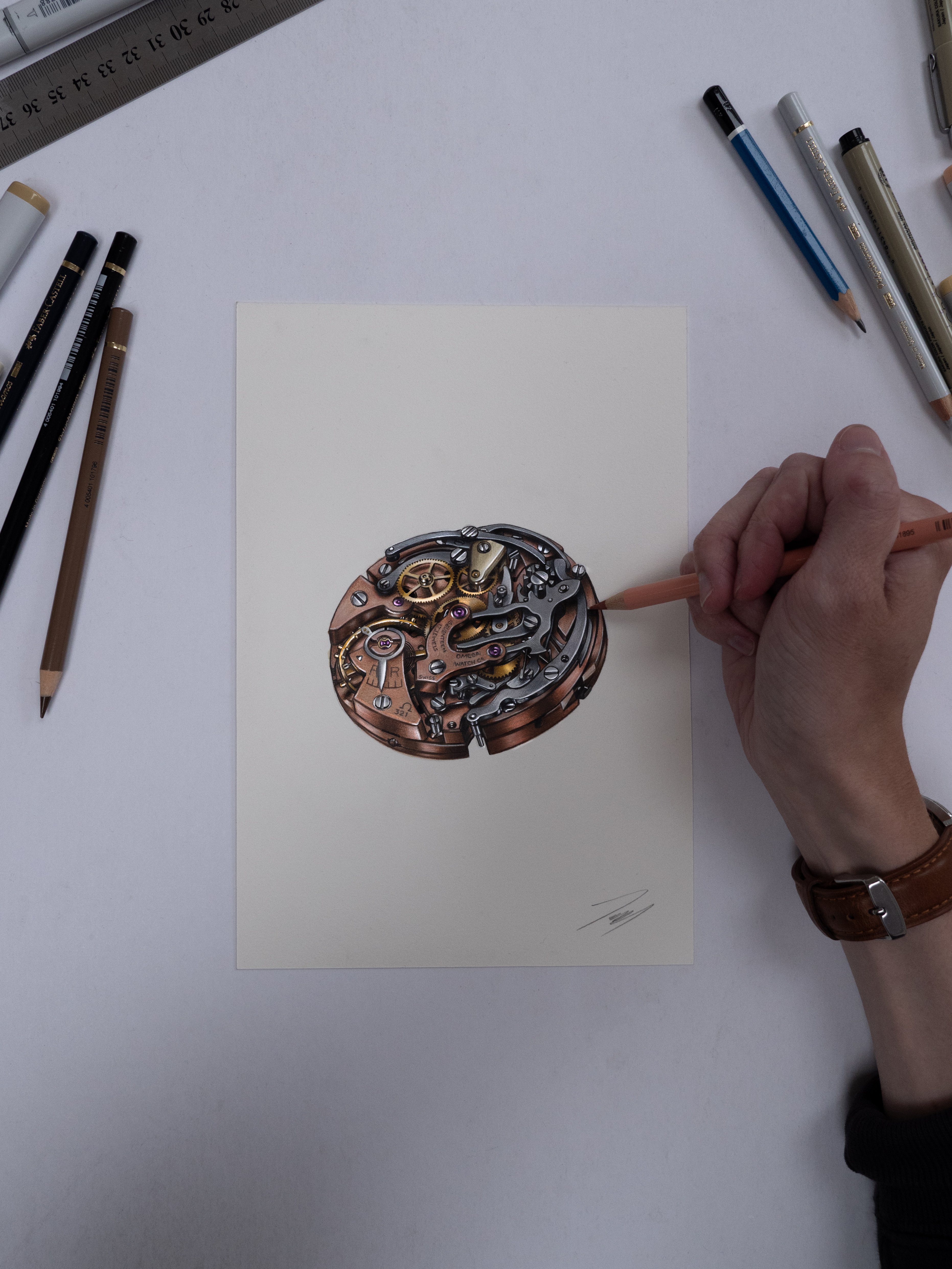 ·A recently completed illustration of the Omega Calibre 321! Much smaller than my last one at 13.3 x 13.3 inches this one only comes in at 5.8 x 8.3'' and the drawing itself is half the size of my iPhone which I'm pretty happy with!