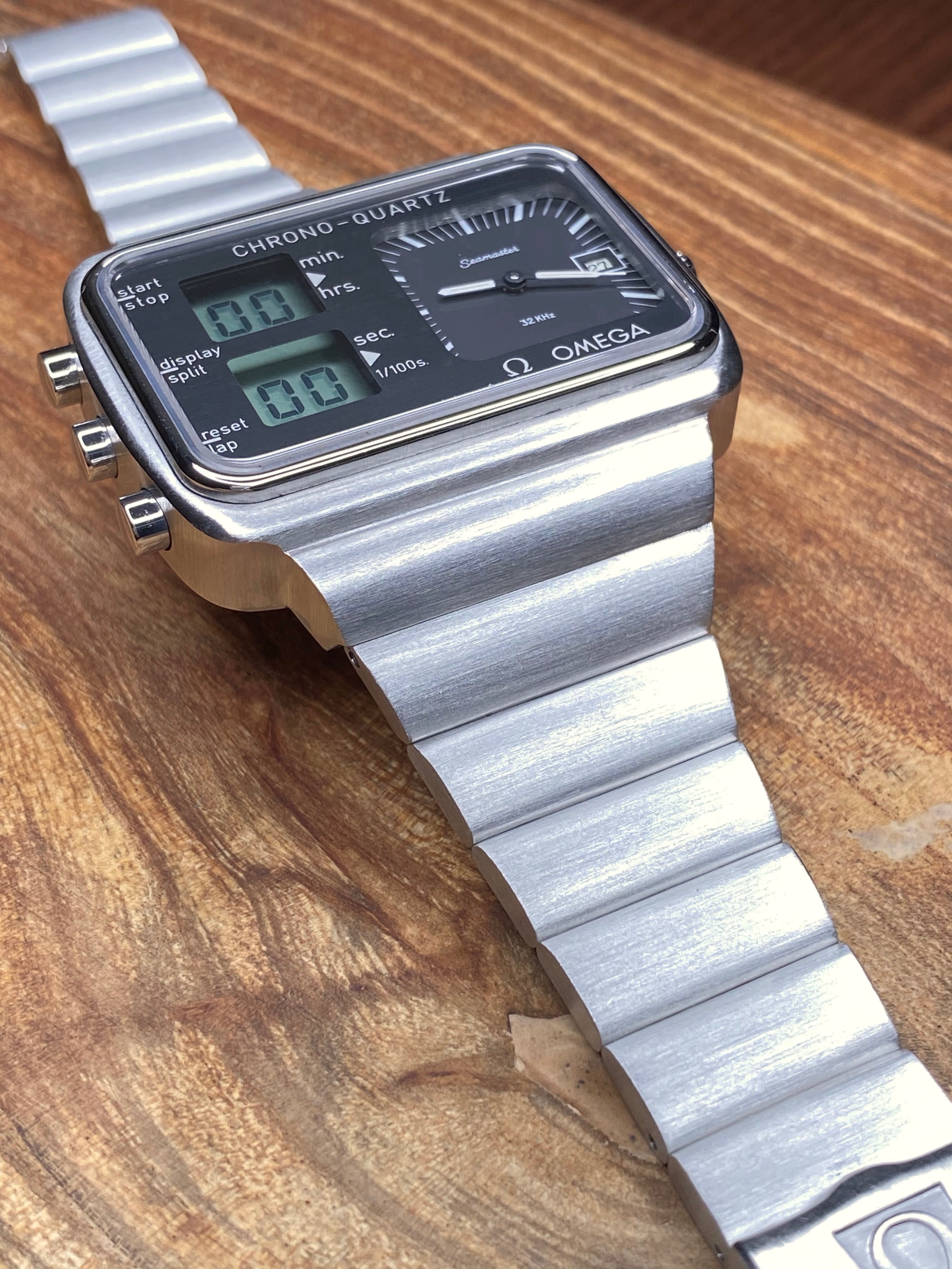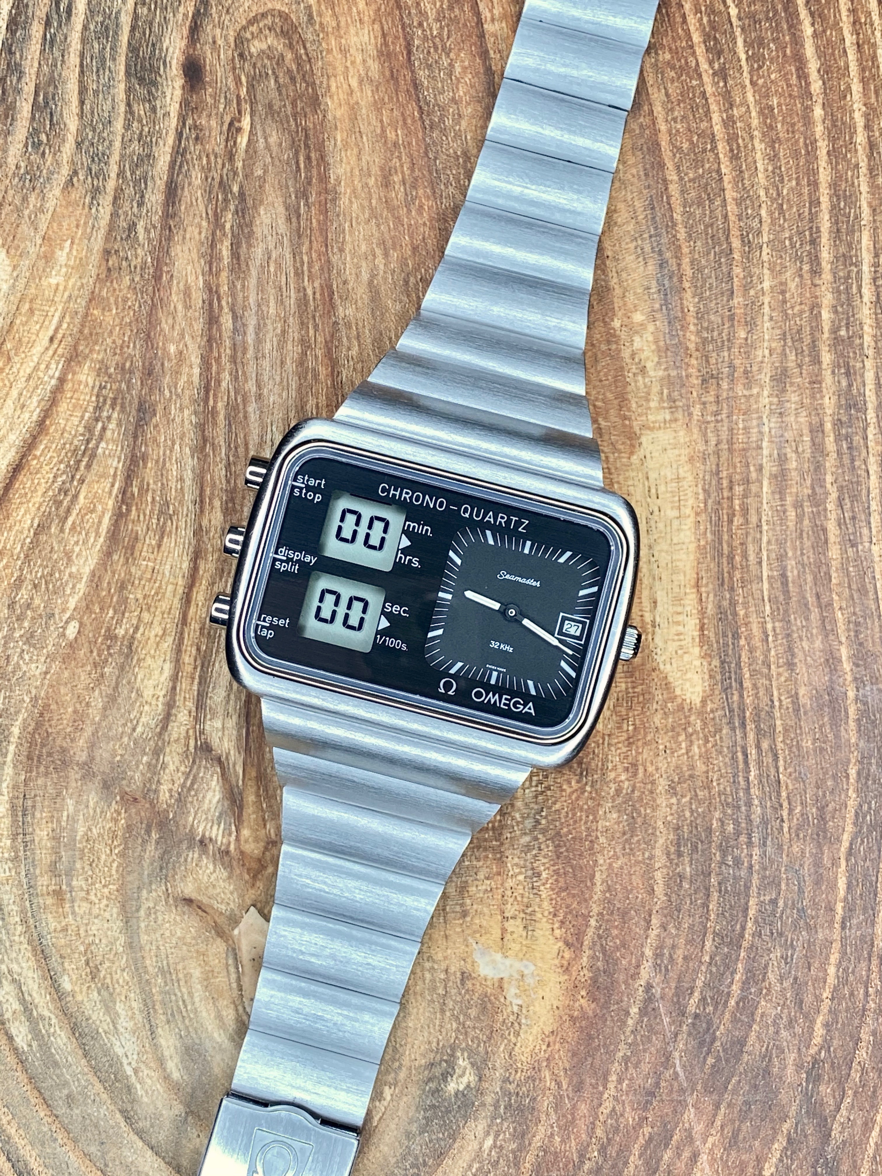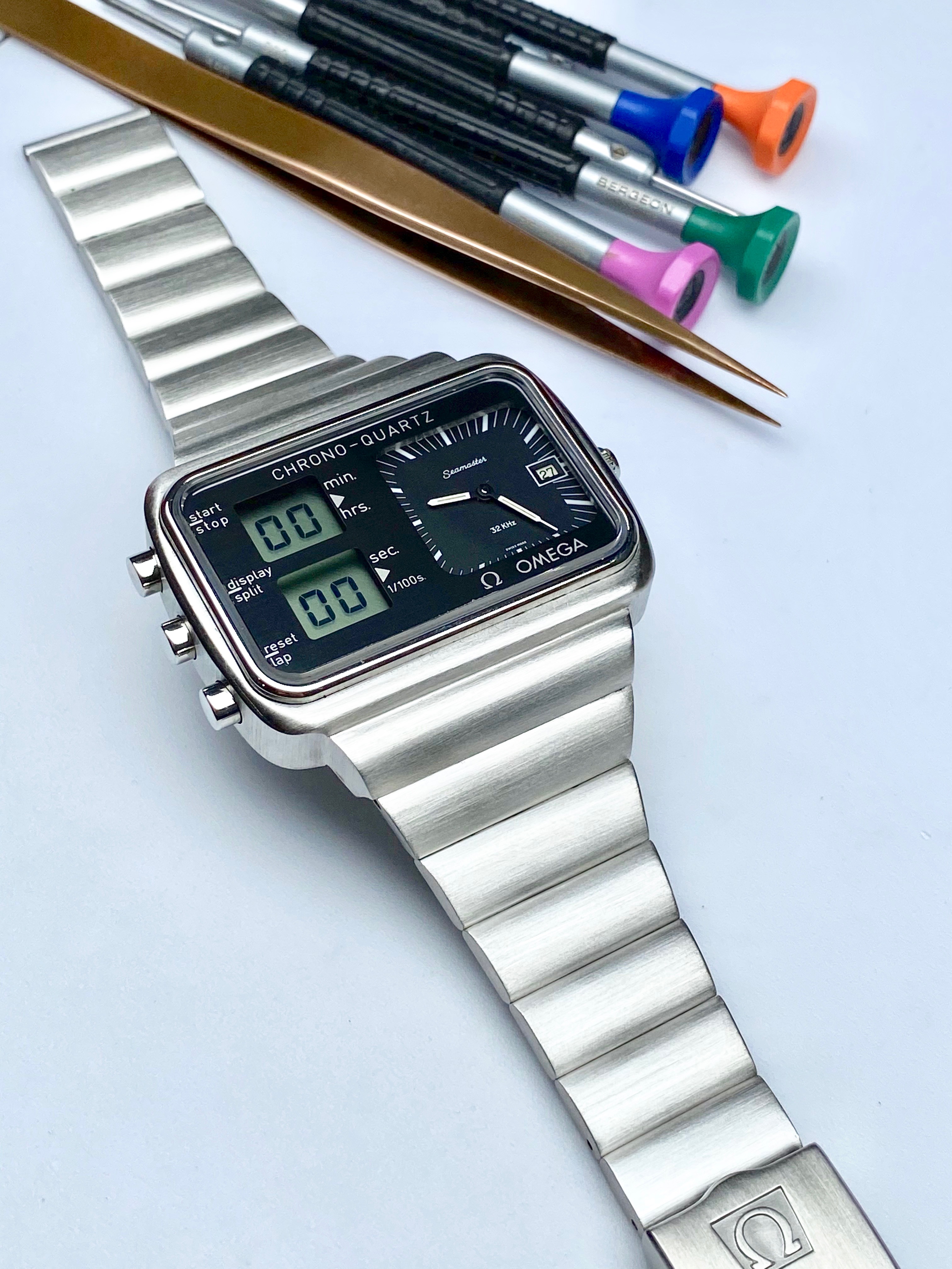 The Chronoquartz has been fully rebuilt inside and out and is as new as it is possible to make one of these at present. The circuitry in its entirety has been replaced which includes the LCD screen. A full case kit has been fitted too so all seals are fresh and the crown operates as it should. The black LCD 'mask' under the crystal was also replaced with a new one. Everything is functioning as expected. All of the case parts that were replaced are included bagged up with the sale. A pressure test has been completed and it passed no problem. All of the parts used in the overhaul were new and genuine Omega, nothing was NOS or taken from another watch.