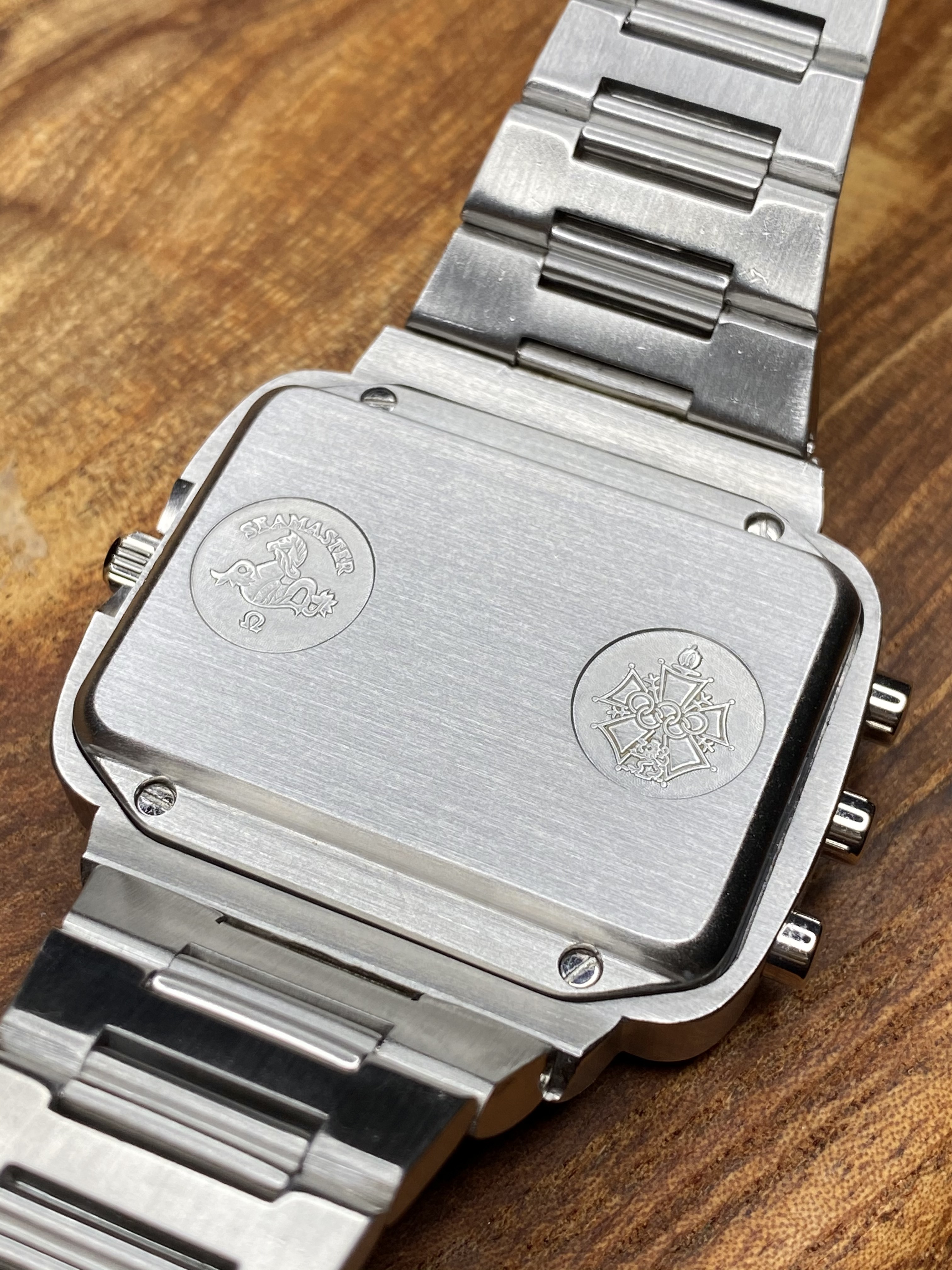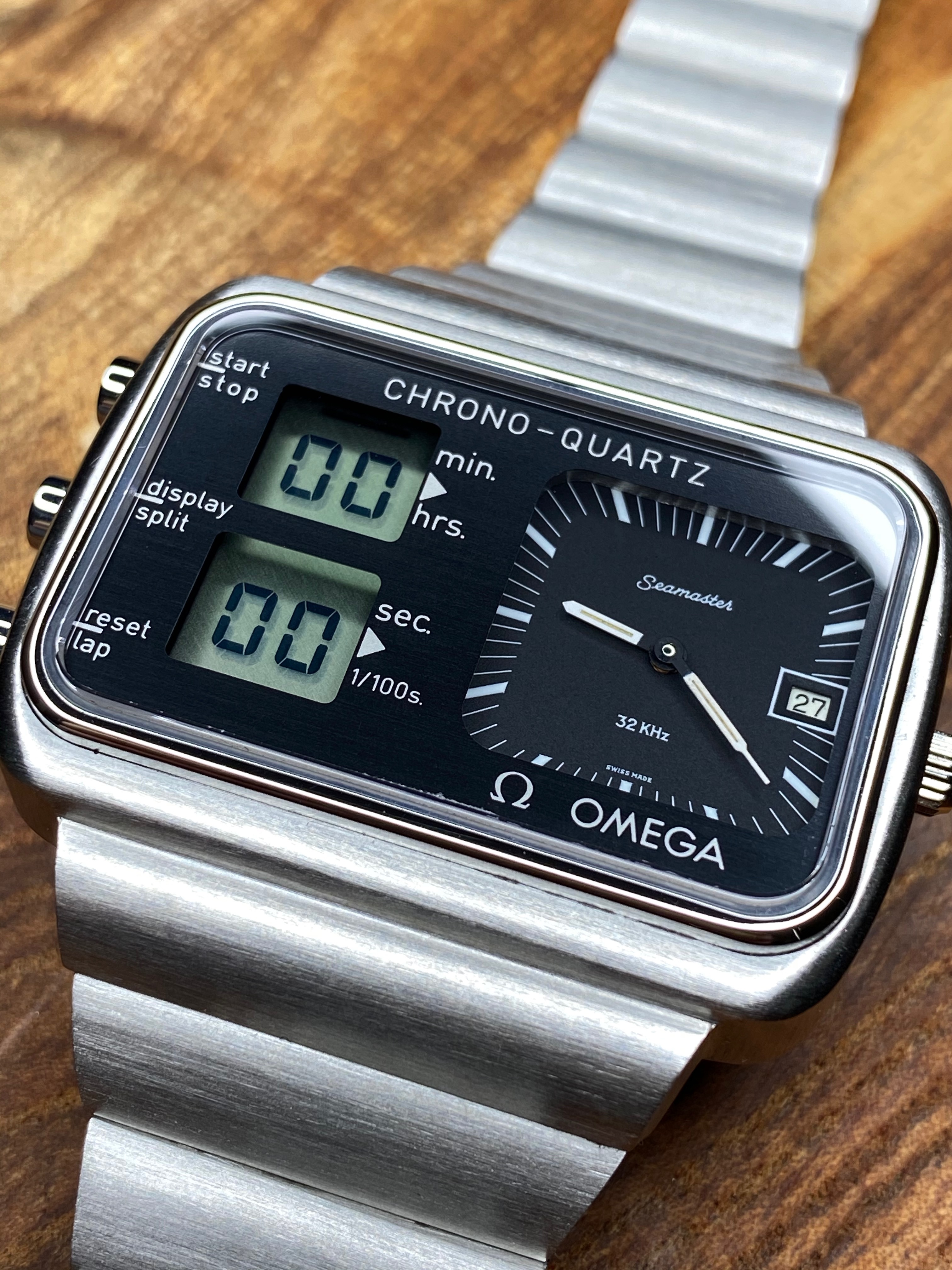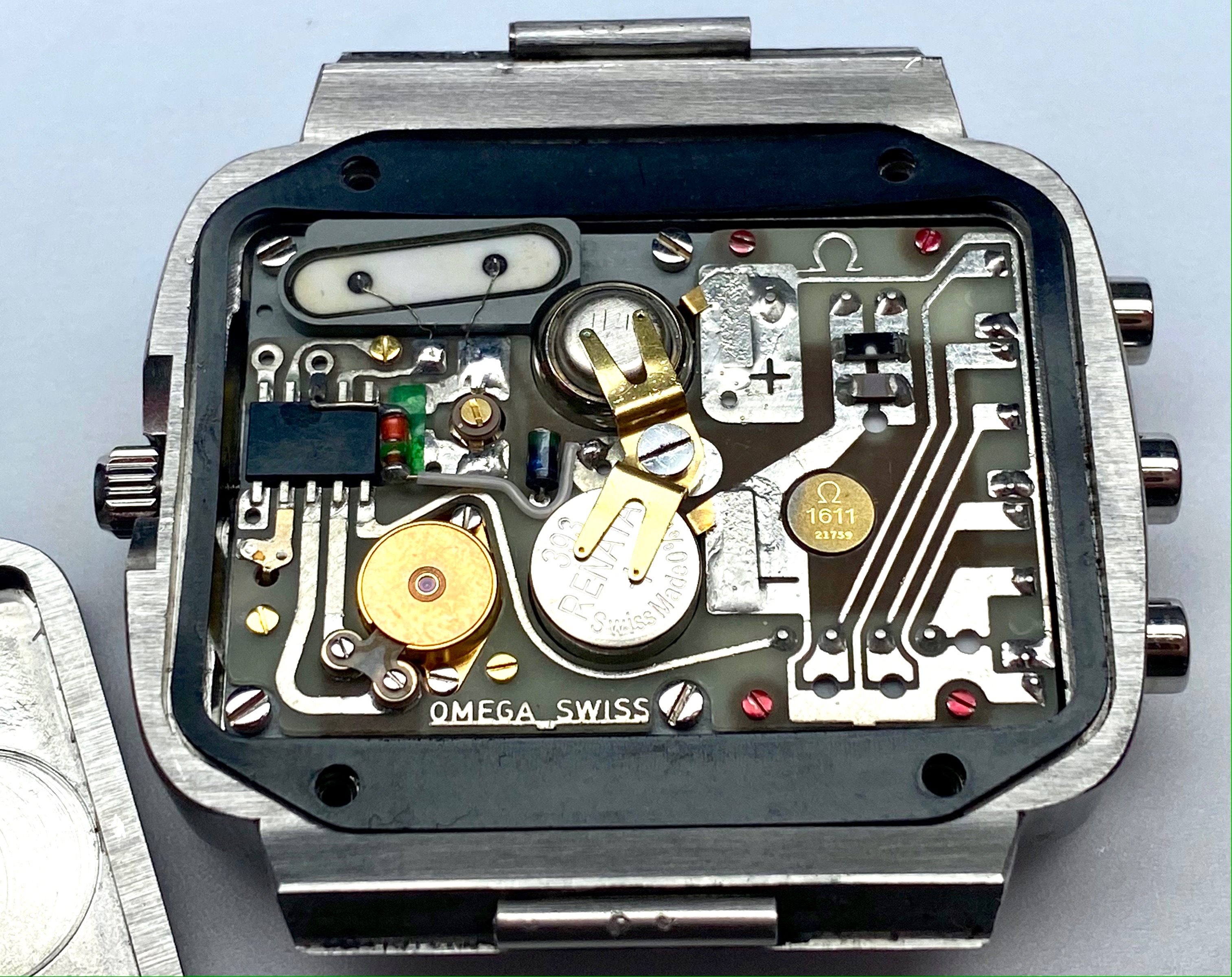 The Chronoquartz has been fully rebuilt inside and out and is as new as it is possible to make one of these at present. The circuitry in its entirety has been replaced which includes the LCD screen. A full case kit has been fitted too so all seals are fresh and the crown operates as it should. The black LCD 'mask' under the crystal was also replaced with a new one. Everything is functioning as expected. All of the case parts that were replaced are included bagged up with the sale. A pressure test has been completed and it passed no problem. All of the parts used in the overhaul were new and genuine Omega, nothing was NOS or taken from another watch.