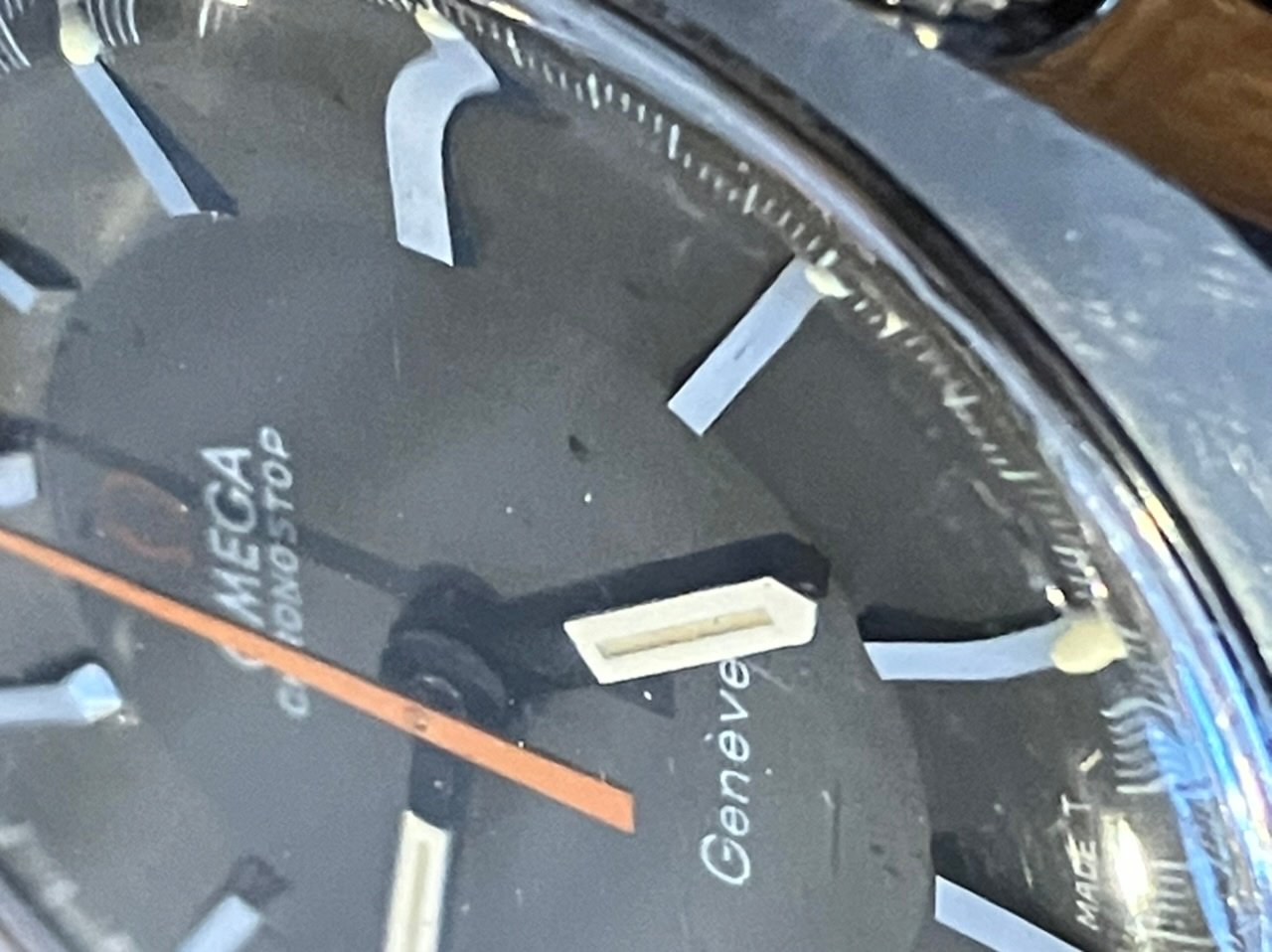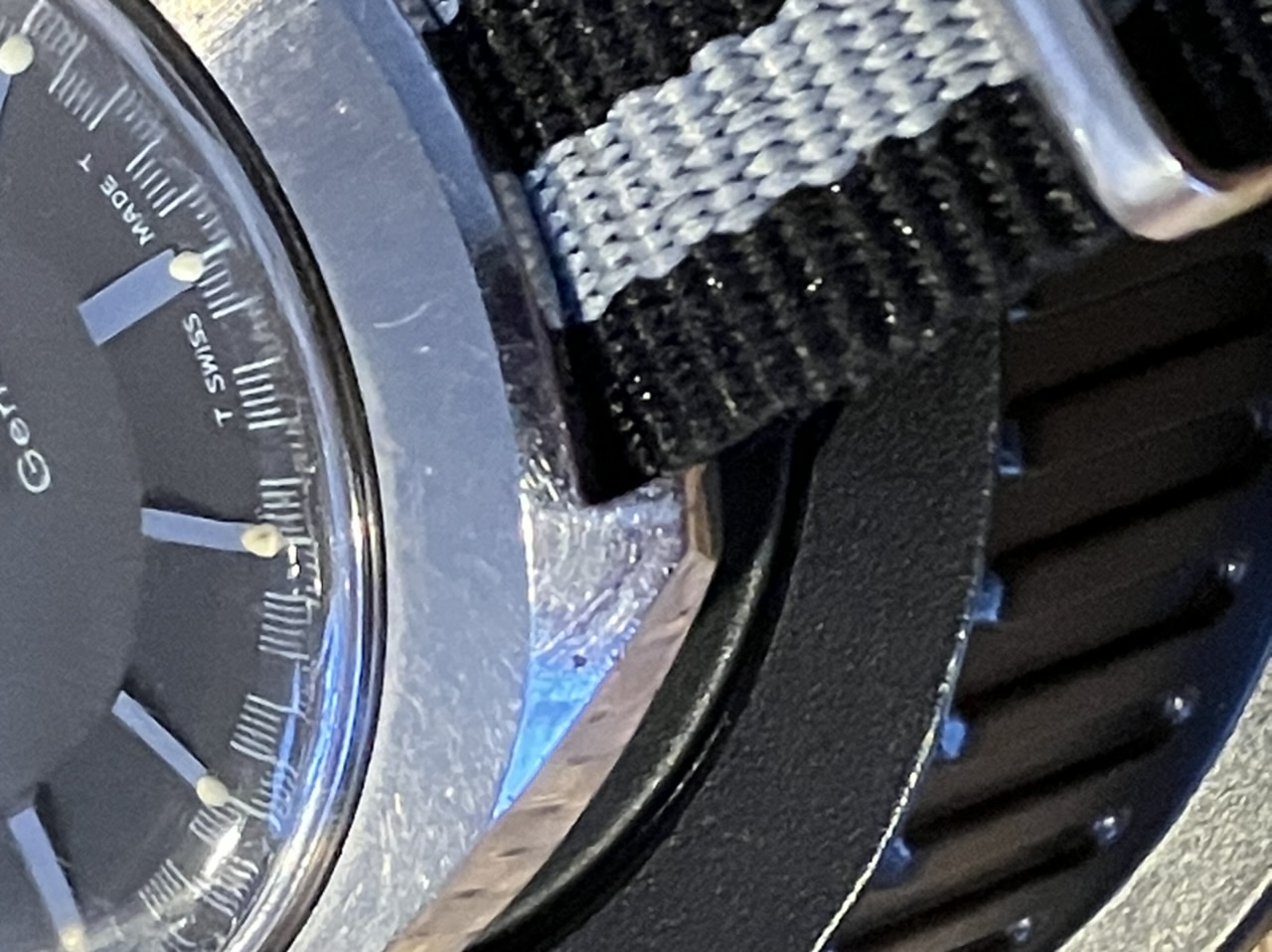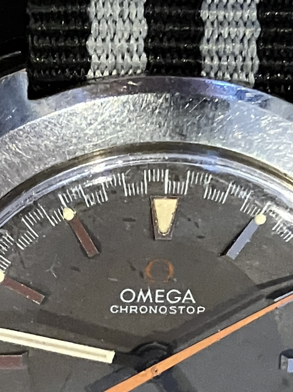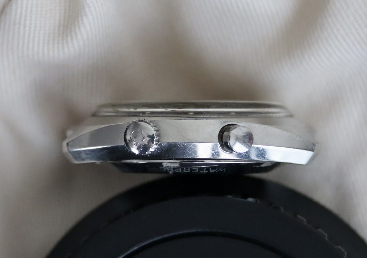 I have not serviced this watch and it seems to have never been in the shop. I replaced the gasket, which was shot. It keeps great time and looks pretty clean inside, but 54 years is a long time to go without a trip to the watchmaker. The case is unpolished with clearly evident radial brushing, along with signs of honest wear. I’ve tried to document the dings, though I can’t see them at all without the help of a loupe or camera. The white flecks visible in the photos are on the crystal; there’s also a speck of black schmutz on the underside of the crystal just north of the 4 that I’ve tried to capture in a photo. This might have come from the slightly shrunken triangular 12 lume marker, which is normally hidden behind the timer hand.
