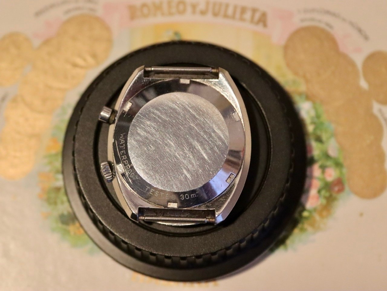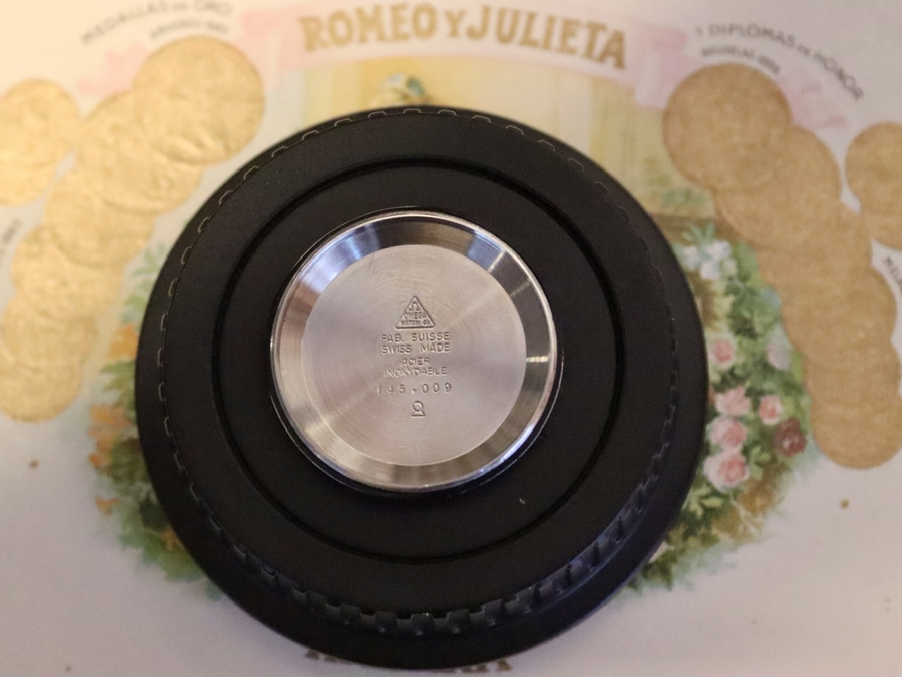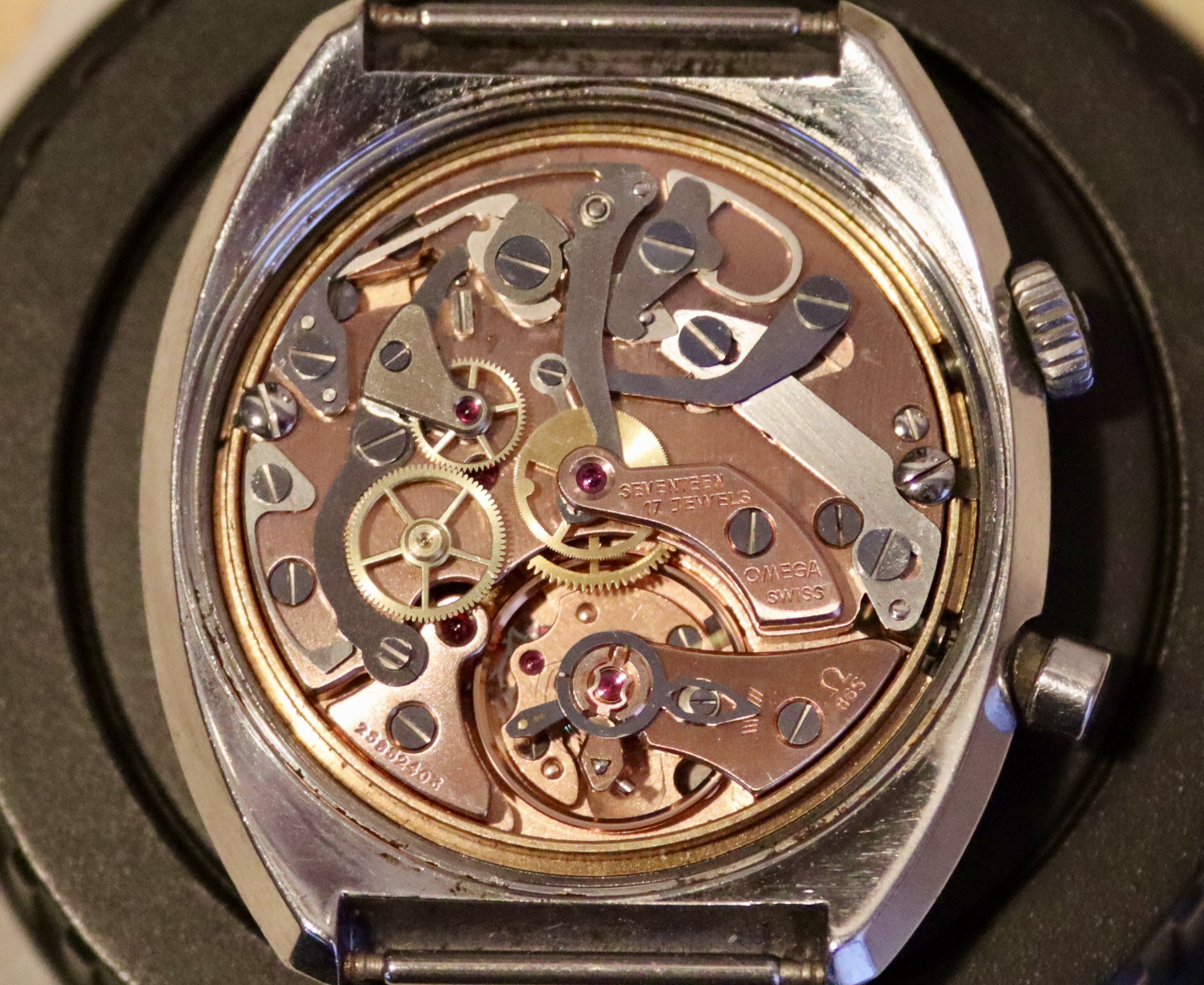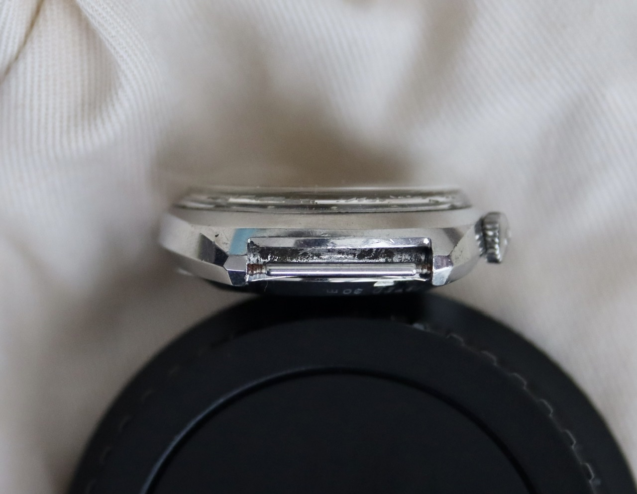 I have not serviced this watch and it seems to have never been in the shop. I replaced the gasket, which was shot. It keeps great time and looks pretty clean inside, but 54 years is a long time to go without a trip to the watchmaker. The case is unpolished with clearly evident radial brushing, along with signs of honest wear. I’ve tried to document the dings, though I can’t see them at all without the help of a loupe or camera. The white flecks visible in the photos are on the crystal; there’s also a speck of black schmutz on the underside of the crystal just north of the 4 that I’ve tried to capture in a photo. This might have come from the slightly shrunken triangular 12 lume marker, which is normally hidden behind the timer hand.
