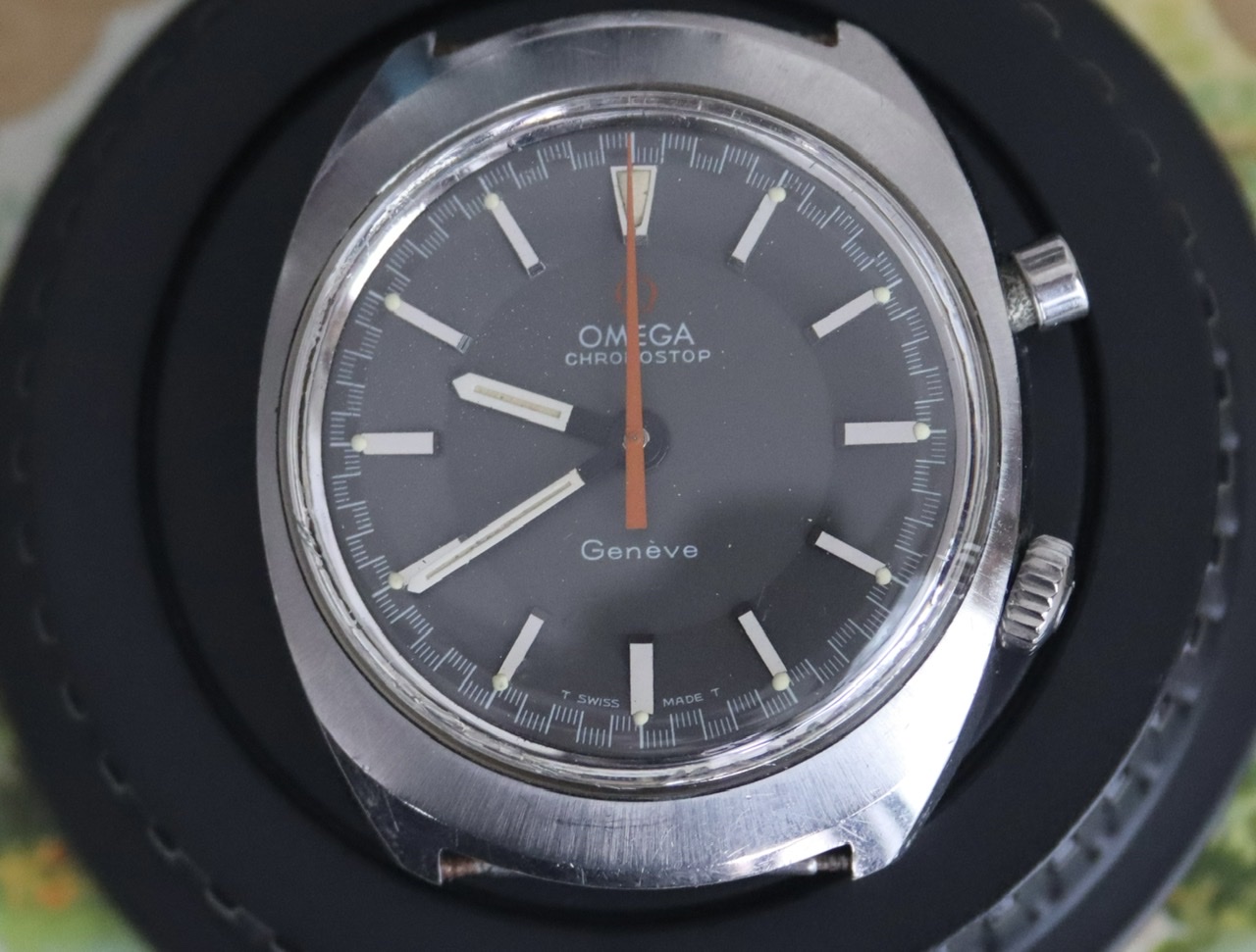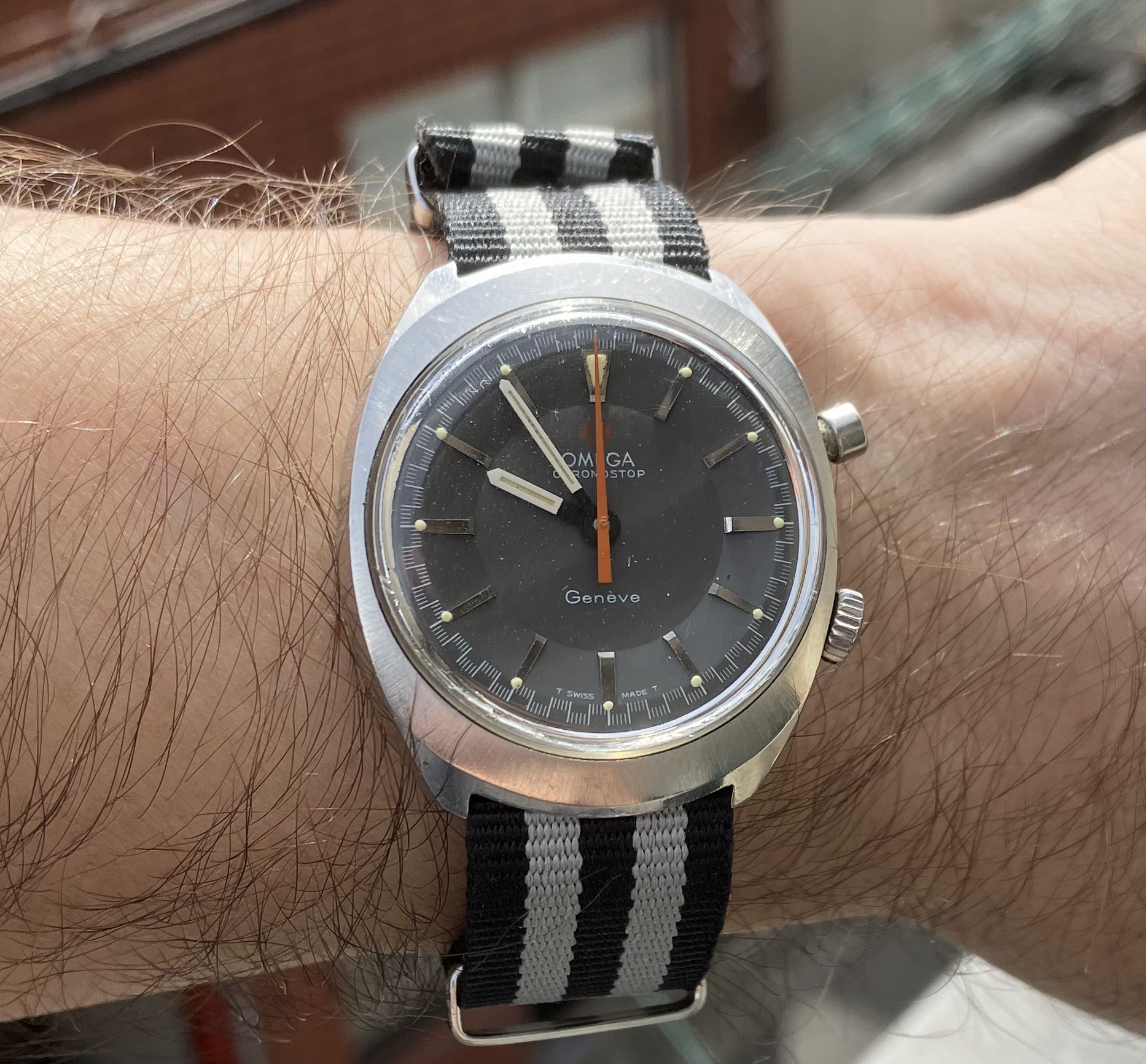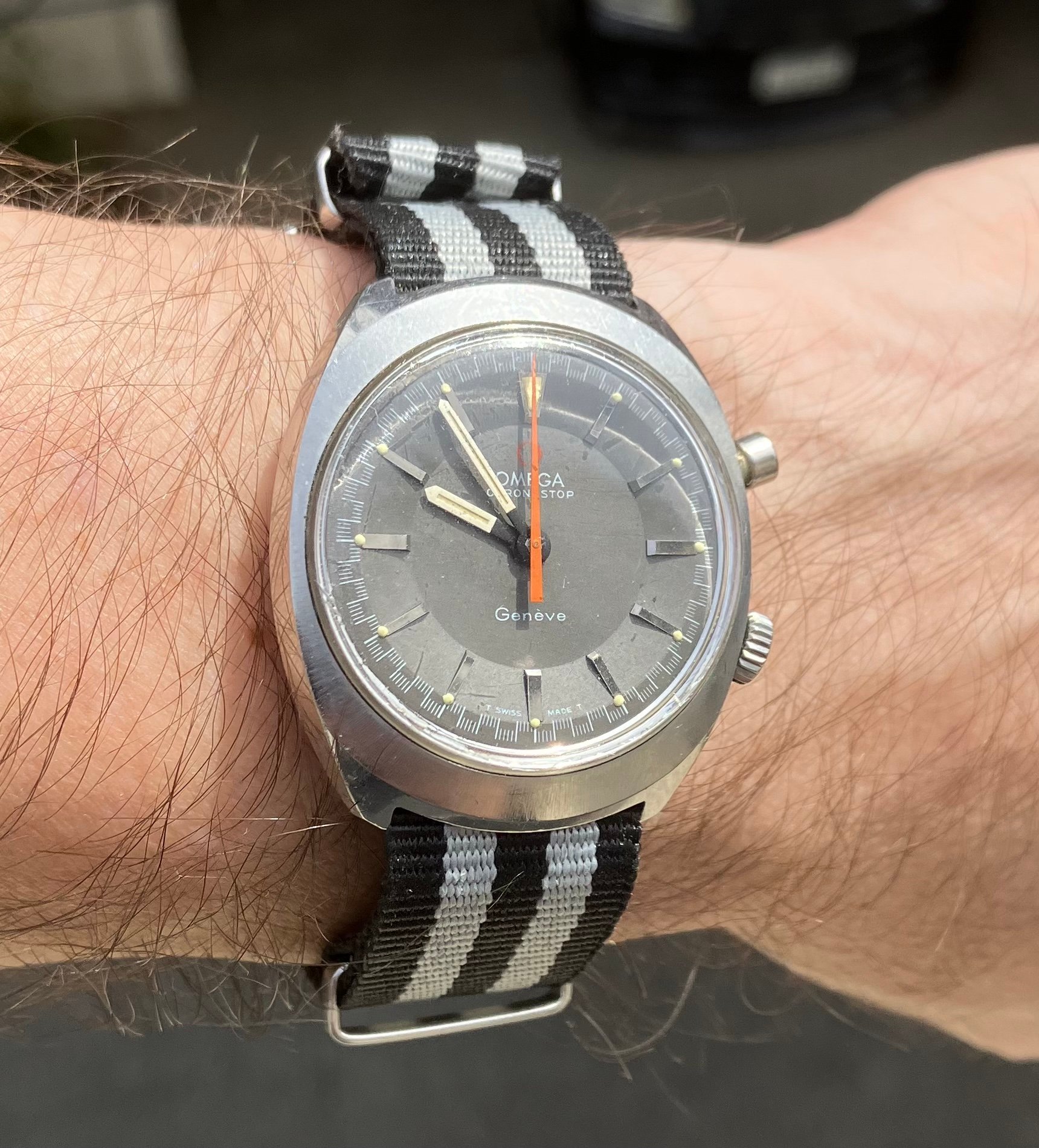 ·The Chronostop is an eccentric watch, especially the “driver” version designed to be worn underneath the wrist. This one is a non-driver, a trim, spiffy watch with an 865 movement, a serious mechanism that is apparently a stripped-down version of the 861 of Speedmaster fame. The stopwatch function is streamlined to the point of starkness: Push to start, push and hold to stop and record the time, then release for the orange hand to fly back to zero.