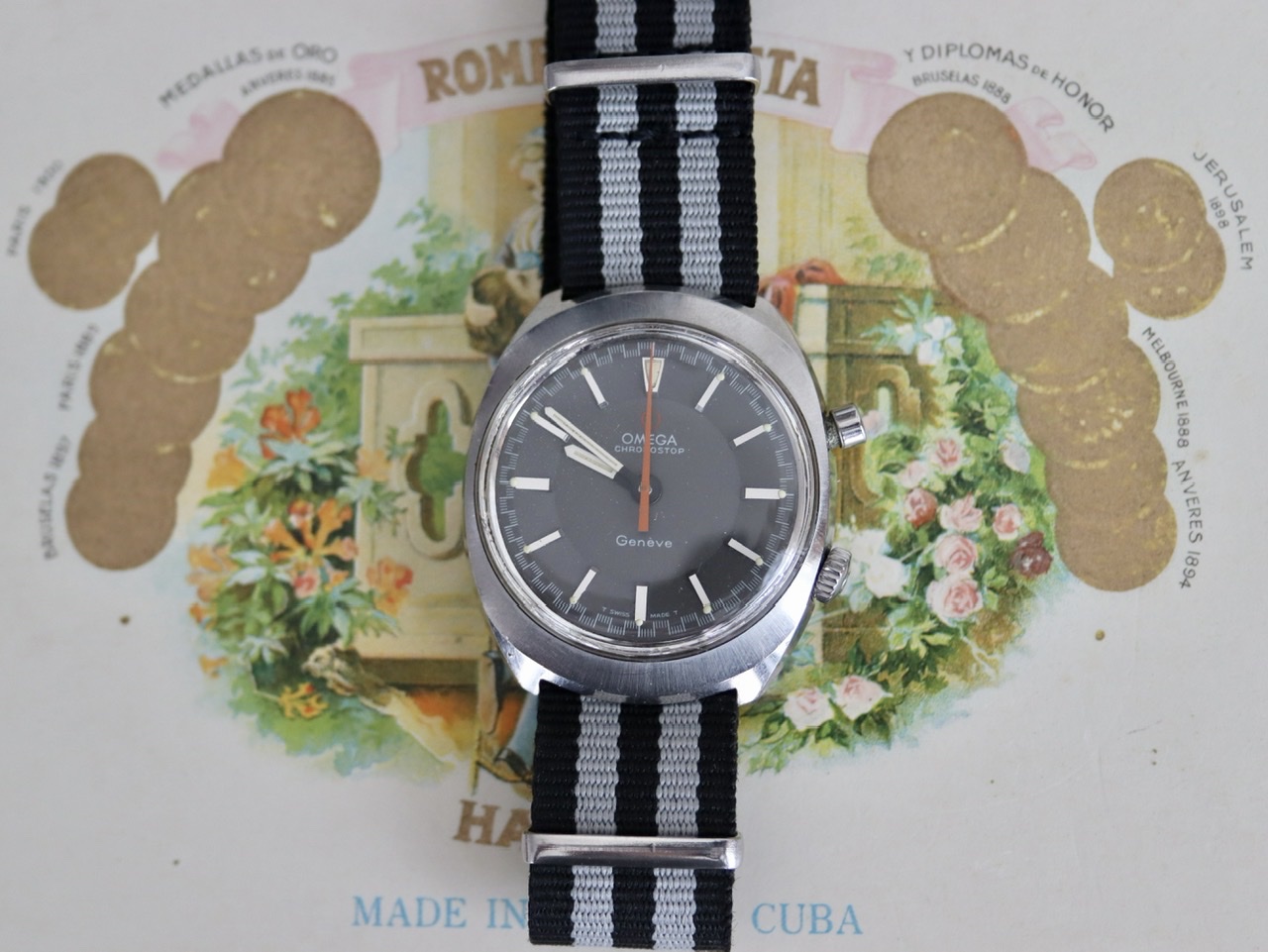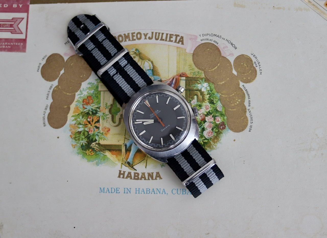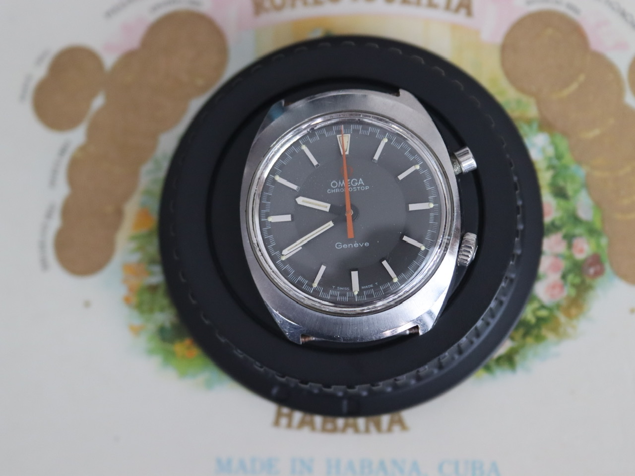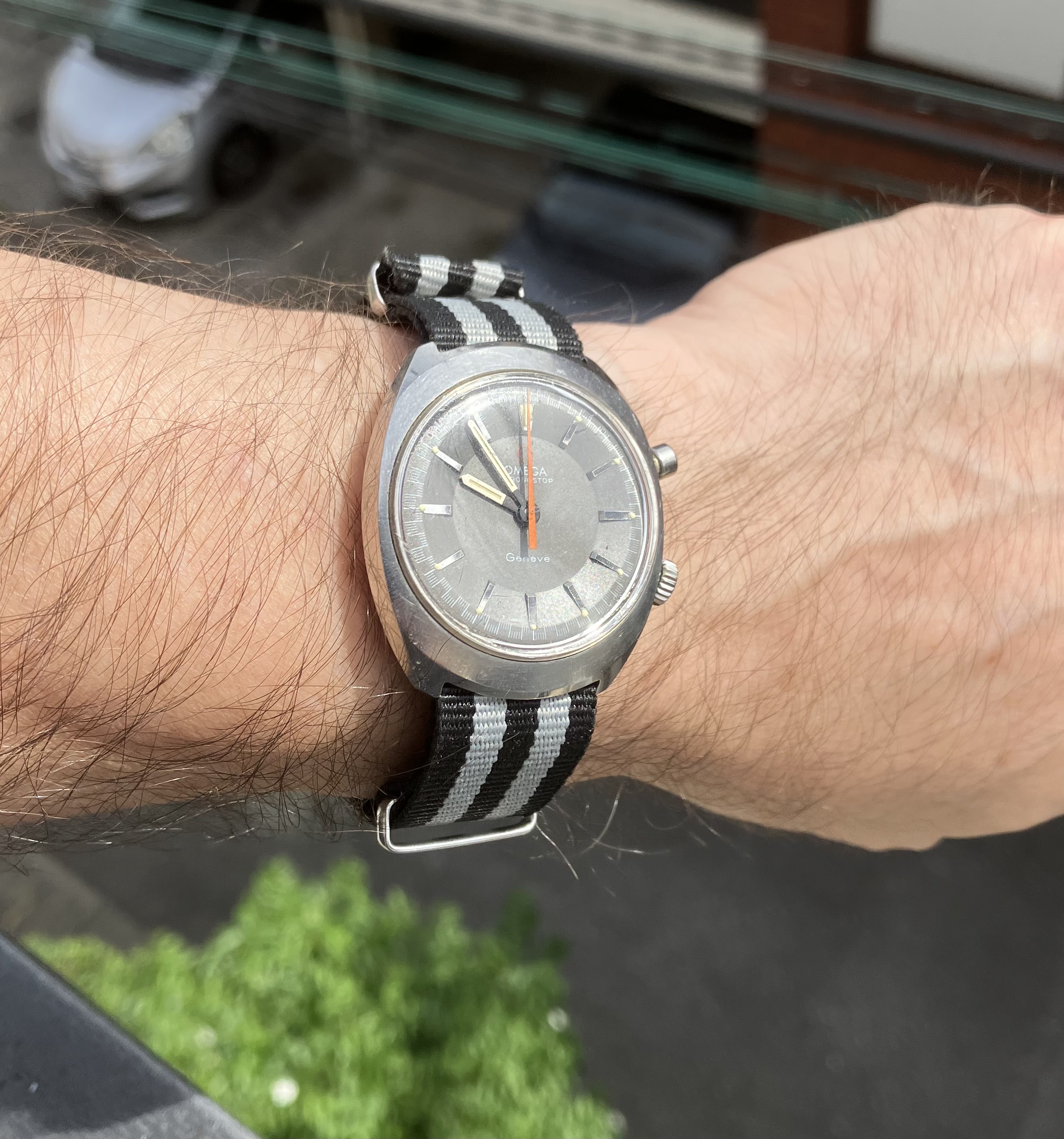 ·The Chronostop is an eccentric watch, especially the “driver” version designed to be worn underneath the wrist. This one is a non-driver, a trim, spiffy watch with an 865 movement, a serious mechanism that is apparently a stripped-down version of the 861 of Speedmaster fame. The stopwatch function is streamlined to the point of starkness: Push to start, push and hold to stop and record the time, then release for the orange hand to fly back to zero.