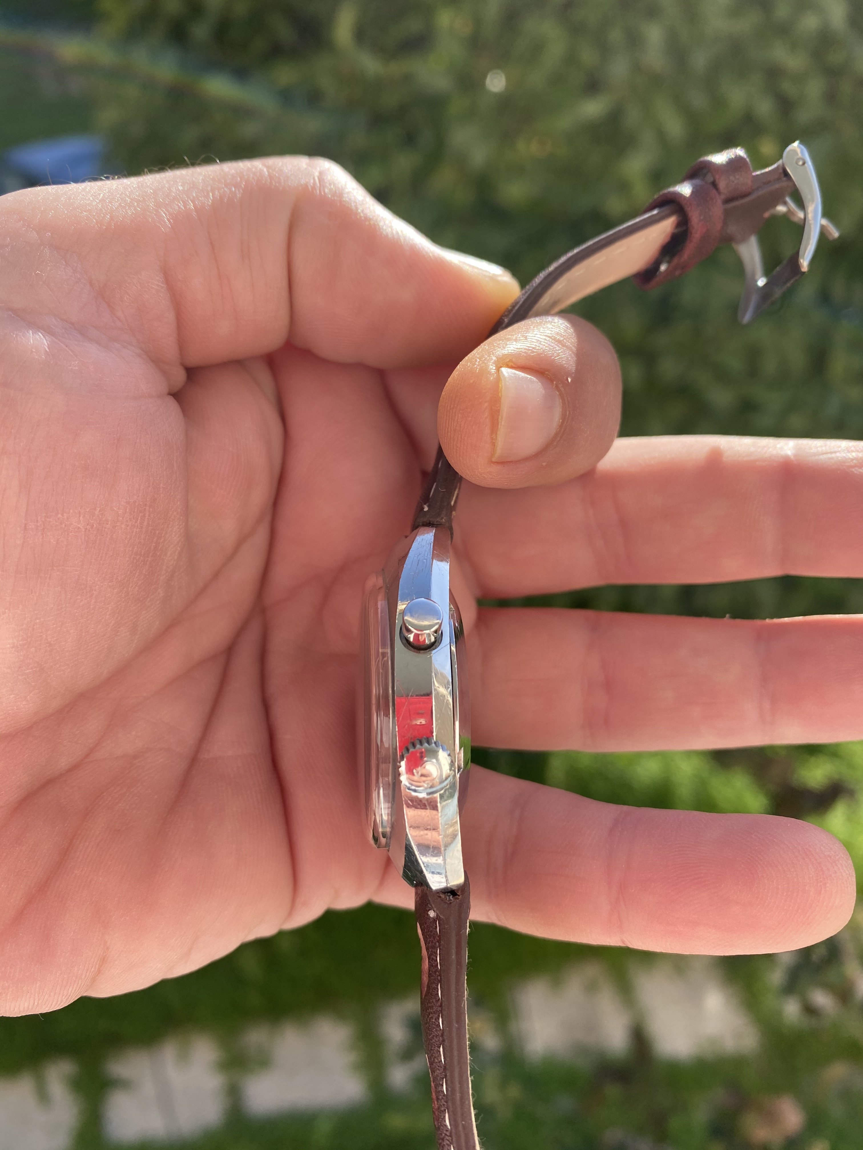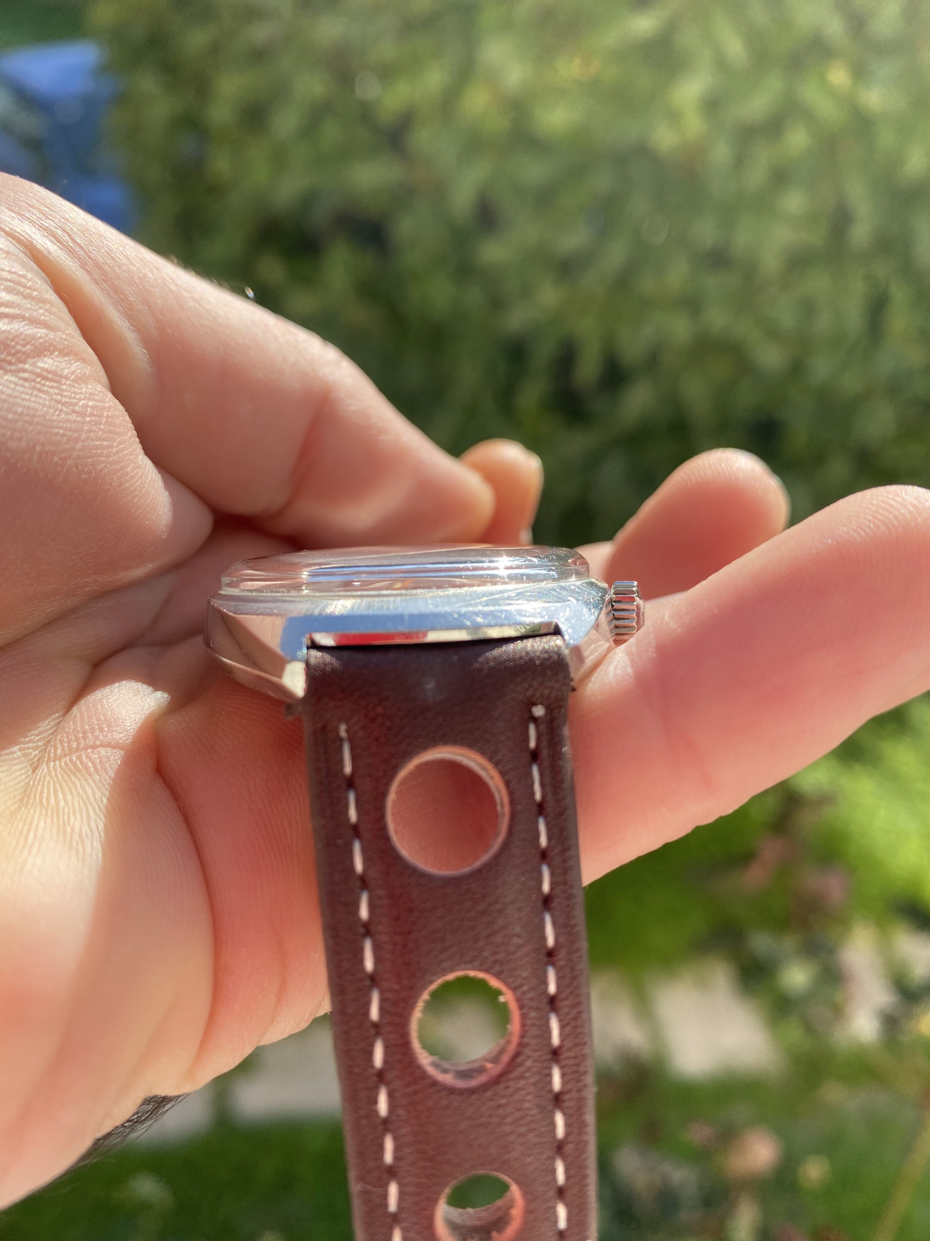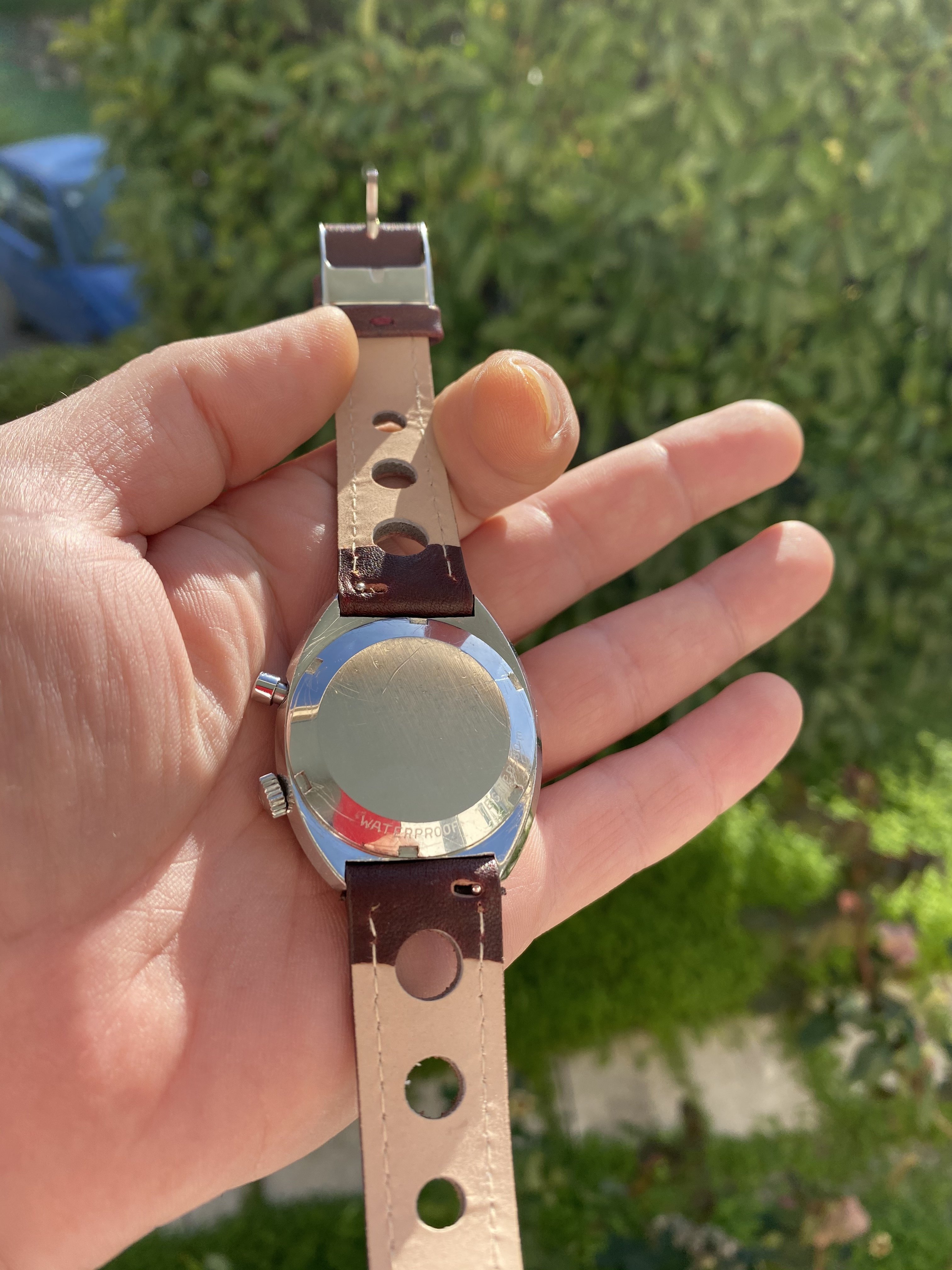 There are of course very few light scratches and marks on the sides and the back of the watch, due to age.