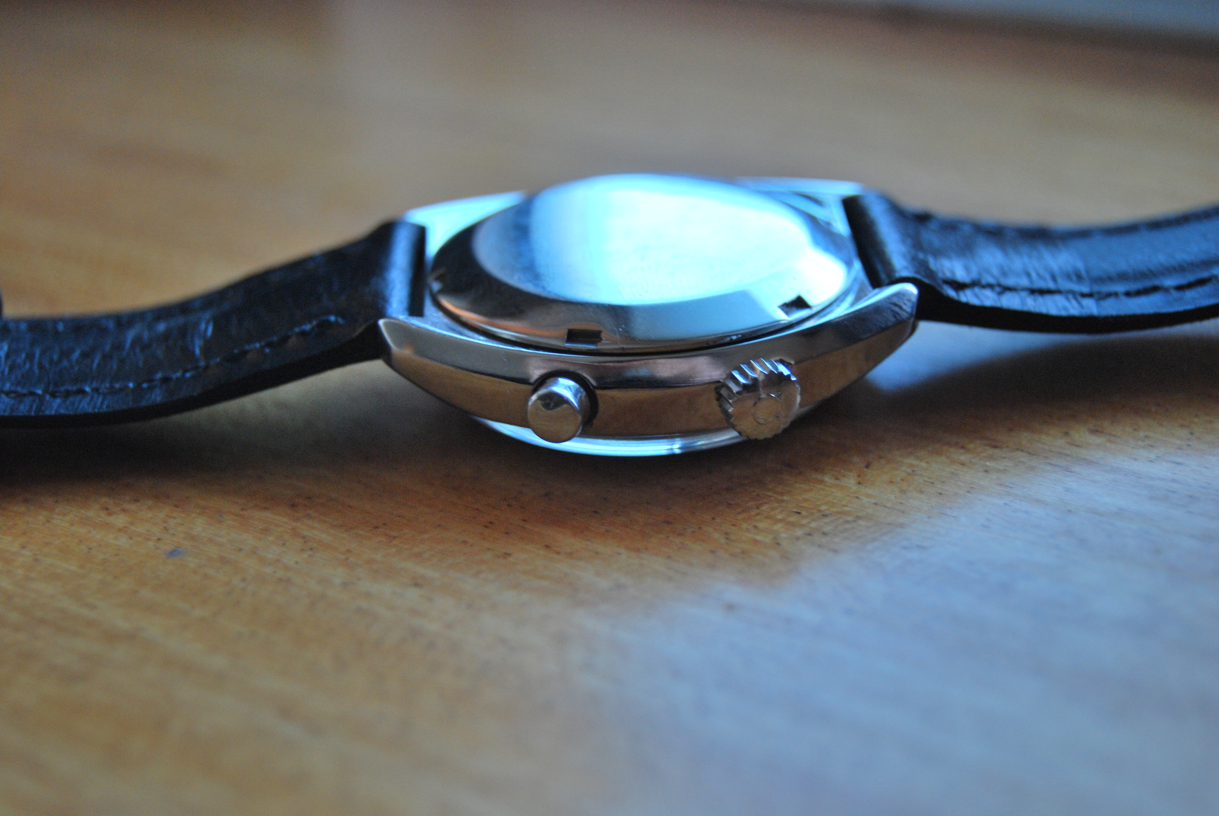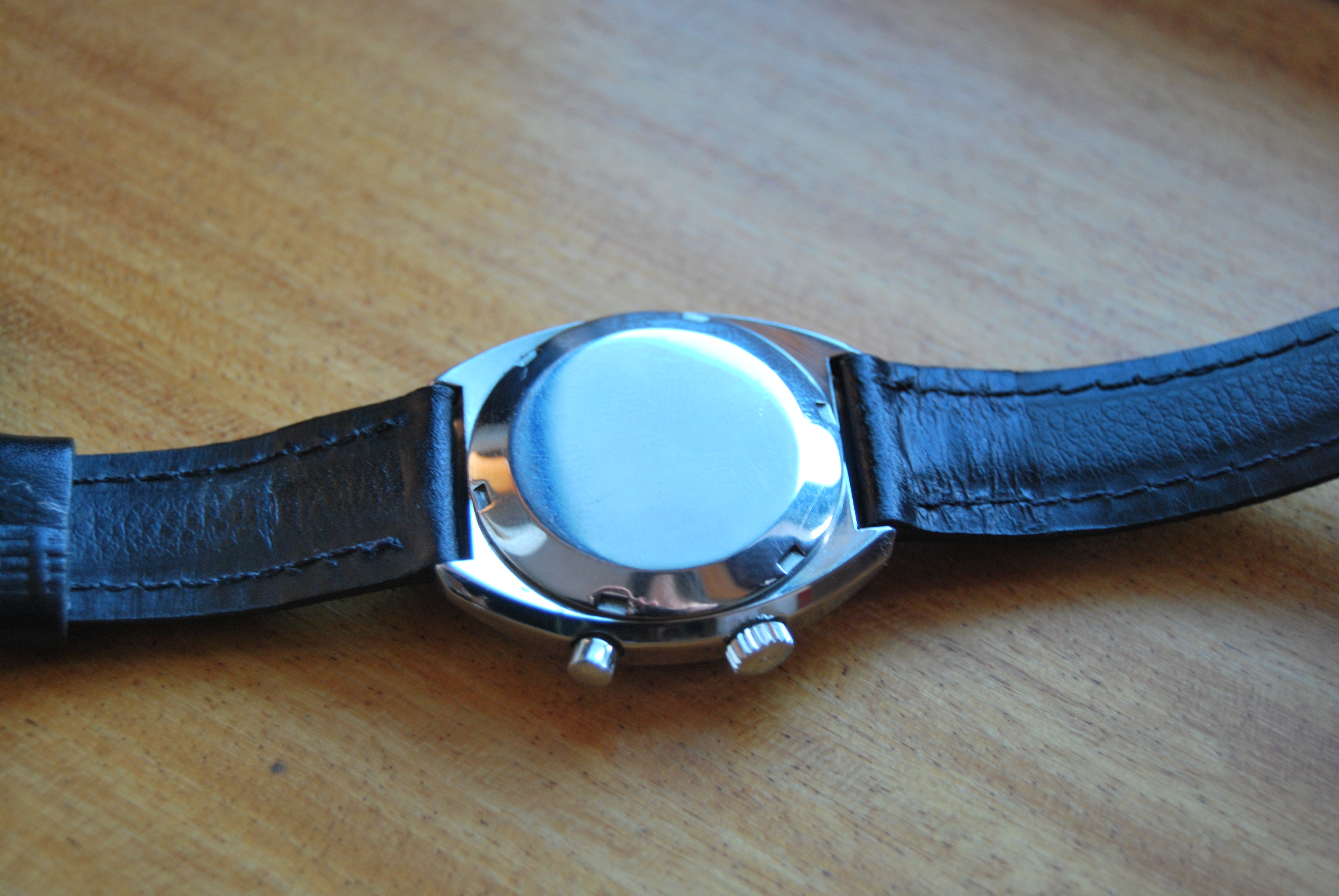 The watch is used in very good condition with a leather band. Visible marks of wear and use are evident. All parts are original.