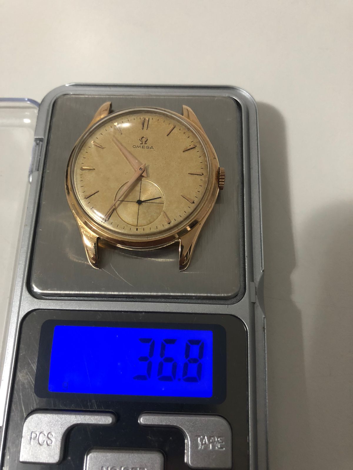 The given weight in the picture of 36.8g is useless. Figure about 30% to 40% of that is the case (about 13.5g) and only 75% of that is gold (10g). Current price of gold per gram is about US$60.