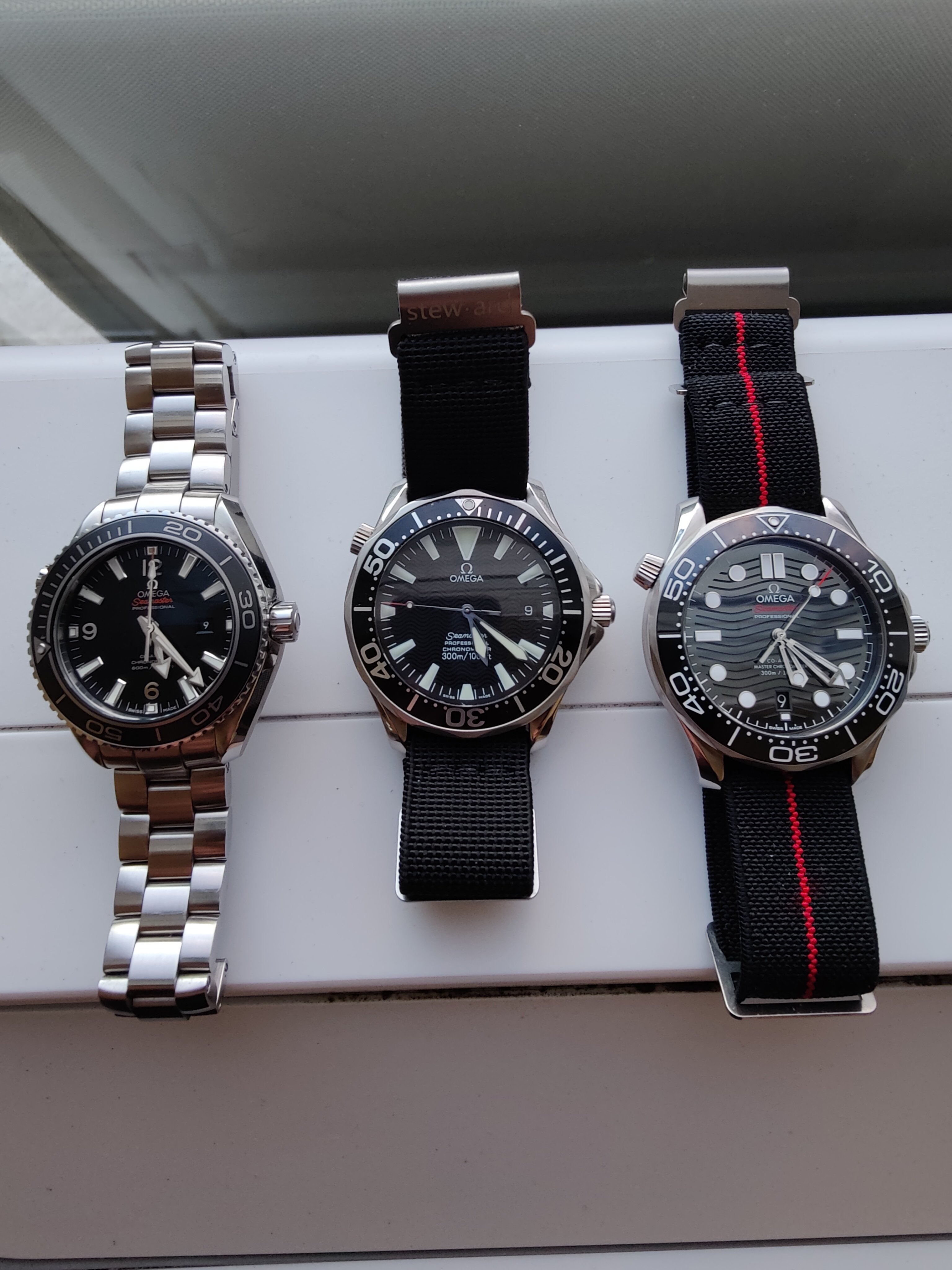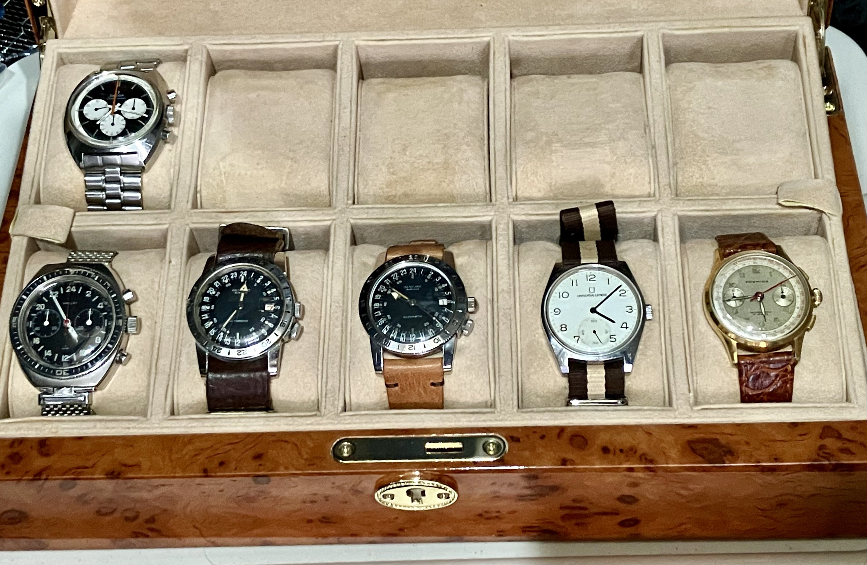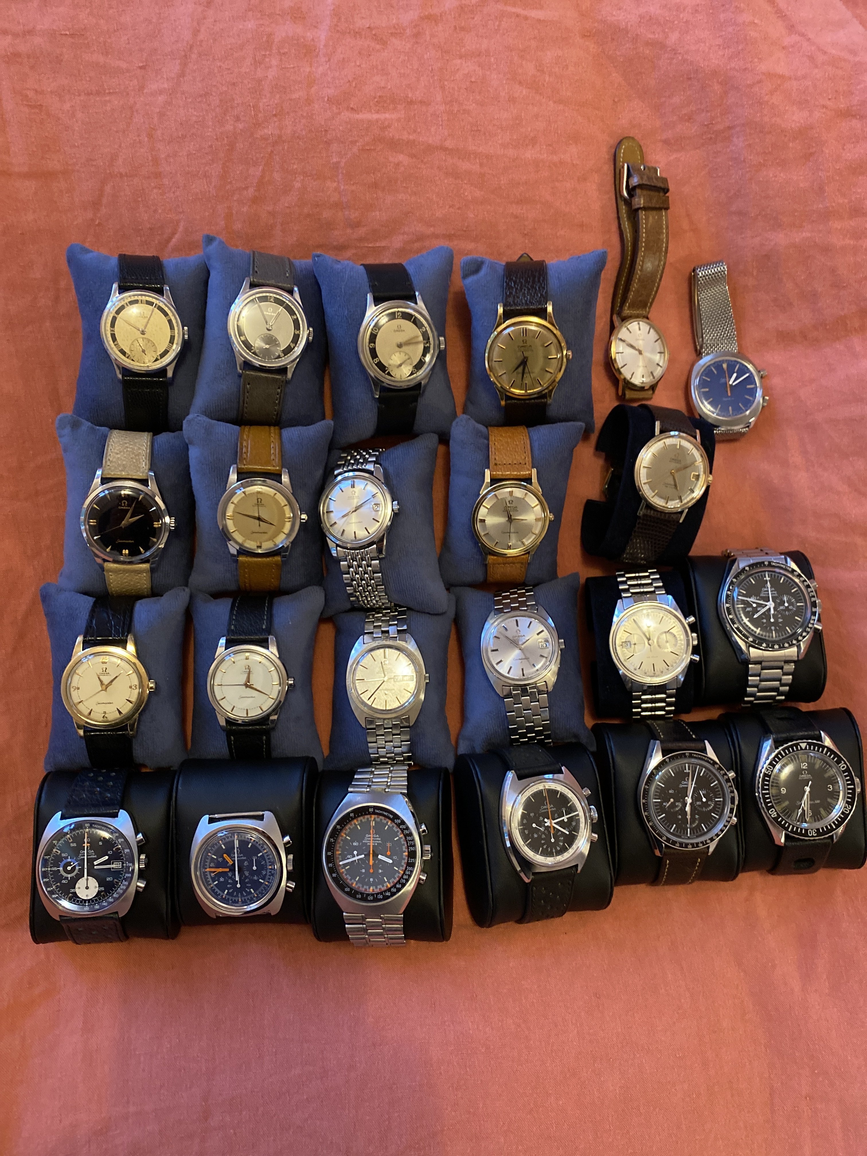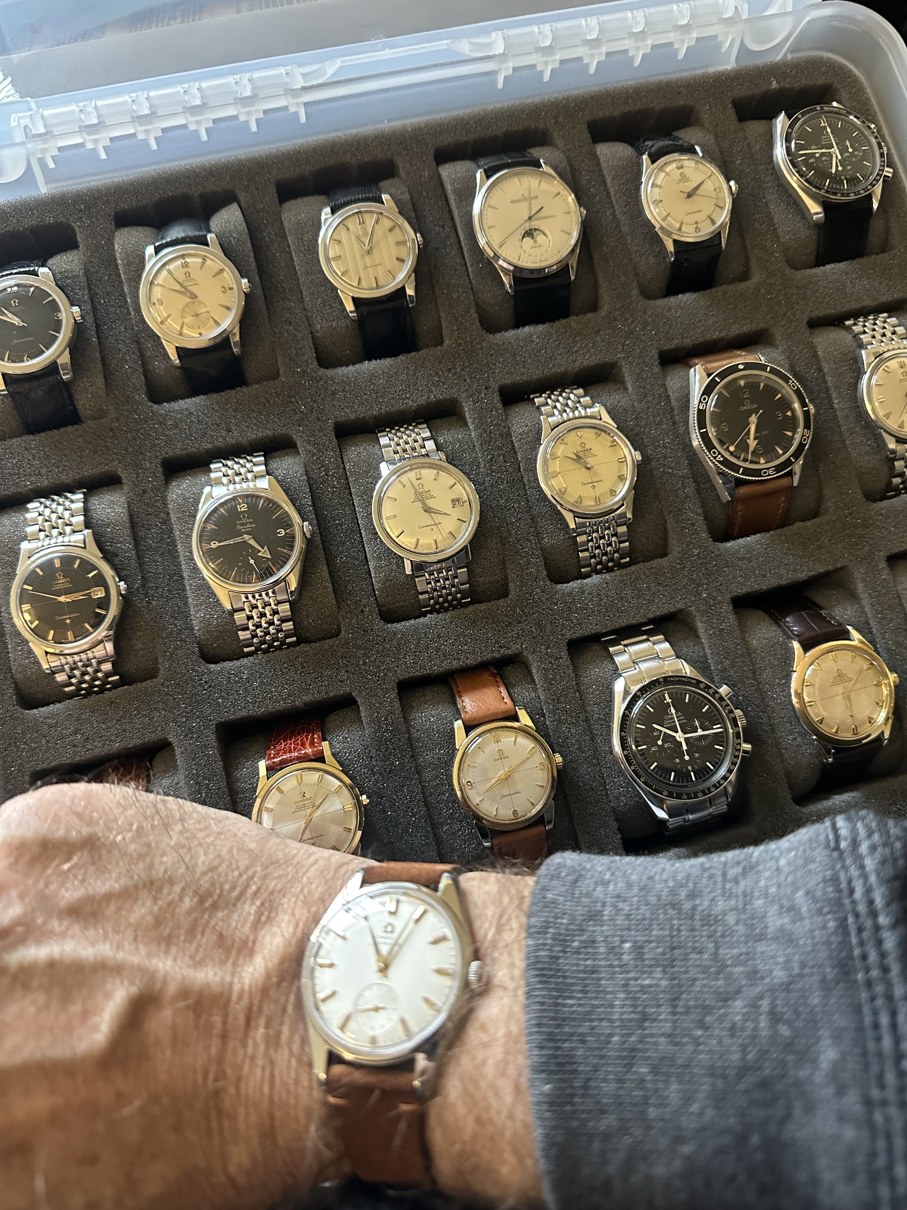 That top row was recently filled with Omegas. If I separate out the financial reasons for this shift, the very slim remaining explanation would be something like: I spent several weeks away from home with just one Chronostop Seamaster, the biggest, chunkiest watch I’ve ever owned, came back and managed (thanks to @Scarecrow Boat) to obtain a bracelet for the Seamaster 145.016-68 chronograph in the top left corner and found myself wearing these big tool watches much more than the 1960s166.010s and earlier designs that used to be my sweet spot.
