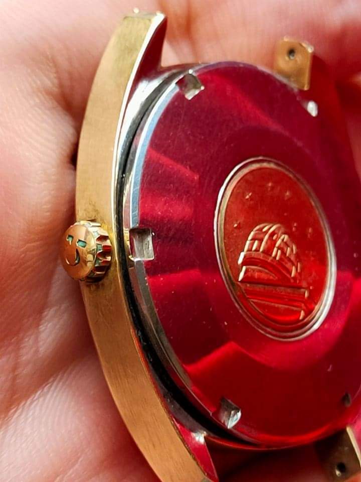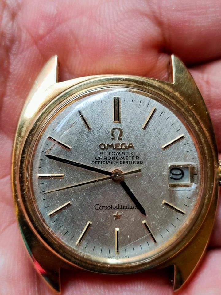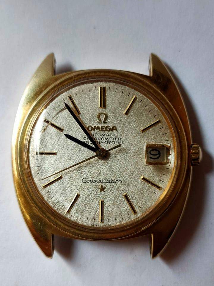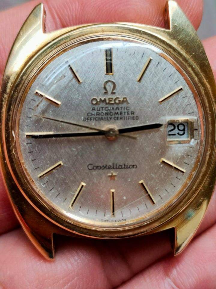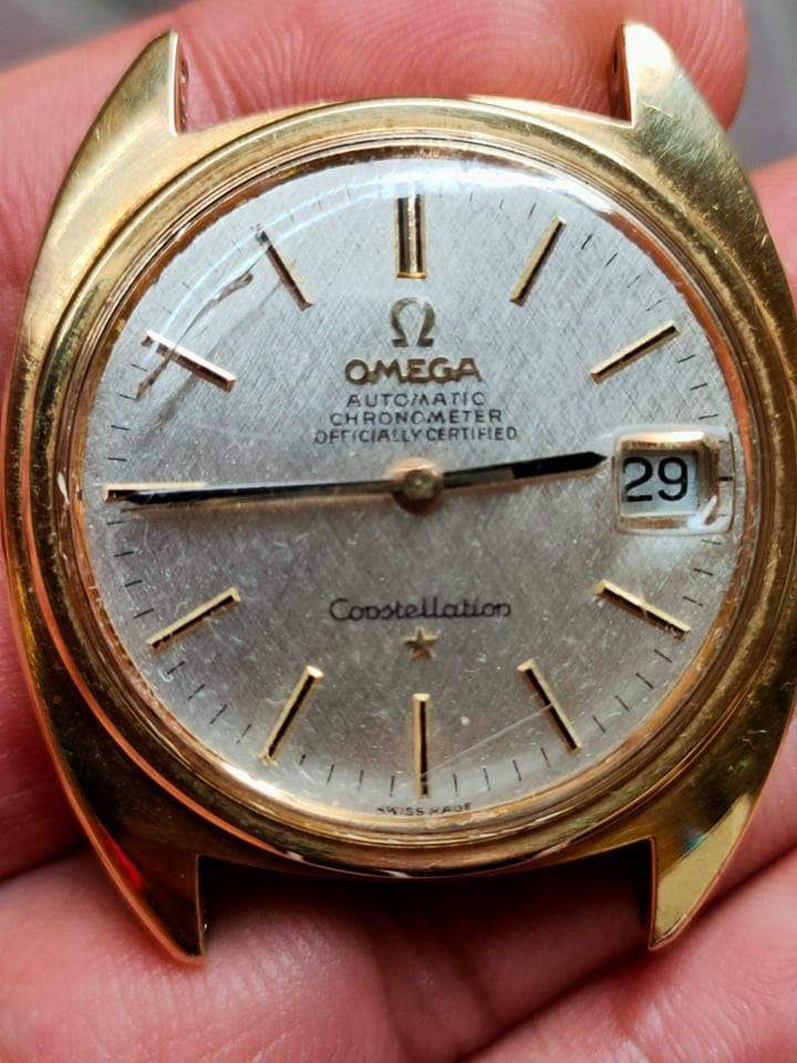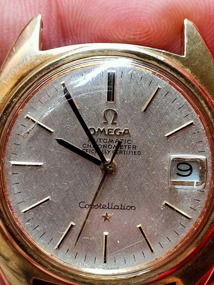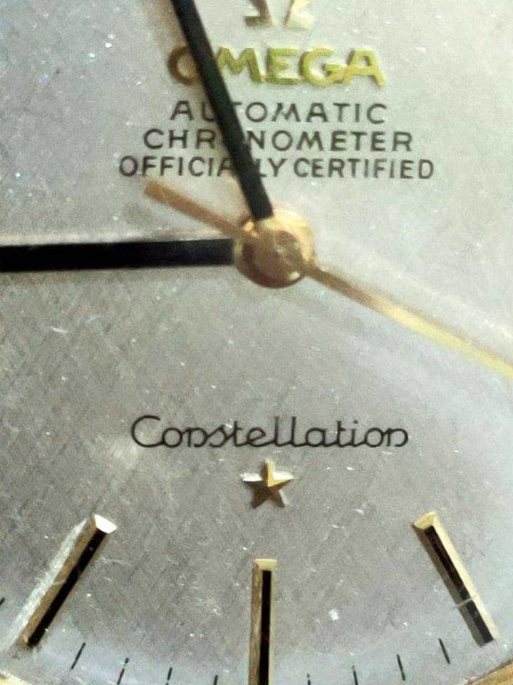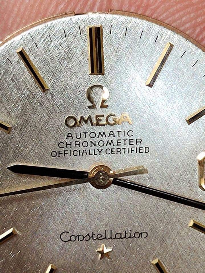 Pictures aren't of the best quality, it's a textured dial, the crystal is possibly aftermarket and it is definitely scratched and covered in dust/lint. I wouldn't want to say anything with certainty...