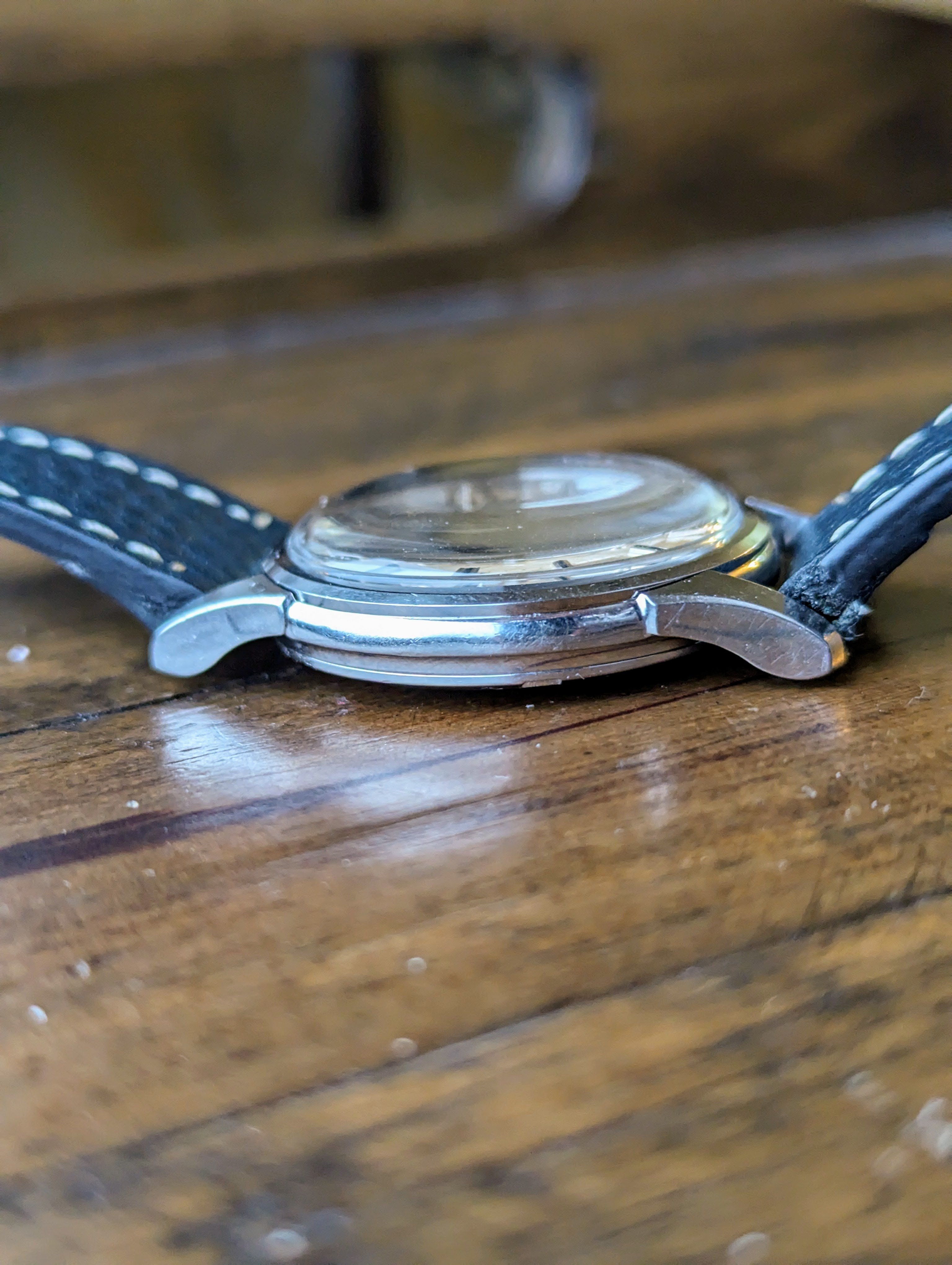 CASE: The previously polished 34mm stainless steel case is strong. All four lugs retain their factory beveled edges with good lines. The case presents with light to moderate wear. The yellow gold observatory medallion is also in good condition. The observatory and all 8 stars are clearly visible and distinct. The crystal and crown was replaced sometime in the past.