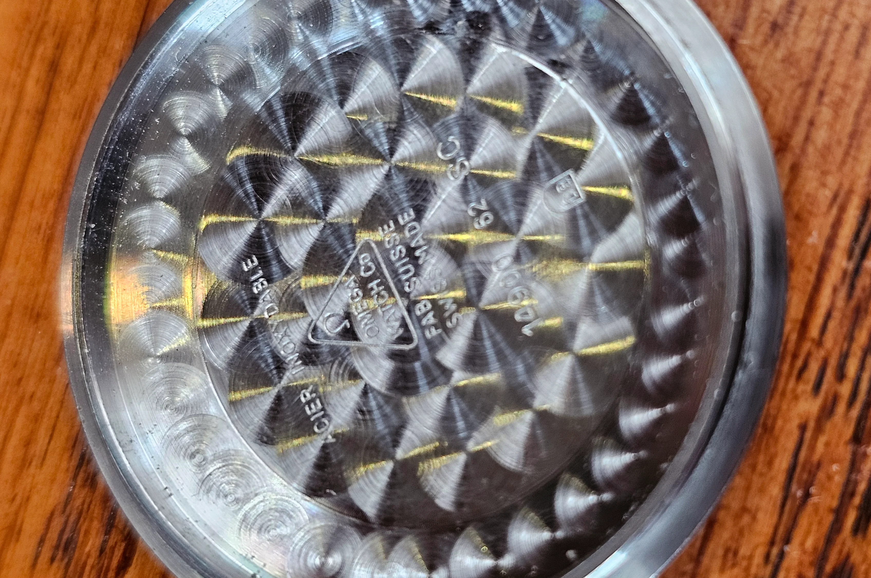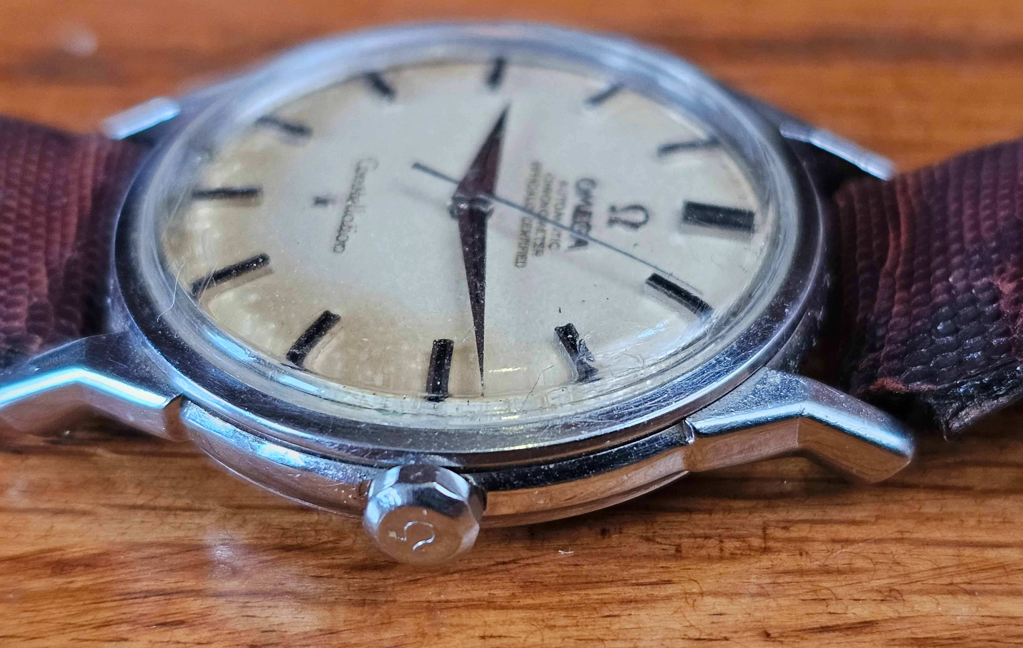 Hands and furniture are correct and matching, hour markers have onyx inserts and the crystal is Omega original with small logo in the middle.