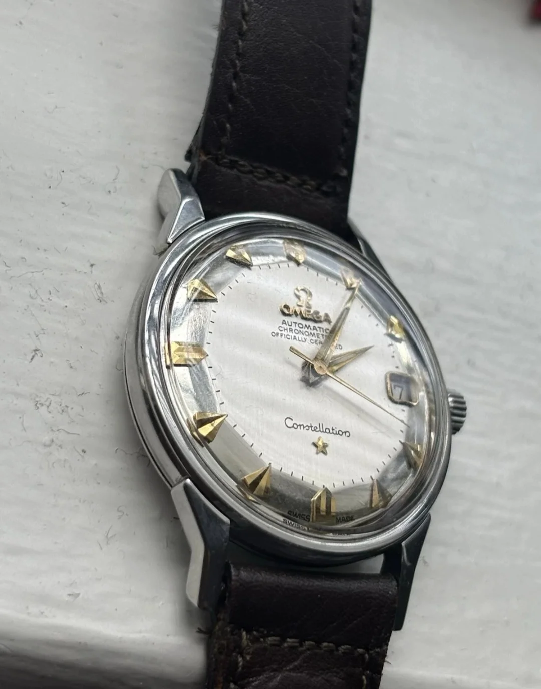 - pie pan dials should have sharp angles. This is soft. You can see someone’s put a thick layer of paint over it. Especially as it dips in near the centre of the dial.