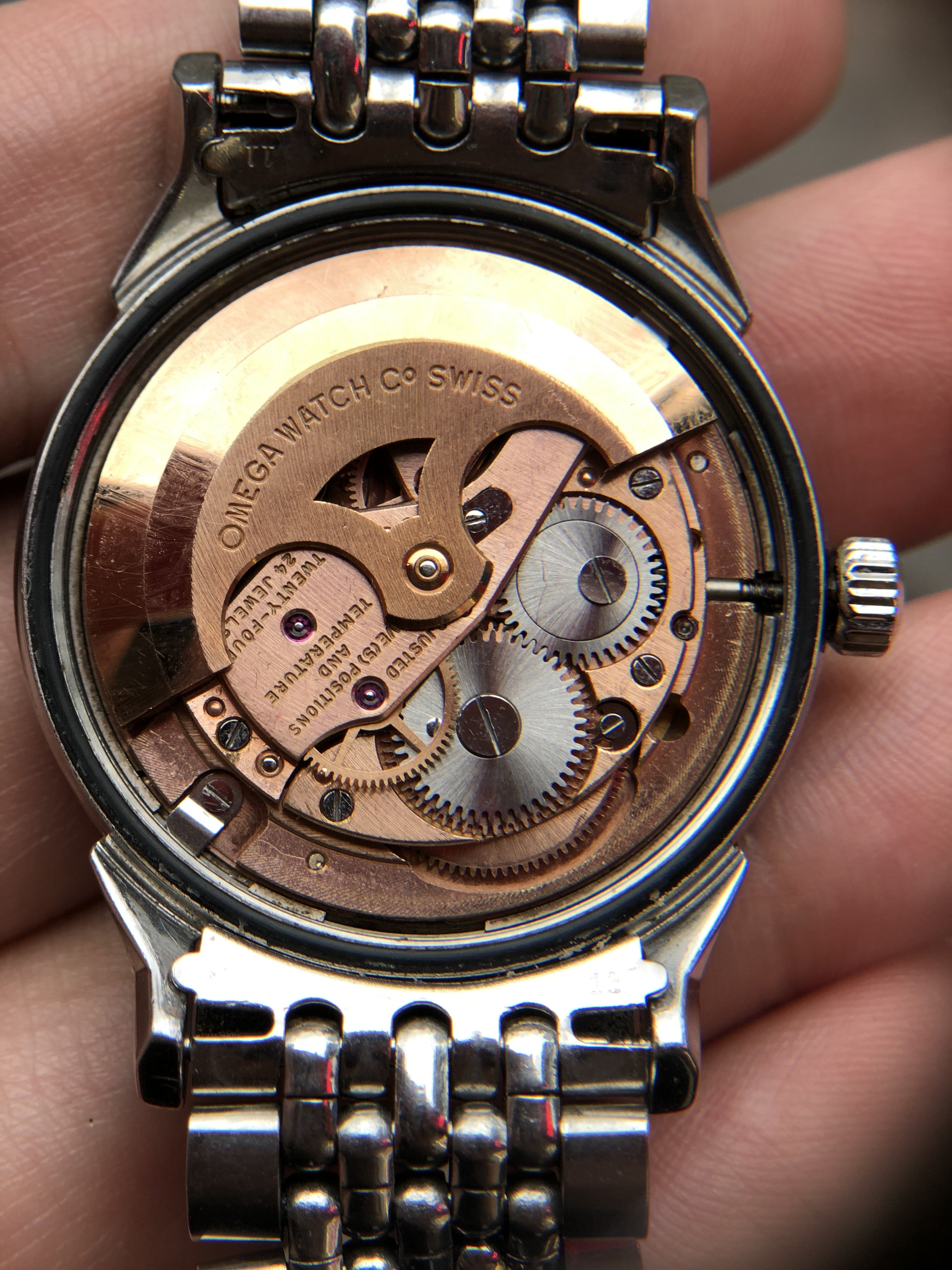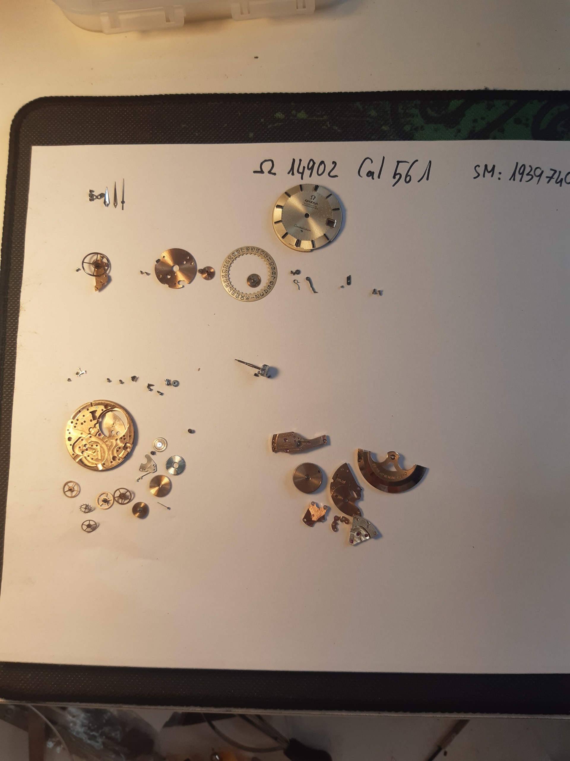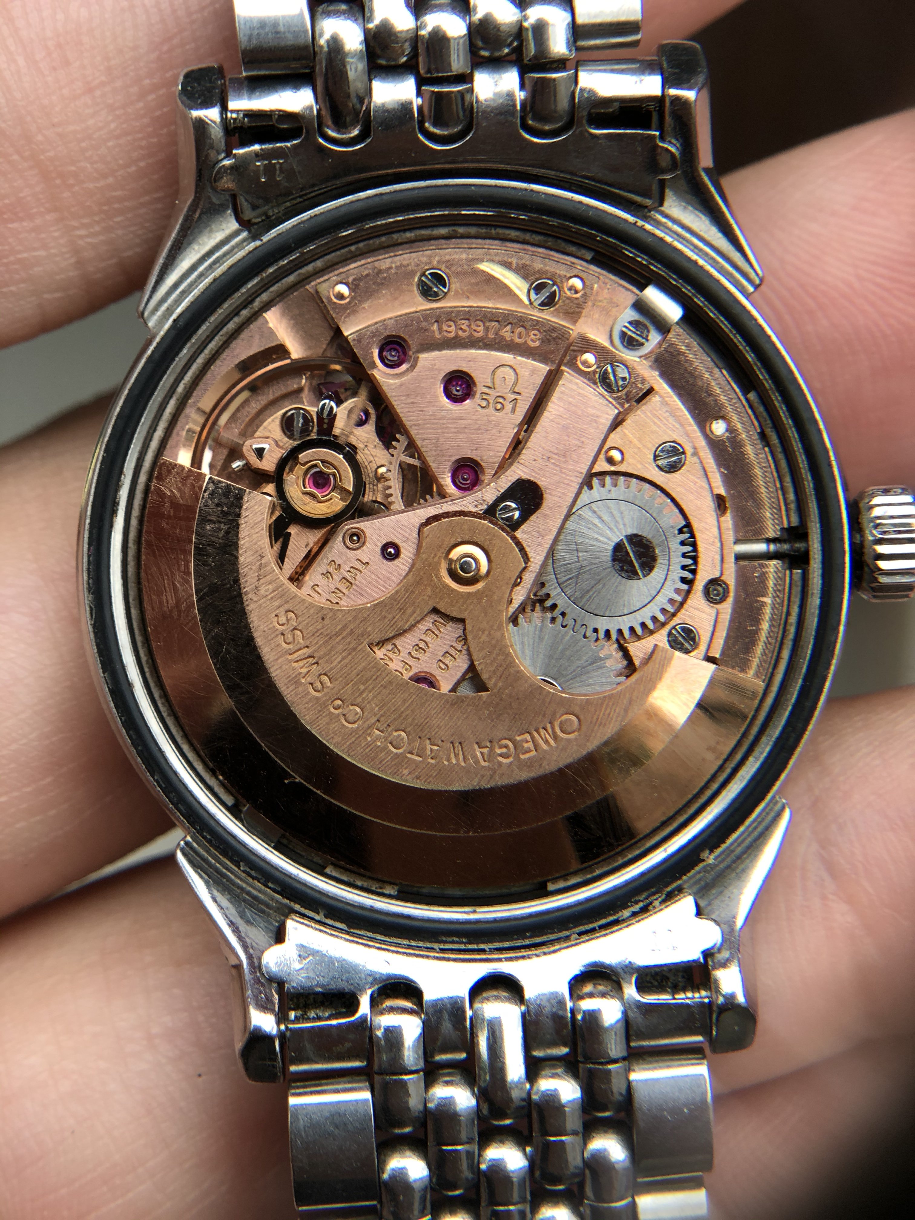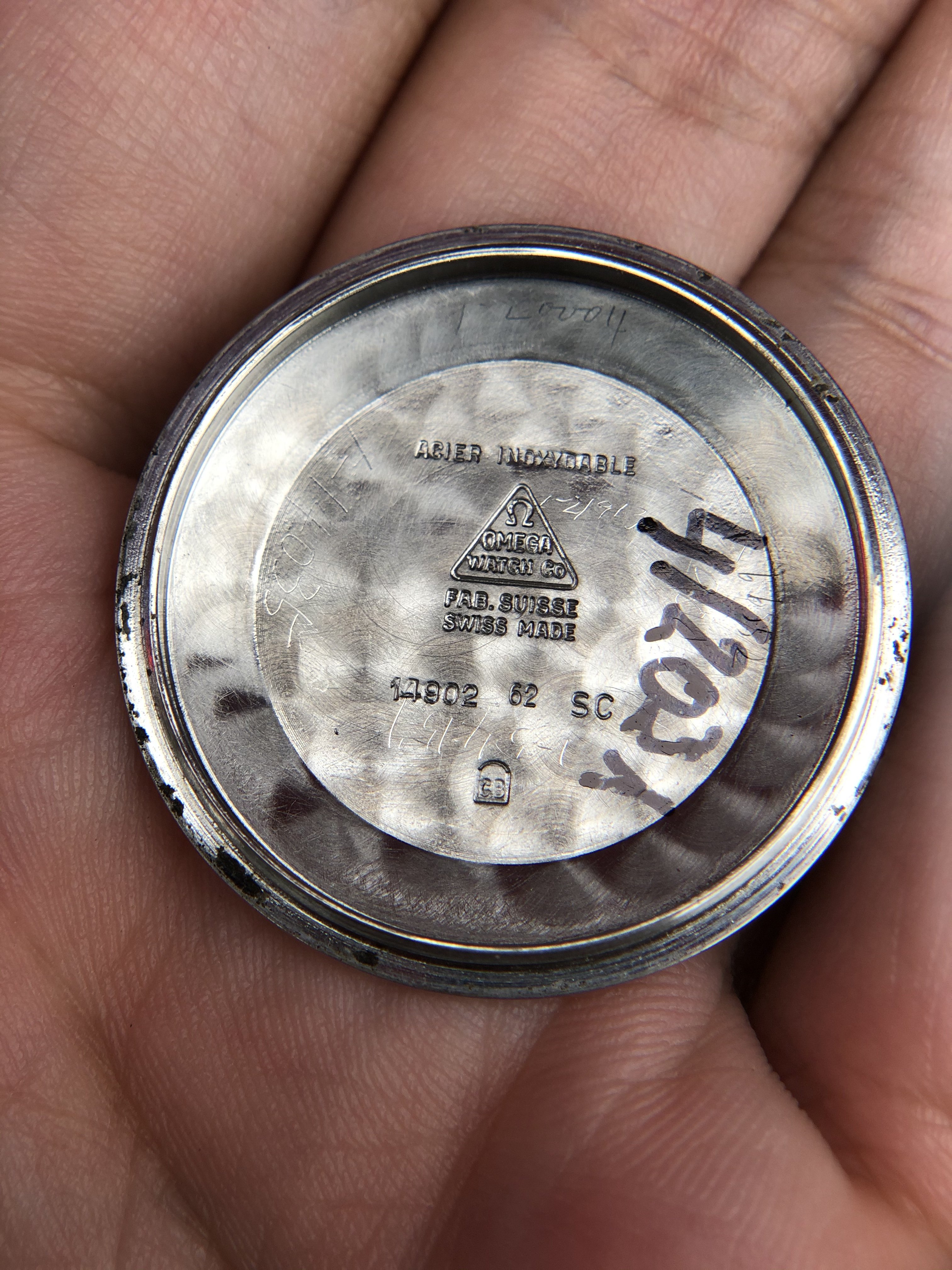 The movement is original Omega Cal. 561 freshly serviced. Serial Number 19mils, dated the watch to 1962, which I think is correct time frame for 14902.