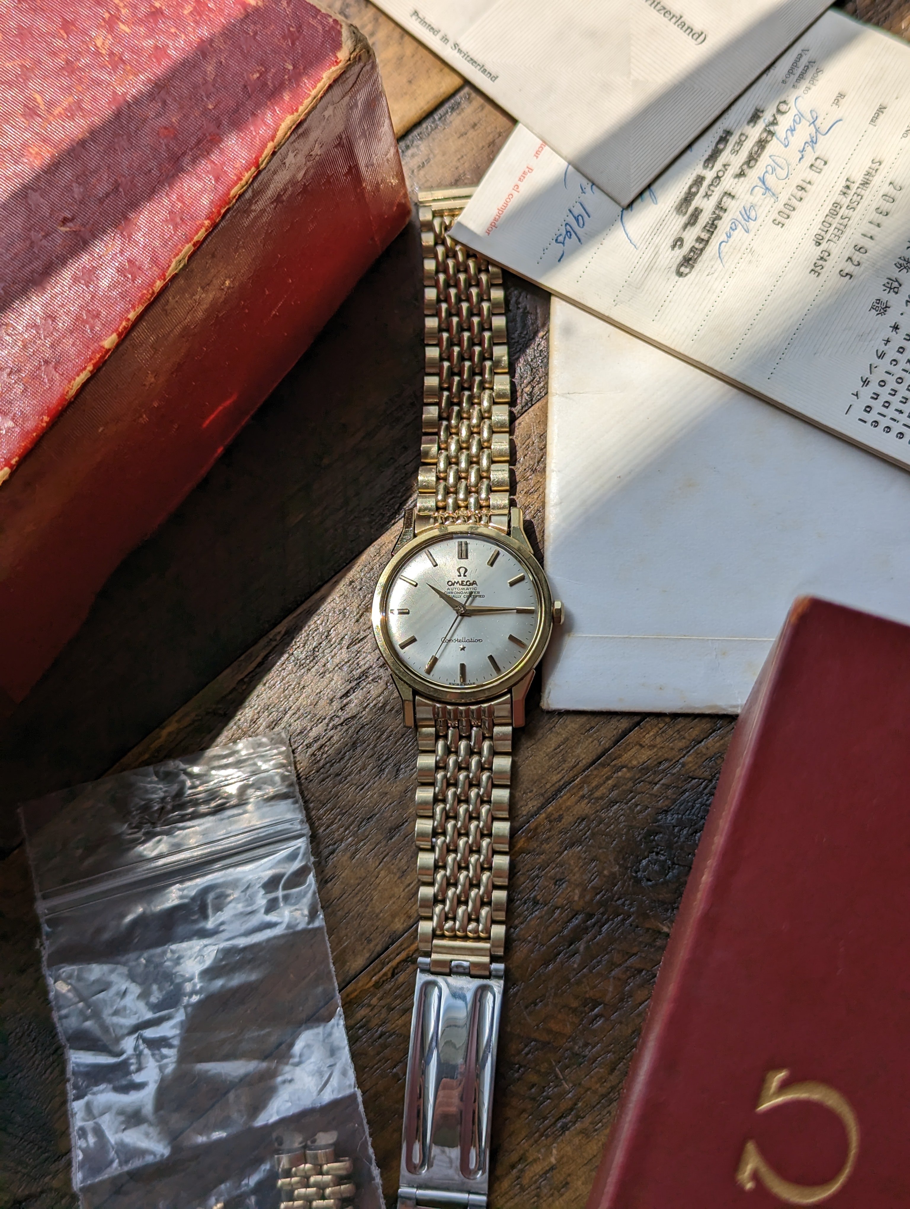 This example, a dog leg constellation reference 167.005 was purchased by Mr. Jang Pak Man on the 18th of March in the year of 1965. It was sold by a Mr. Charles while working for Dabera Limited located in Hong Kong. The paperwork included with the watch accurately depicts the watch as stainless steel case with 14k gold top.