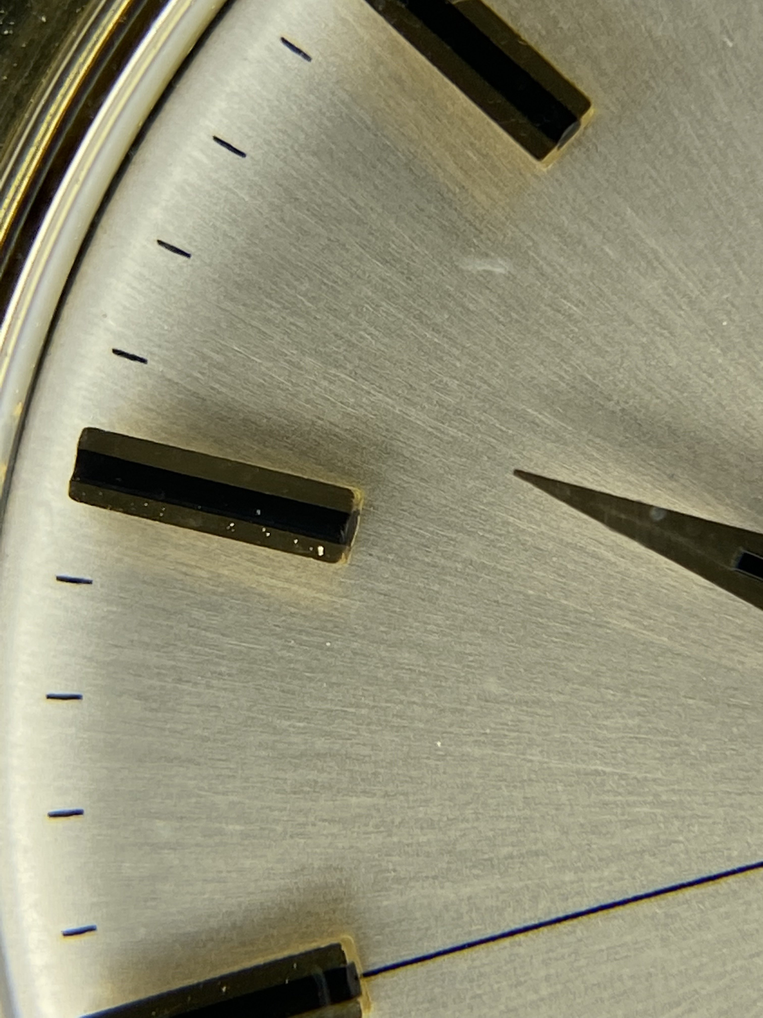 Please see the pics for the complete story. Any dial flaws seen in the high rez macros are not seen under loupe..So I'm calling the dial flawless. I love the way the black onyx plays off the gold on this non-lume beauty and I think you will too.