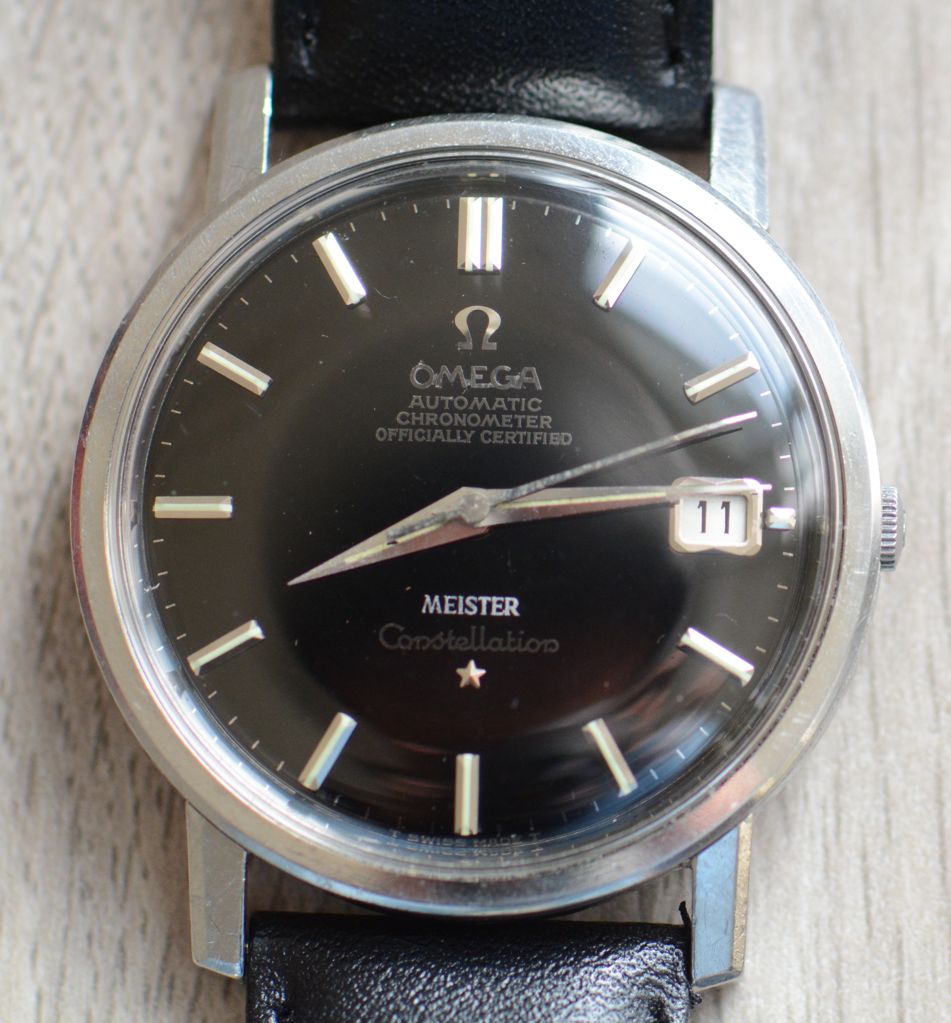 Dial: The obvious star of this watch, an original glossy black dial. Original black dialed Constellations are hard to find in general, even harder for such an excellent example. It features a co-branding by "Meister", a high-end jeweller and watch sales agent, still operative in Zurich, Switzerland. The only minor flaw is some missing lume in the hour hand.