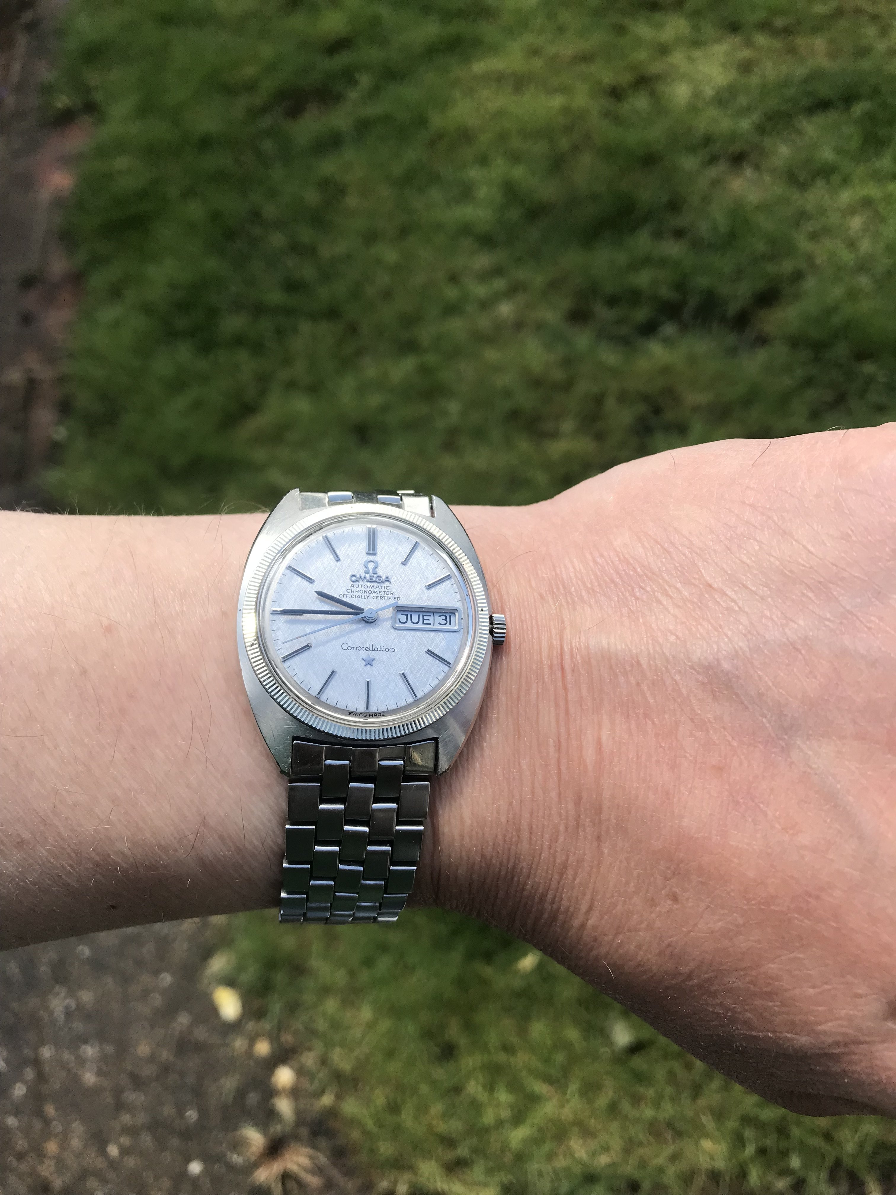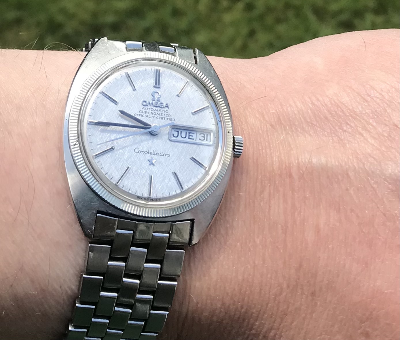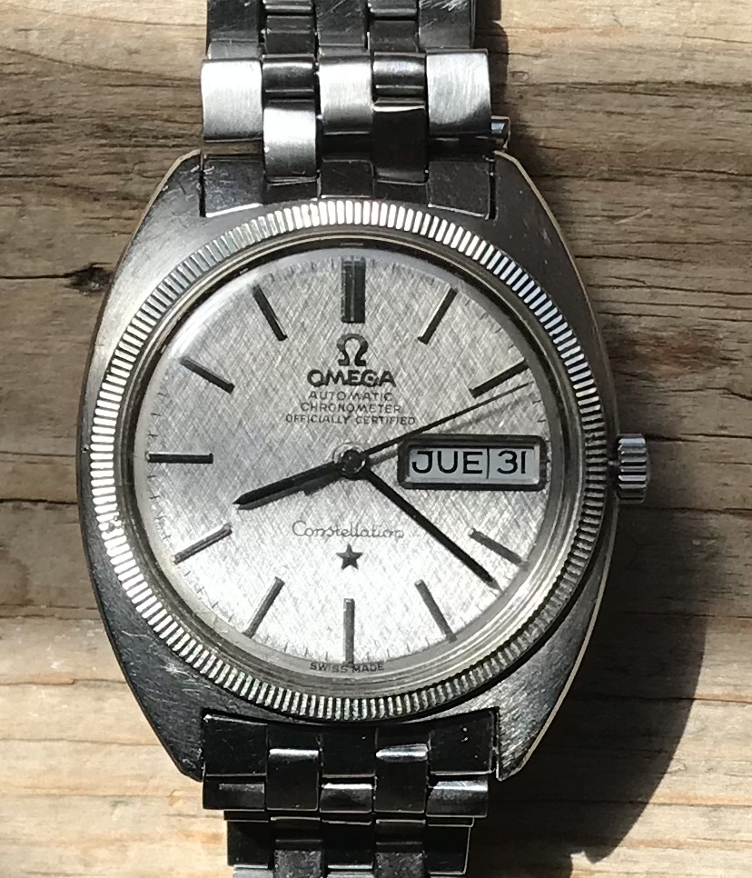·FS Omega Constellation Ref 168.029. This is a nice, original example, with a recently serviced 751 movement, complete with brick bracelet and correct end links. As I hope is clear from the pics, the 'C' case is very sharp, with a stunning original etched dial. Based on my research here on OF, I believe the fluted bezel is white gold - it reflects the light very differently to the rest of the steel case, which retains its sharp edges, bevels and brushed finish on top.