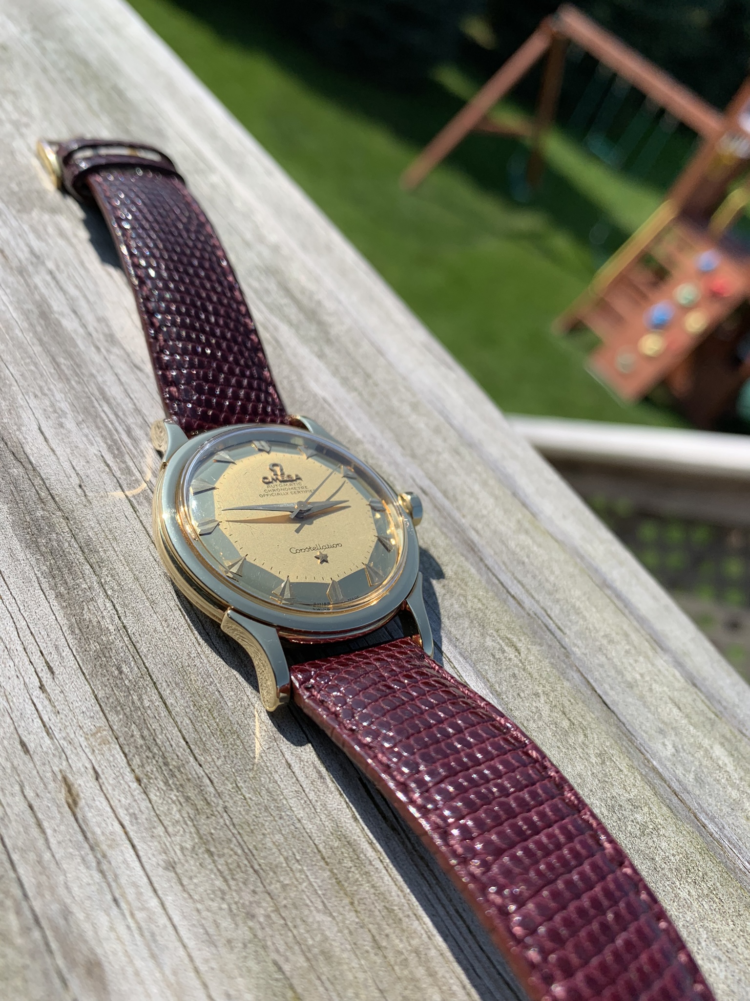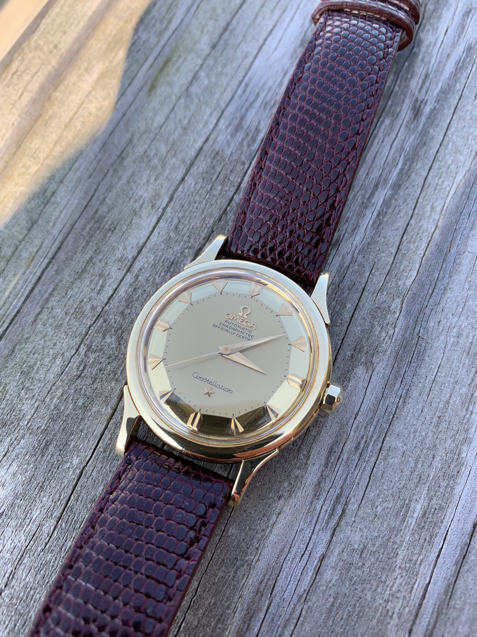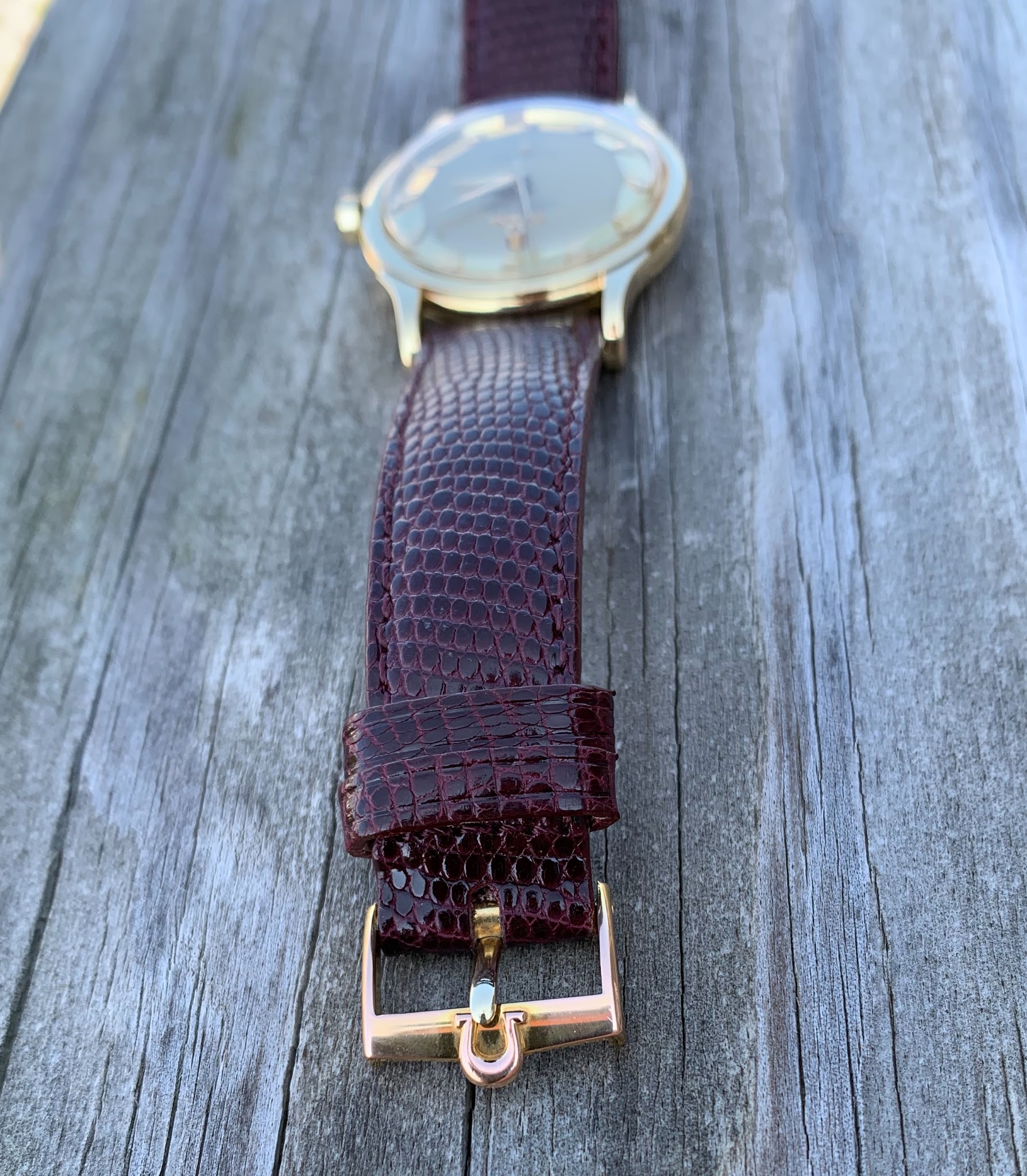 ·Up for sale is my very nice 18K 1954 Constellation DeLuxe reference 2799 with a caliber 354 (the more sought after bumper movement). I purchased this in February 2014 from a well known Forum member who had this to say when he was selling it, “Simply put, you’d be hard pressed to find a better example than this one, and the very small number of guys that have managed to secure a better specimen aren’t parting with theirs.” The watch was serviced a short time before I bought it and it runs and operates as it should. It will come on nice dark maroon lizard strap seen in photos. No trades please! I’ll let the pictures do the rest of the talking.