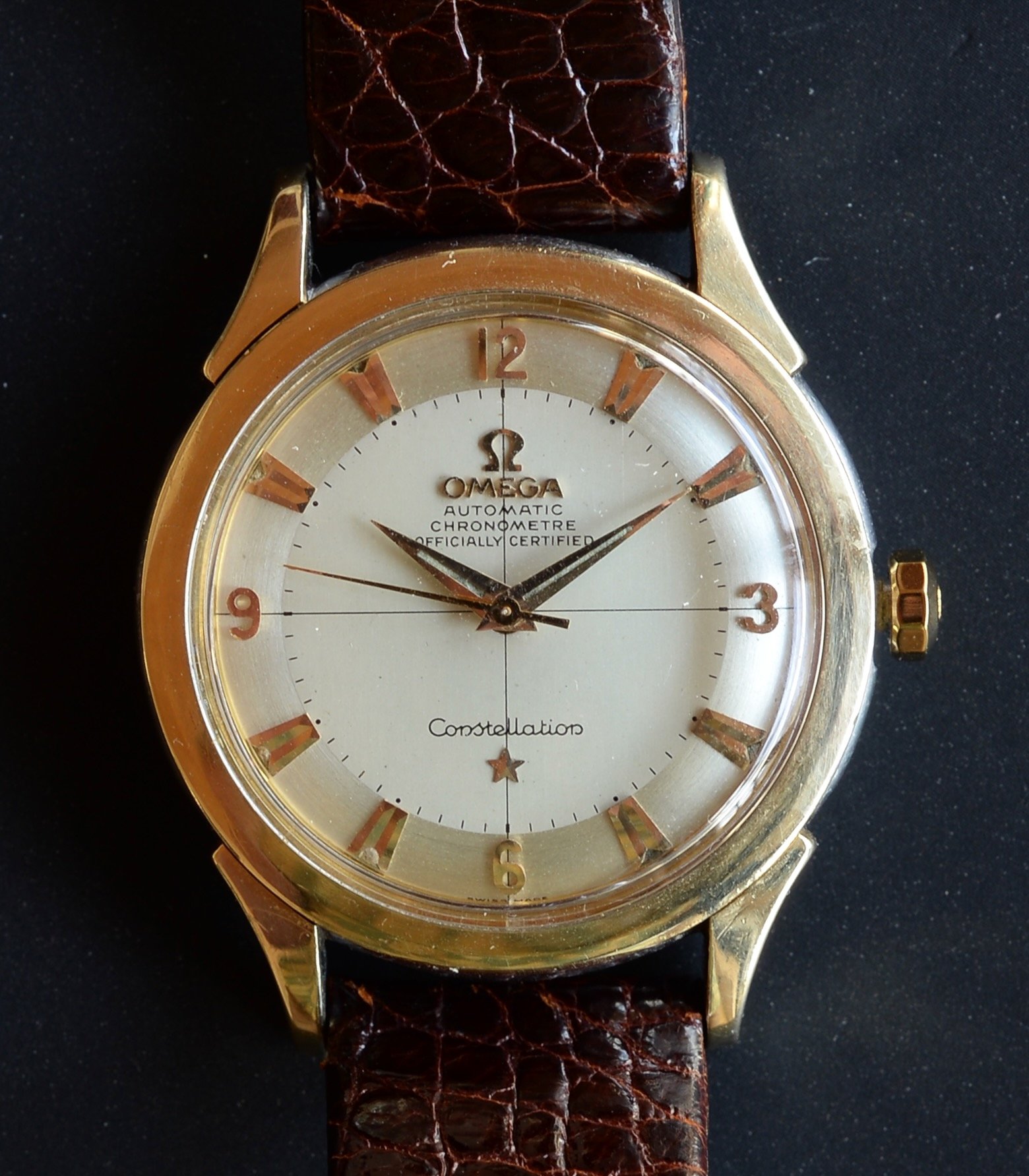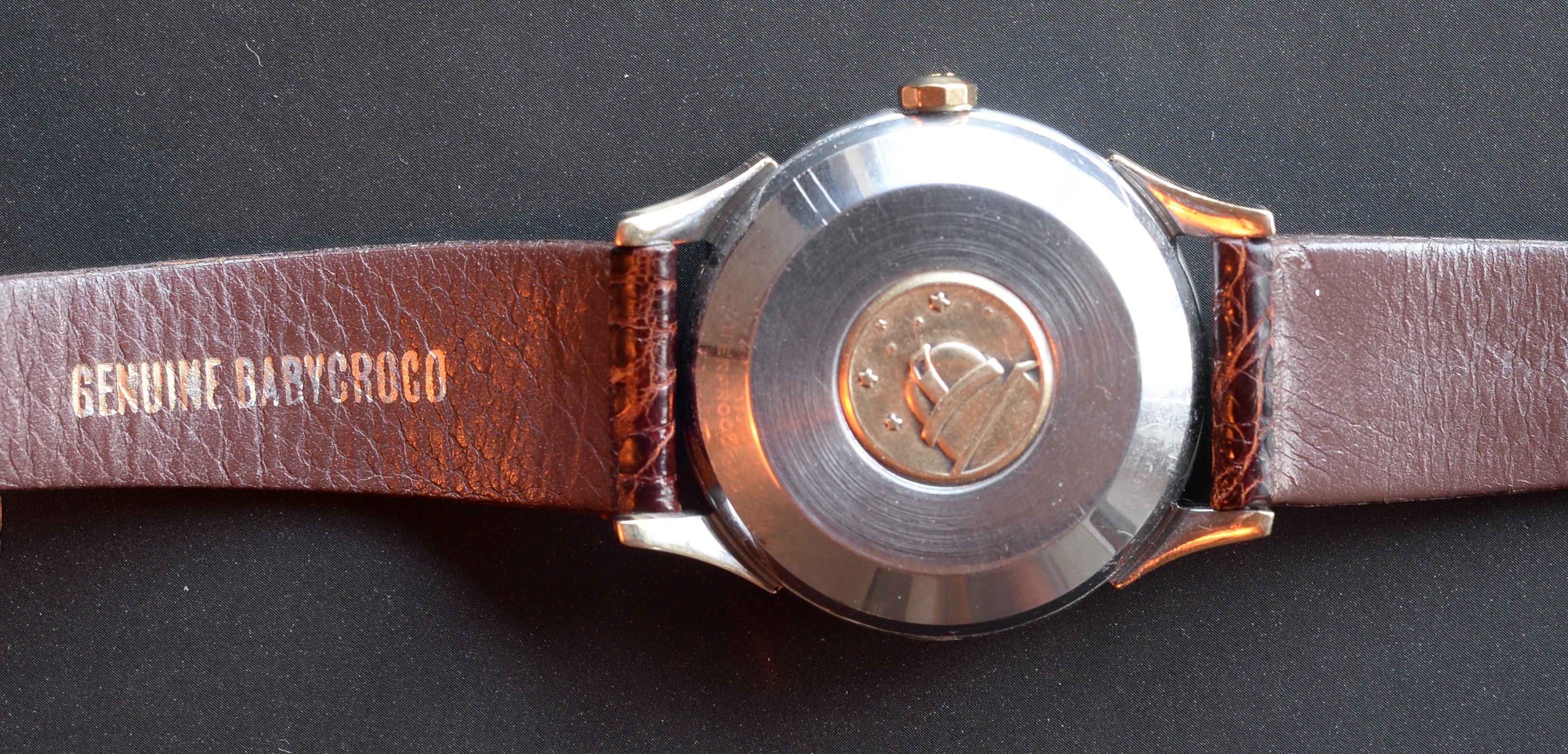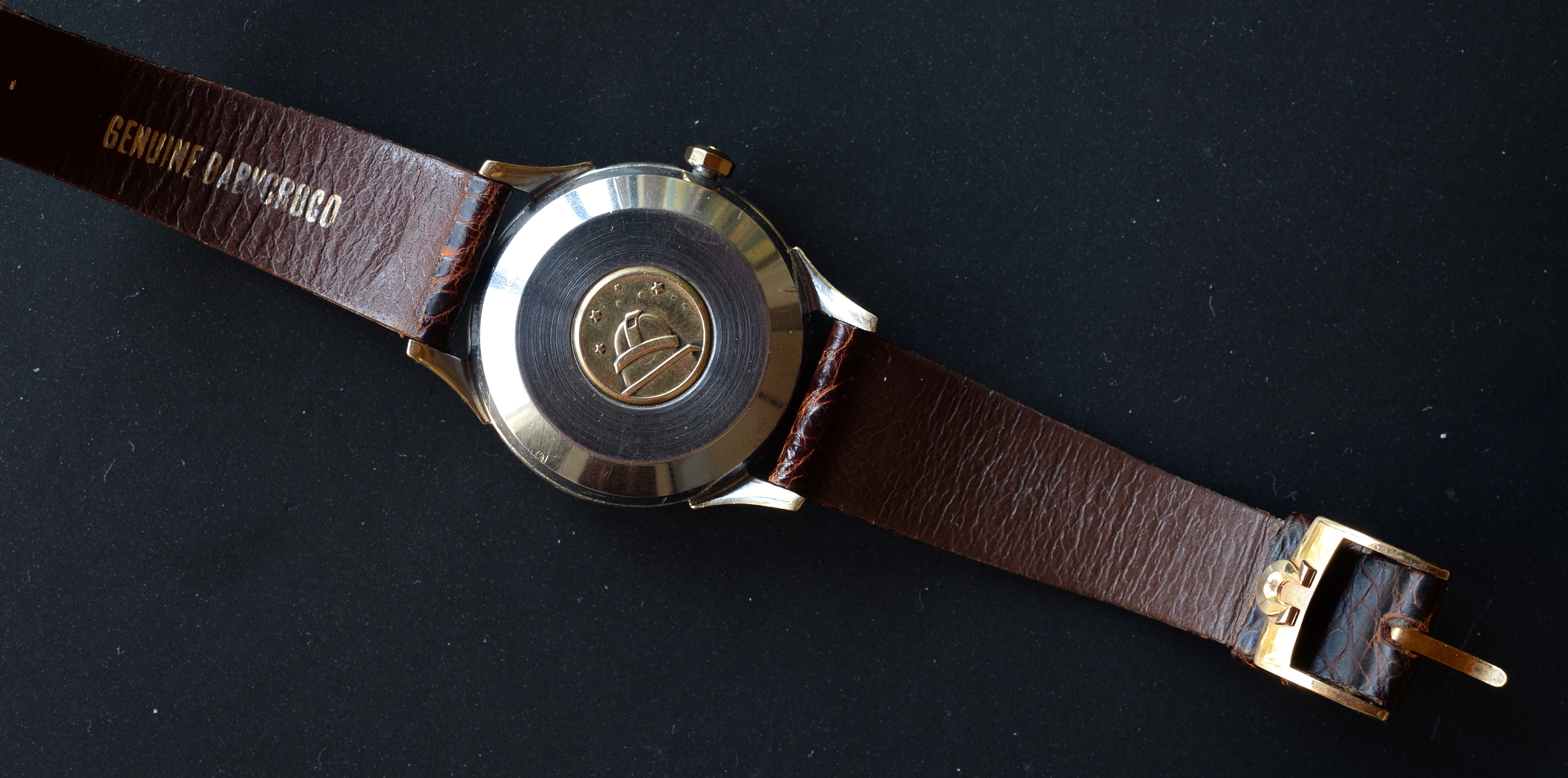 Case: Gold capped steel, 18k gold bezel. 34.5mm without crown. Caseback with well-defined stars, observatory and text. Lug width 18mm, drilled lugs.