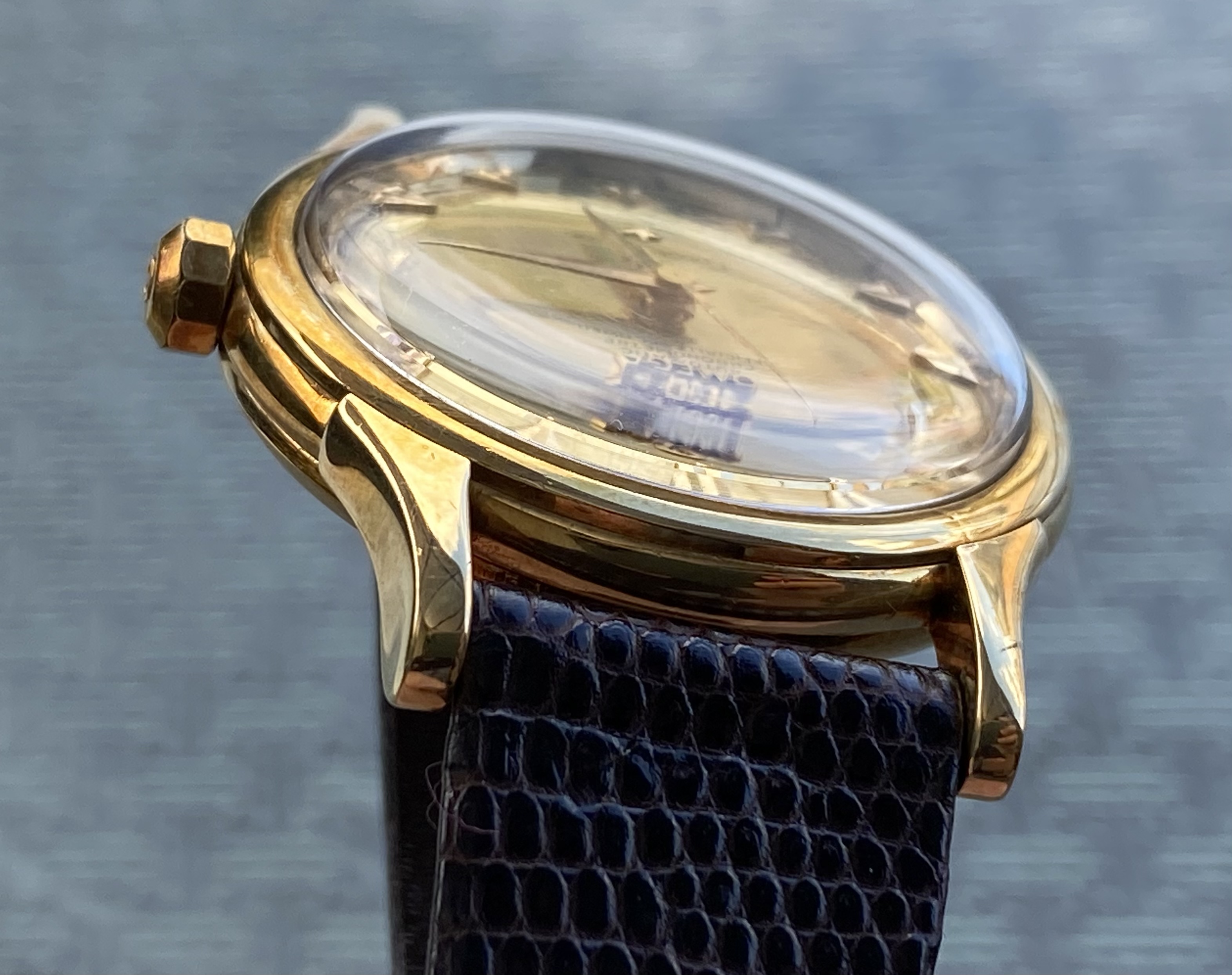 The 18k solid cold case is in nice shape but has definitely met the polishing wheel, still it looks very nice and retains the original shape. The same can be said of the bezel which is now a bit rounded, and the caseback seems to have been refinished probably to remove some tool marks but its just on the chamfered edge, the central portion seems to be untouched and the medallion is the crispiest one I have seen. The dark yellow gold case has developed a nice tarnish which I find atractive, although it could easily be removed if desired.