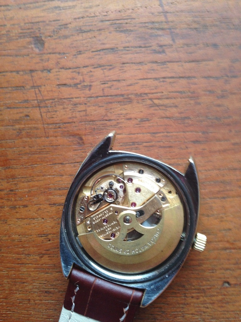 564 movement, clean except the rotor looks dirty. Original crown and crystal.