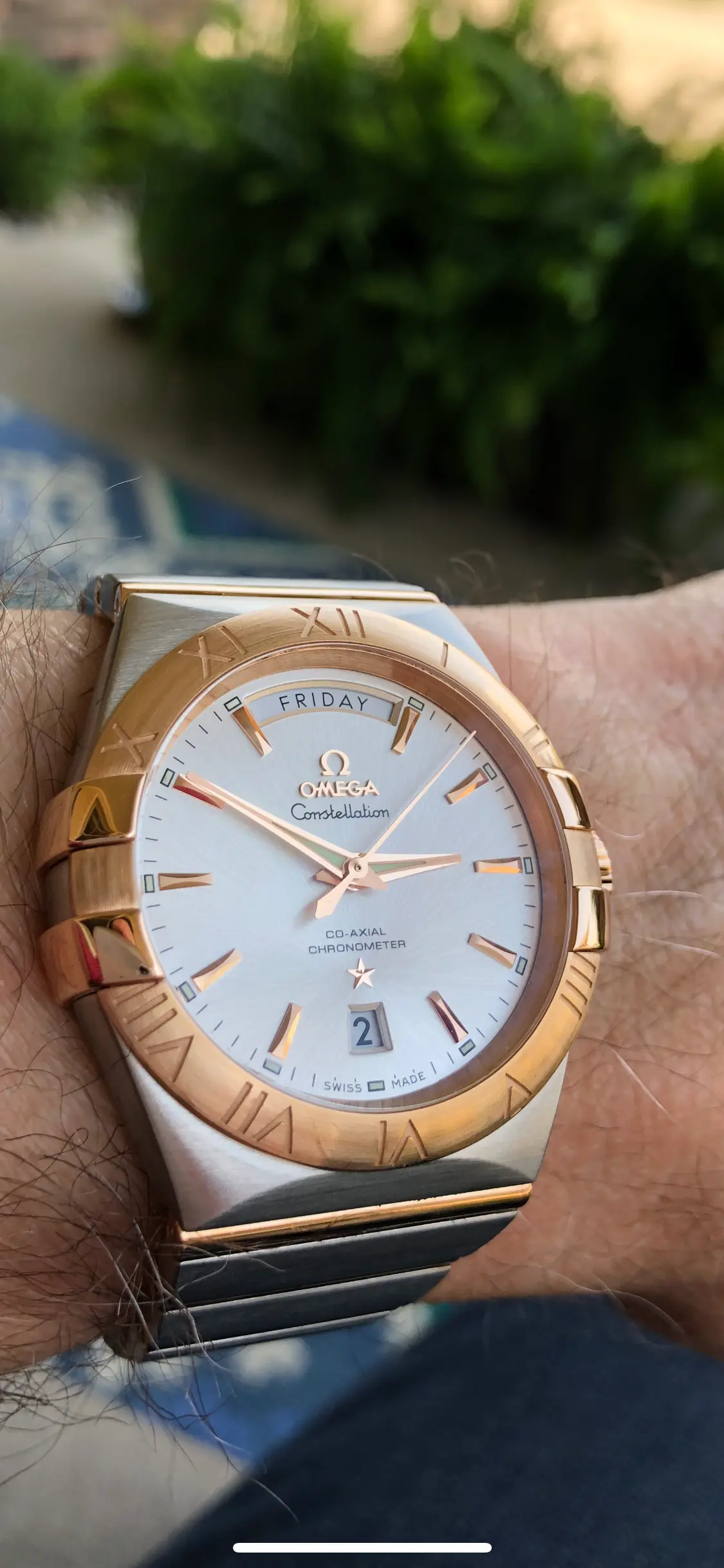 ·I got into watches 5 years or so ago. Owned an Omega Constellation Day Date 38mm in Sedna Gold with the 8602 movement. Not a super popular watch outside of Asia, but I loved it. Also owned a 38.5mm Aqua Terra Good Planet. Sold them both to go through my Rolex phase, as I bought an Explorer and 36mm DJ. Now the Rolex have moved on (did well in the sale) and the Omega Day Date is back on my wrist, this time in yellow gold, which I prefer. 123.20.38.22.02.002. I missed it! Here’s the old and new.