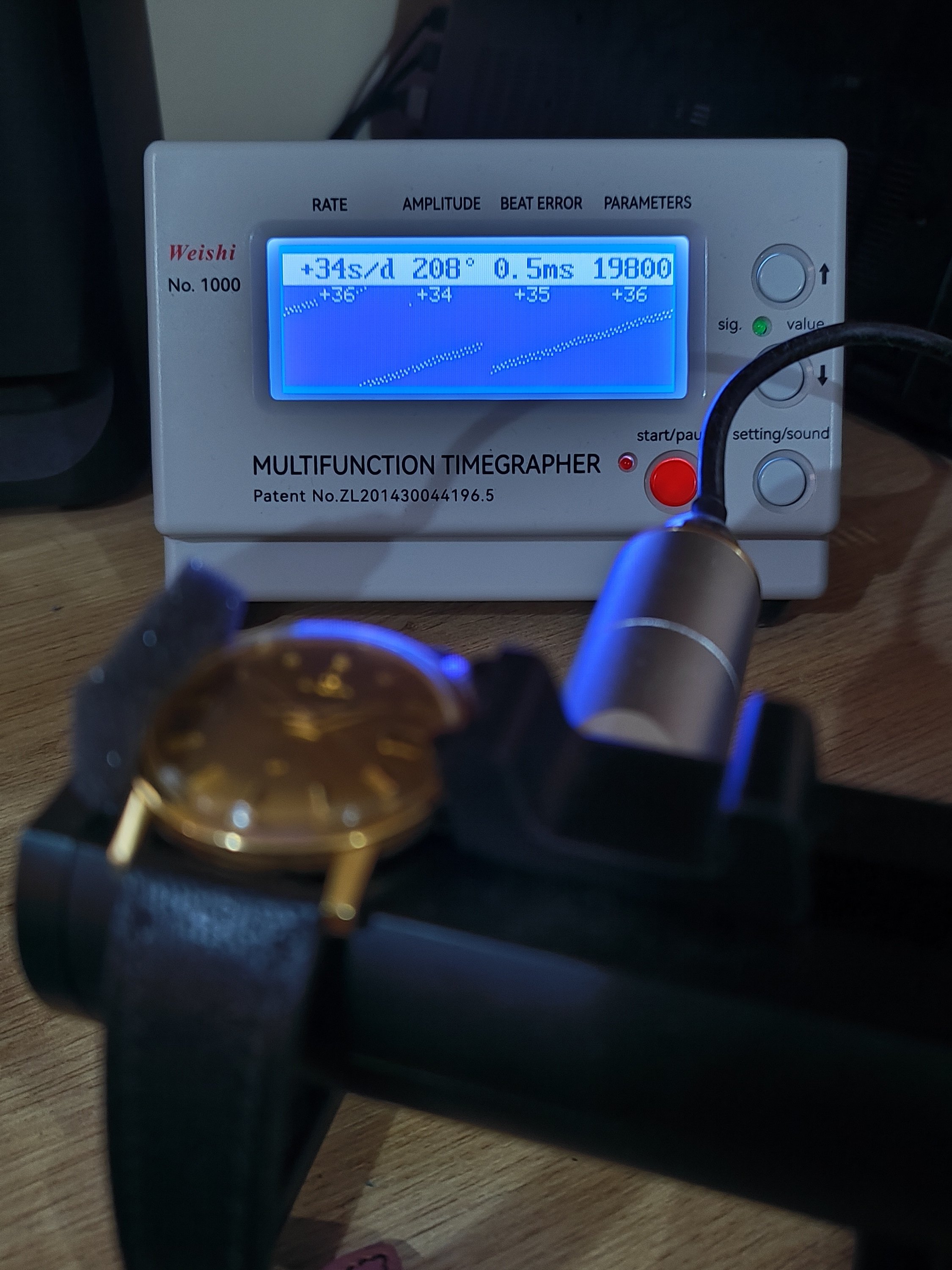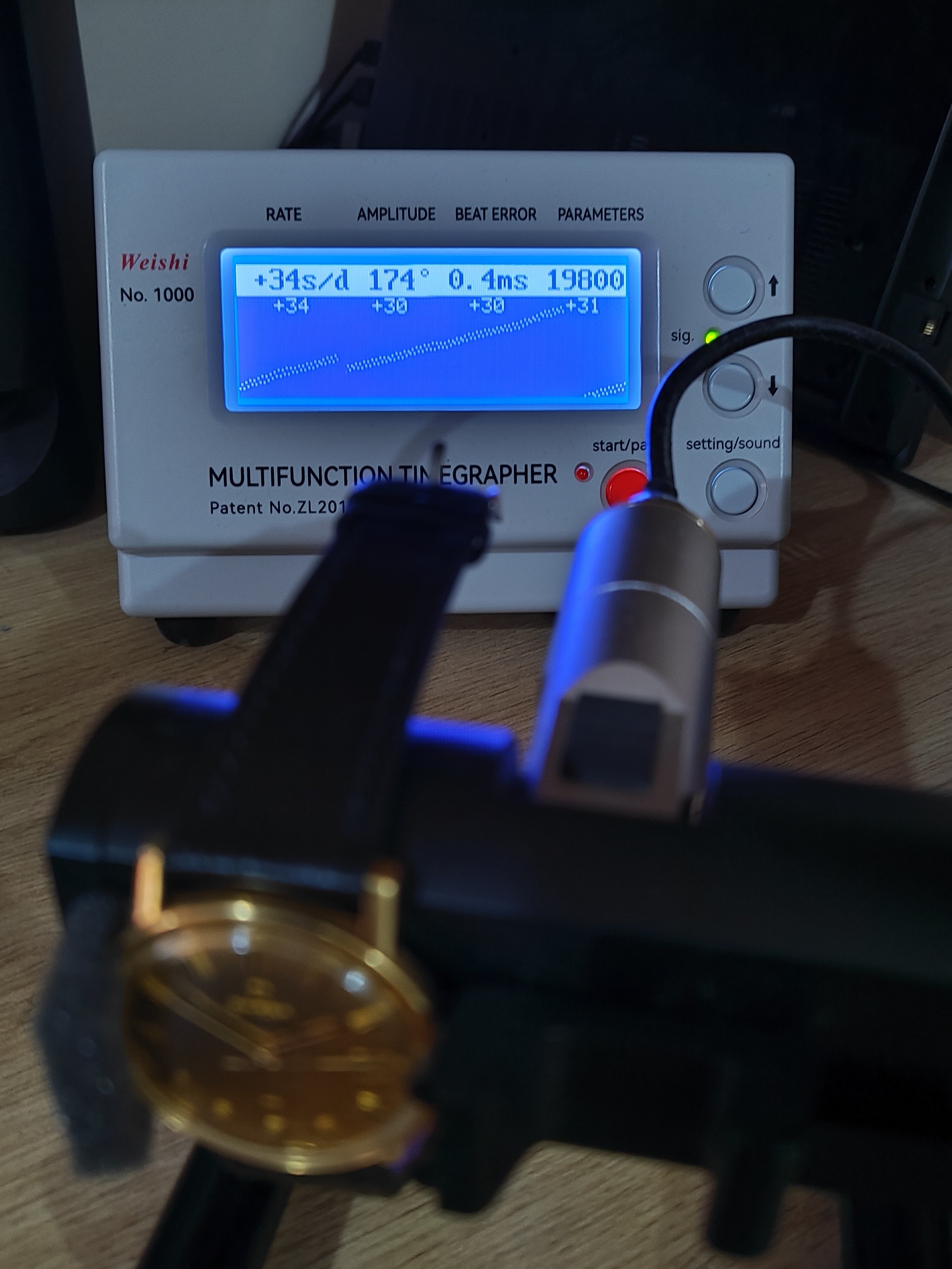 The following results were measured by me with the watch in full wind using a Weishi 1000 and lift angle set at 52 degrees. I left the watch for about a minute to stabilize in each position.