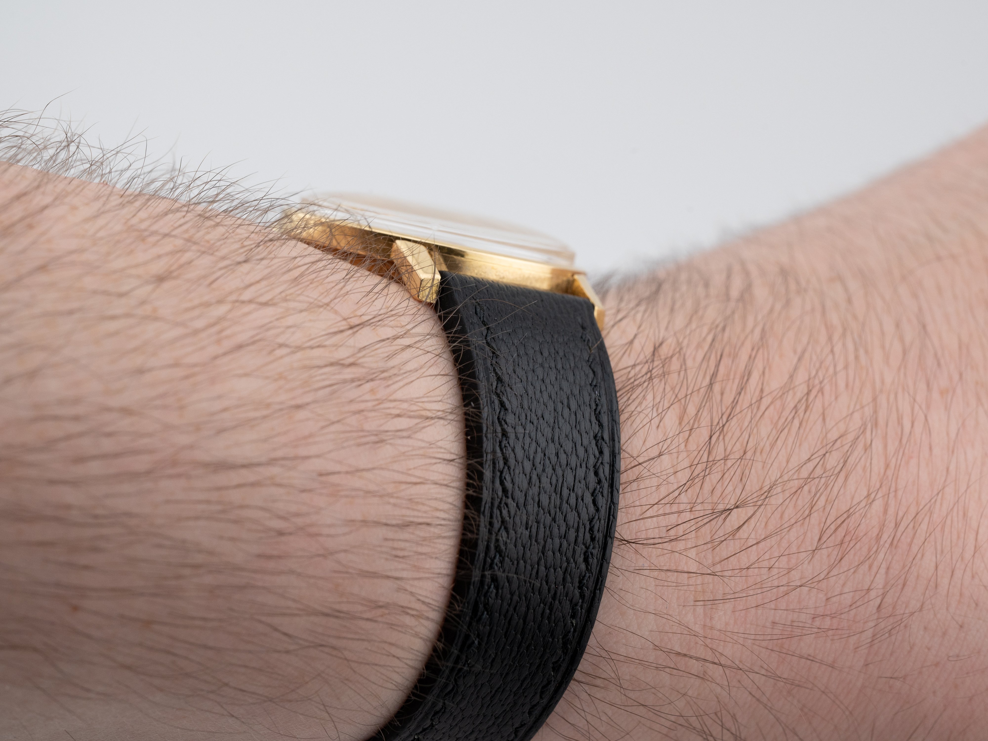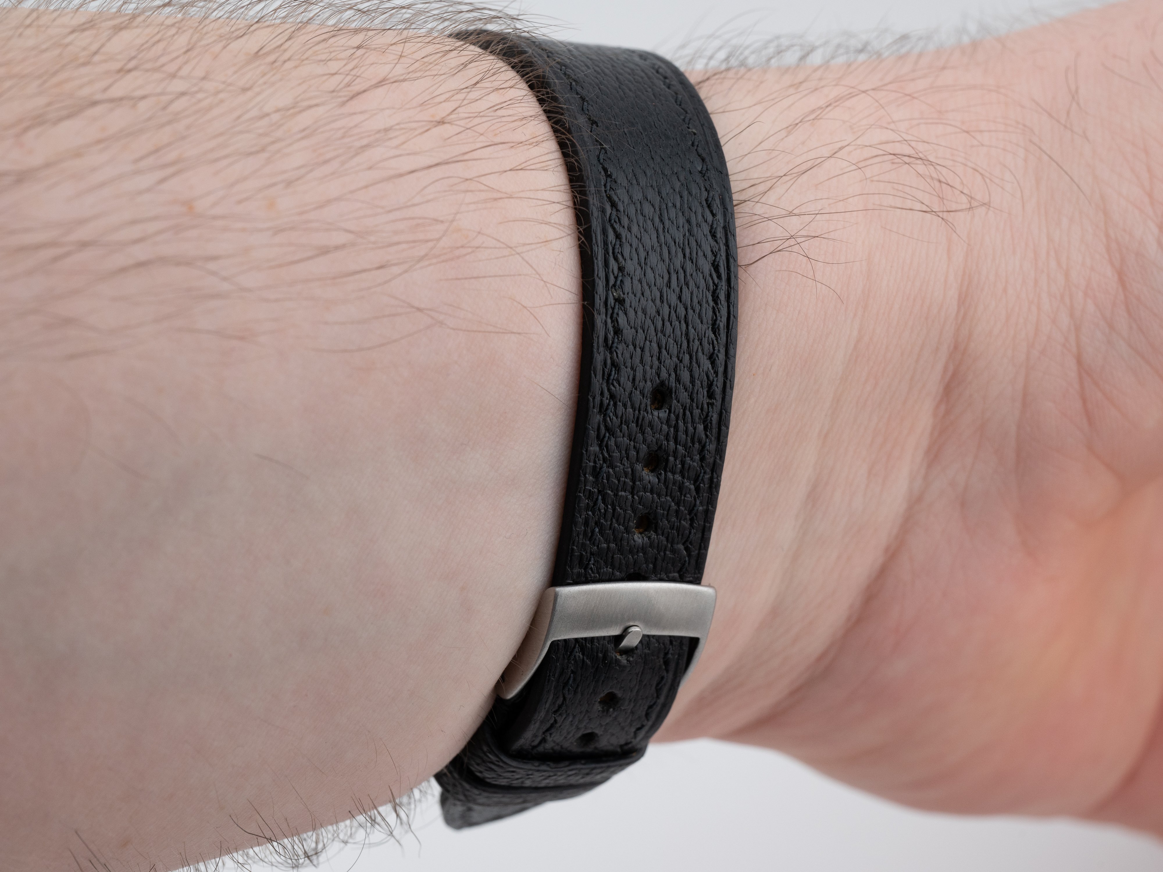 Included is an alran all black slim leather strap from Tuns, sized at 130/80mm with a 16mm generic buckle.