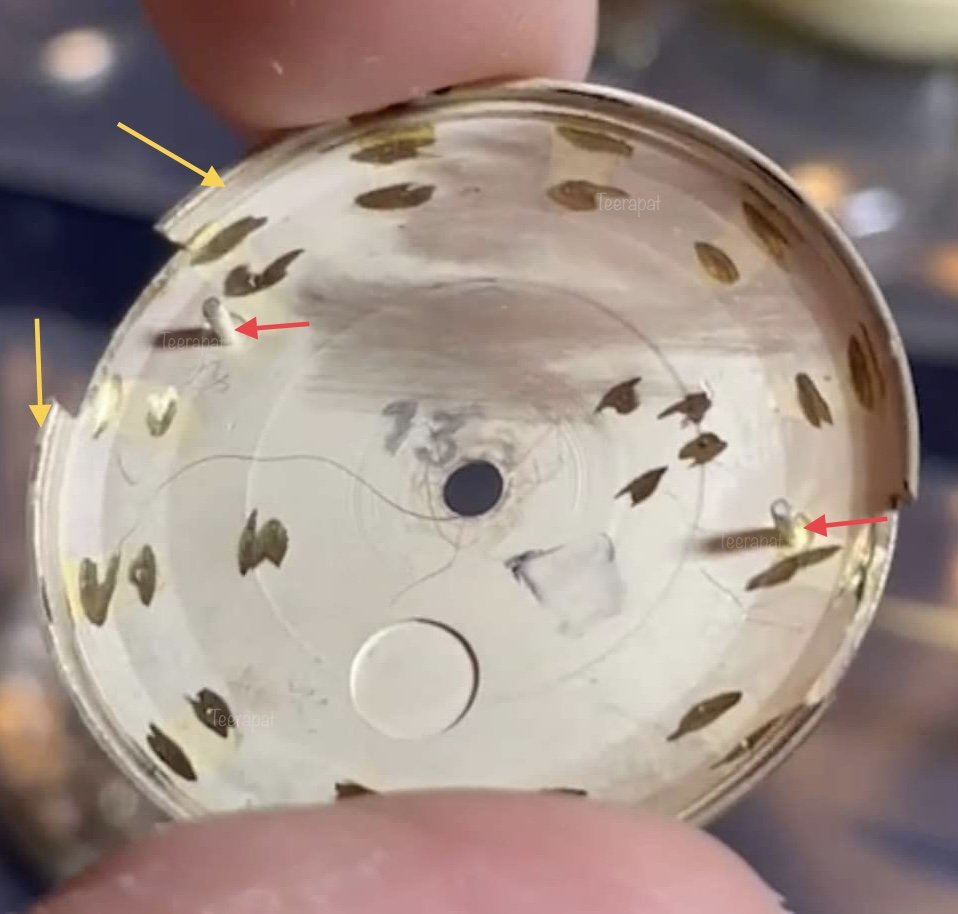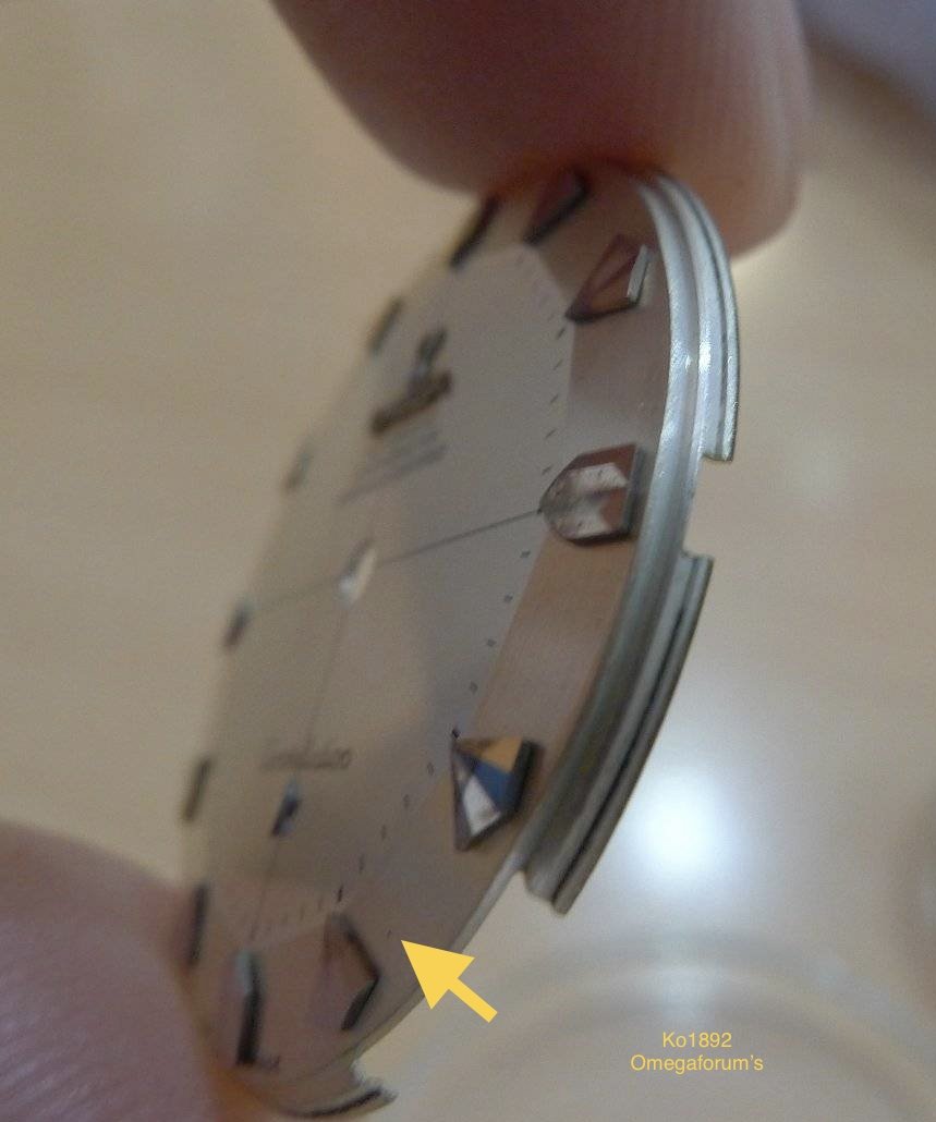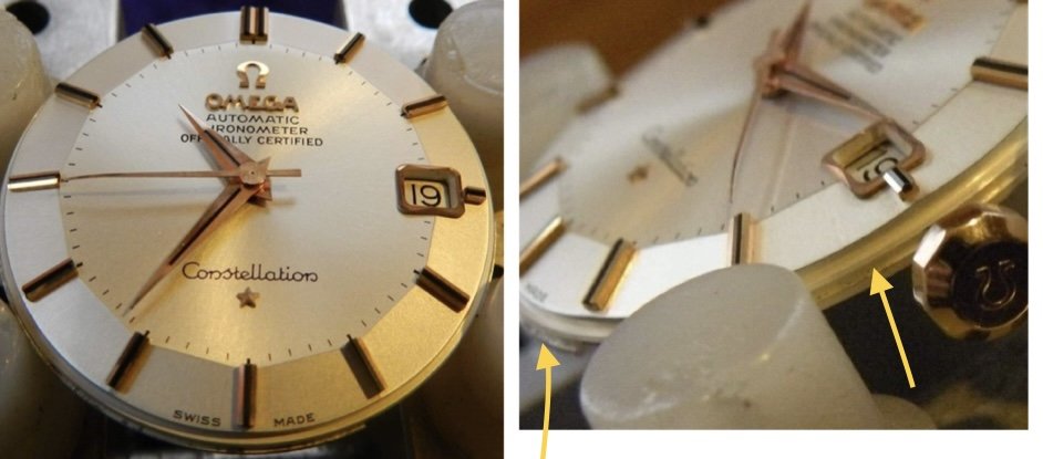 Please note that the correct dial for the dogleg case will have the elevated rim of dial (the yellow arrows) and two dial legs (the red arrows).