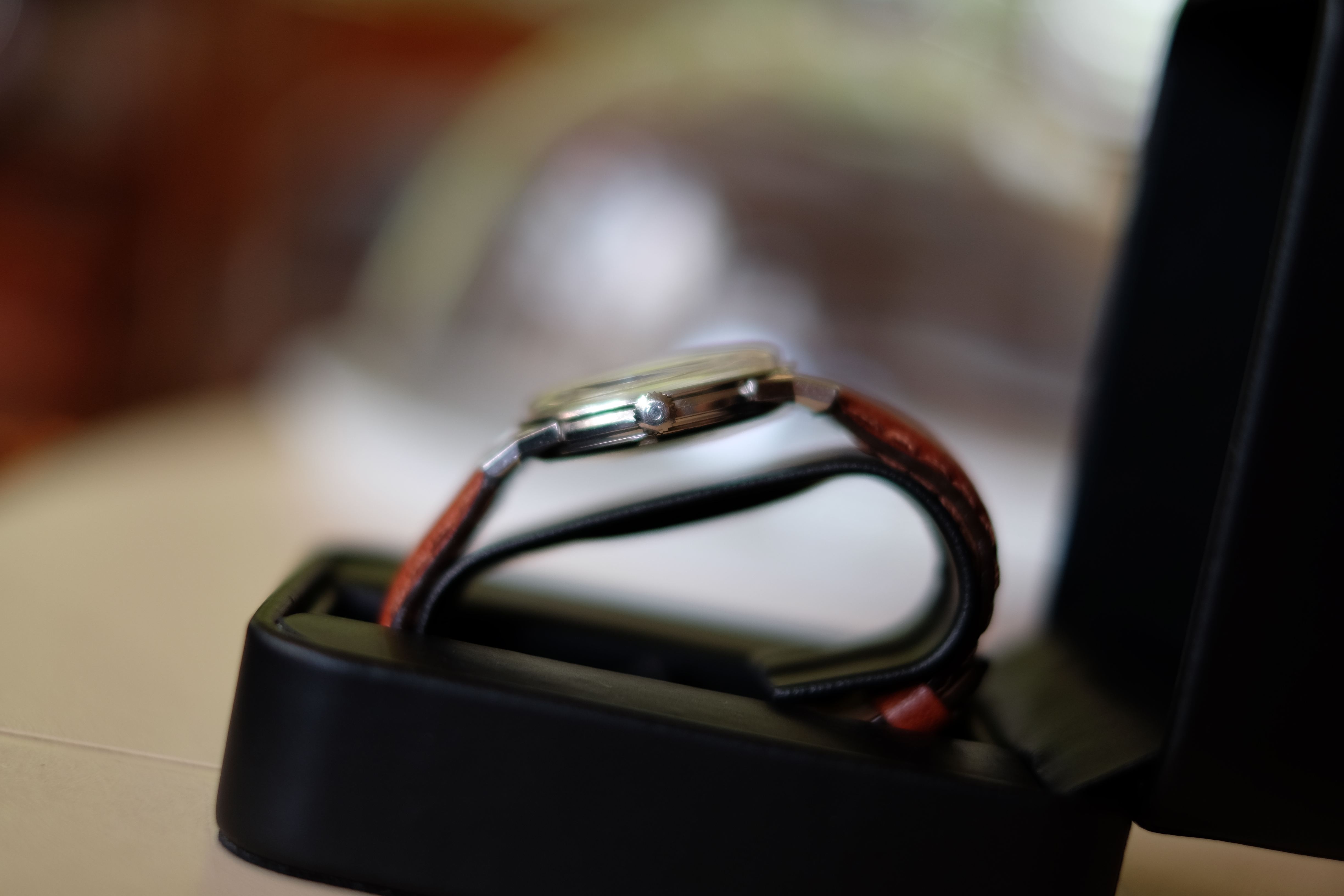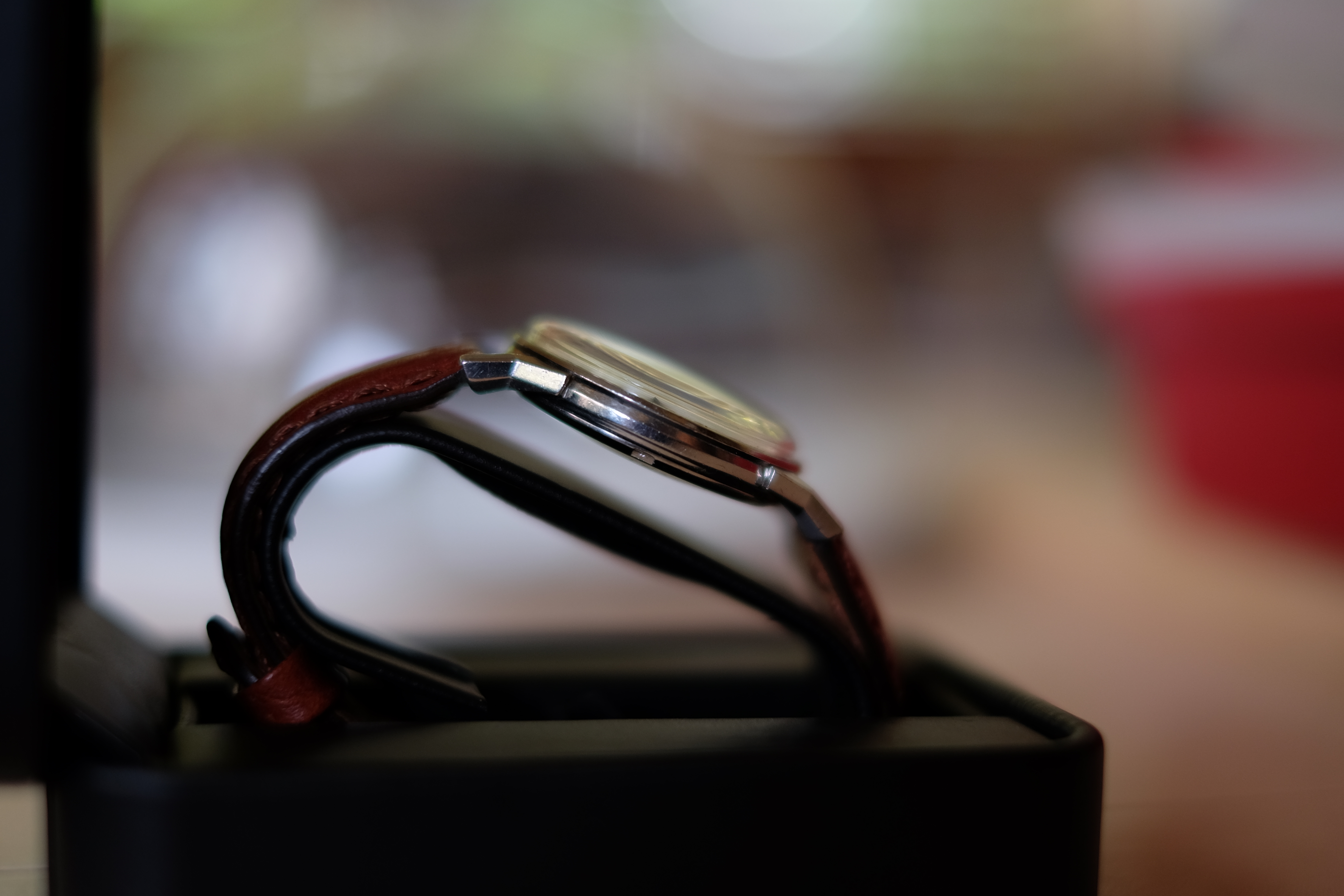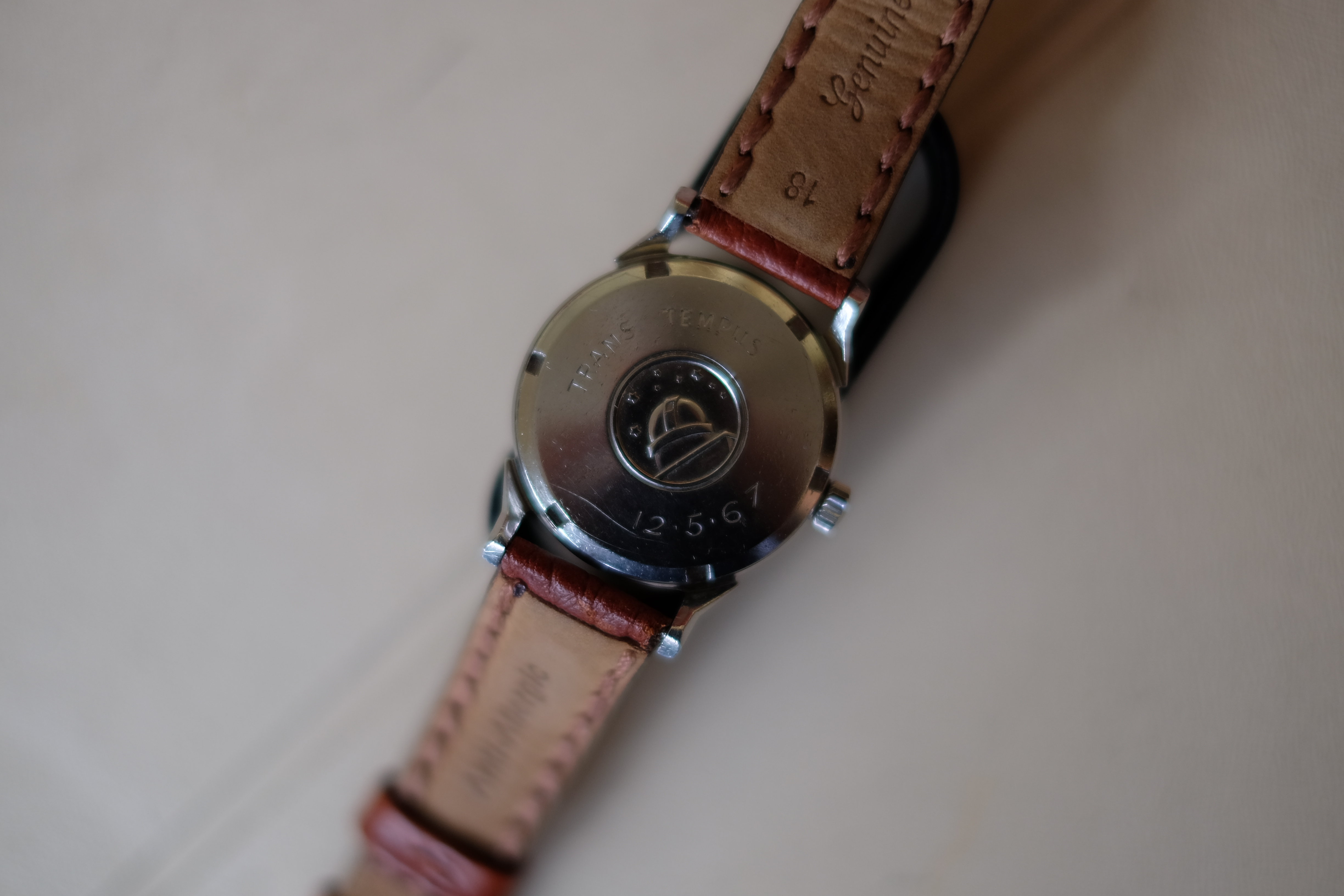 It has a sharp, SS case which appears to have never been polished and also has the signed crown. Although generally not a fan of caseback engraving, I do like this particular, evocative message which often leaves me pondering on the watch’s past. Dial is also in really nice condition and the indices are onyx inlay.