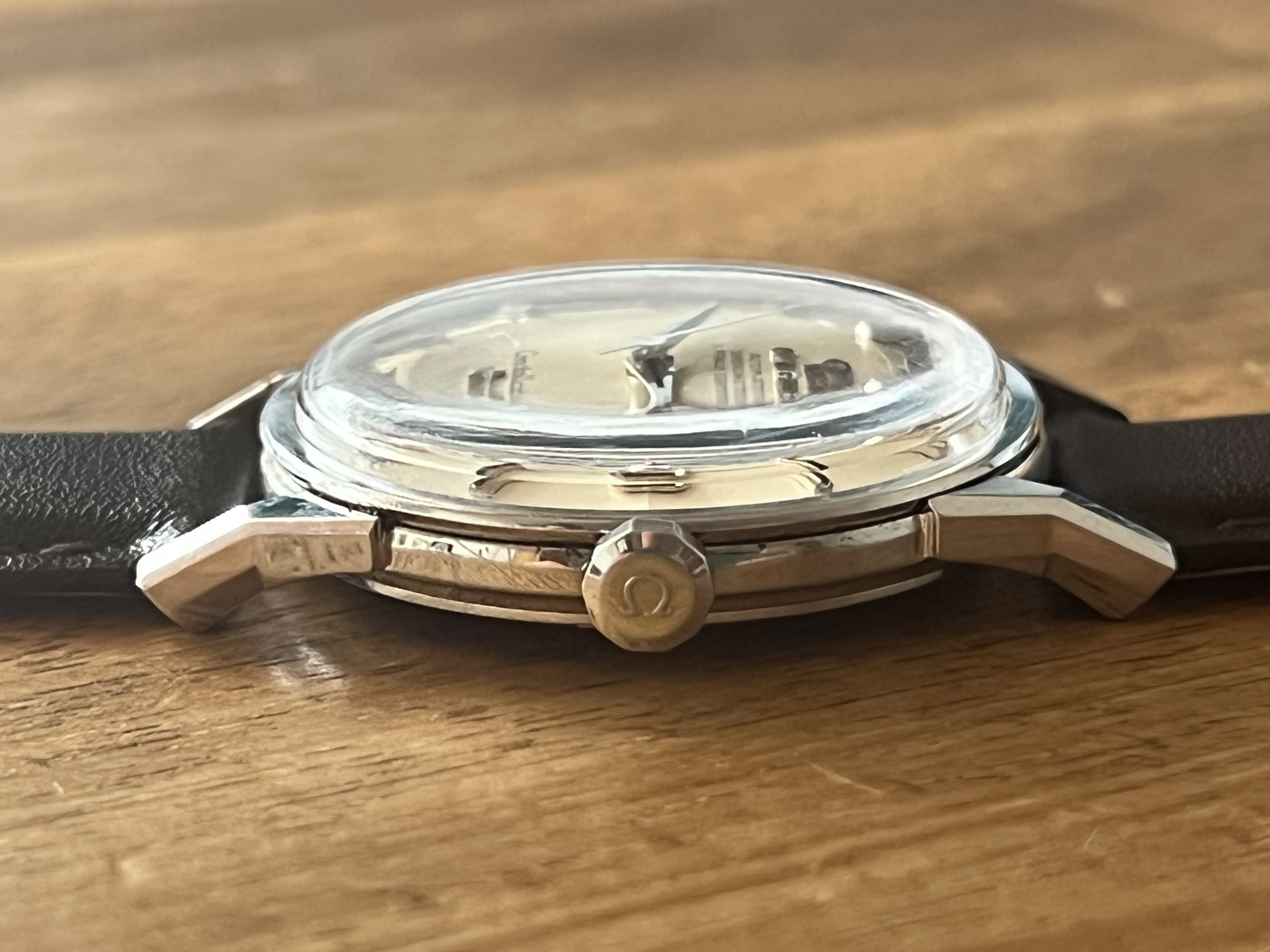 Crown: Original Omega crown, correct thin decagonal for the reference. Not a flat foot logo, so it’s a service item.
