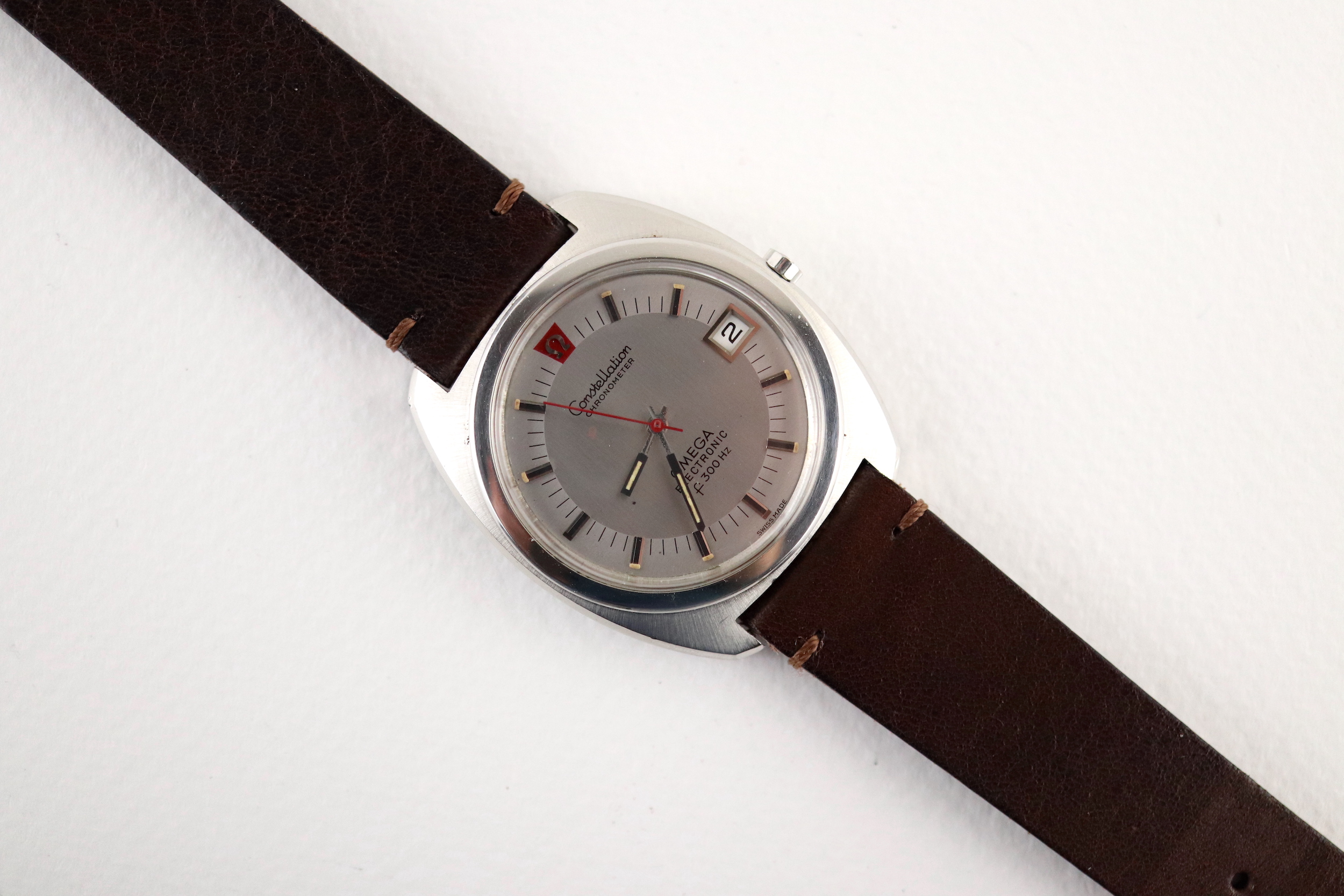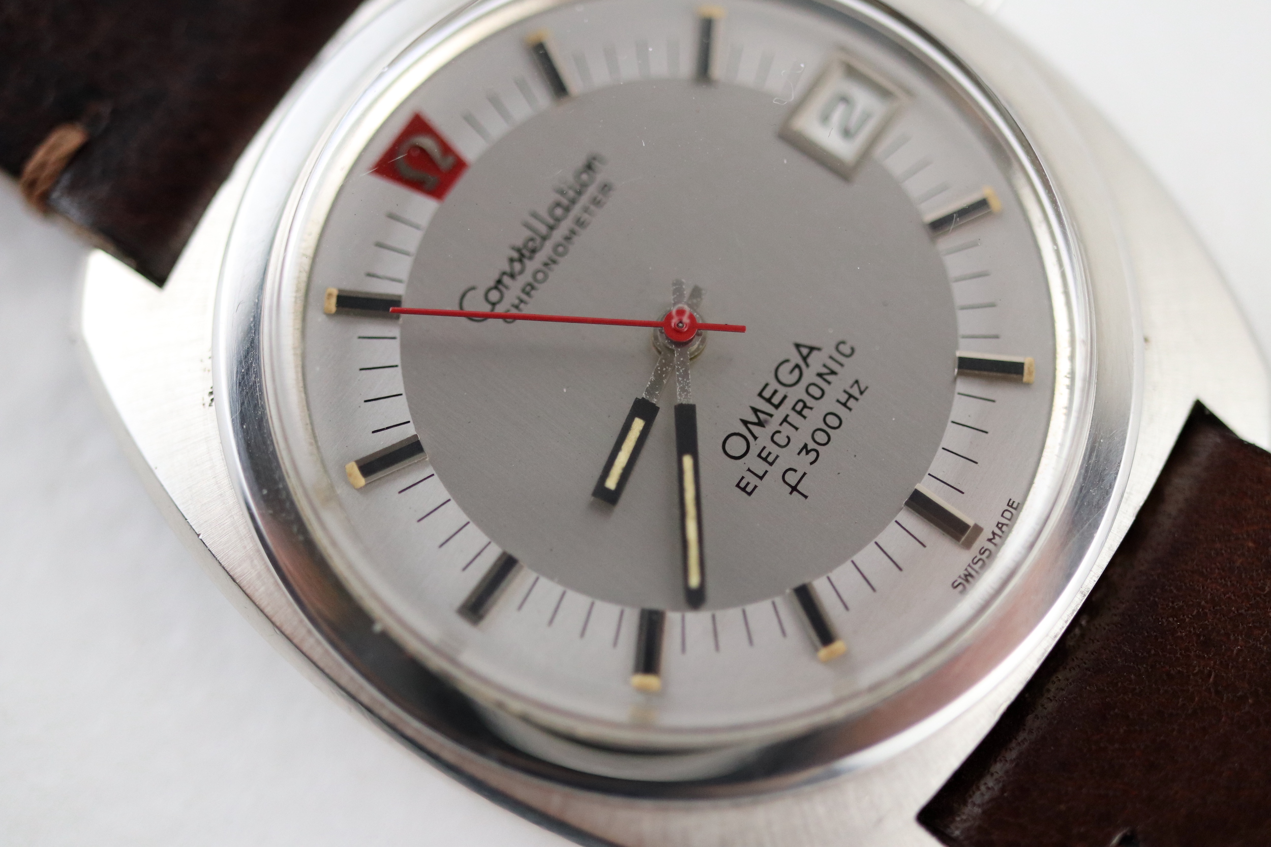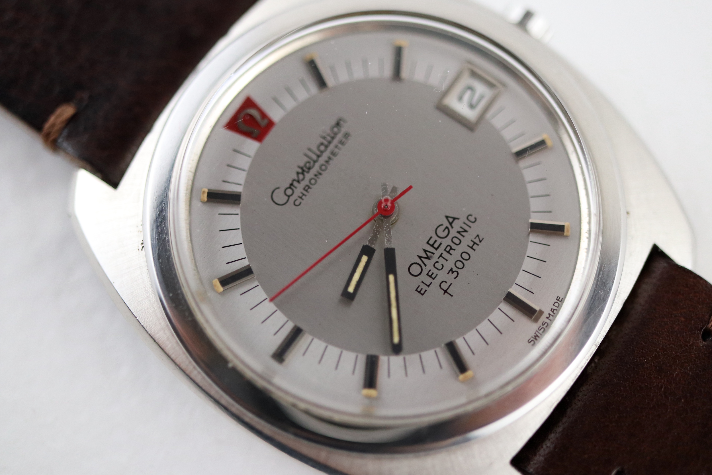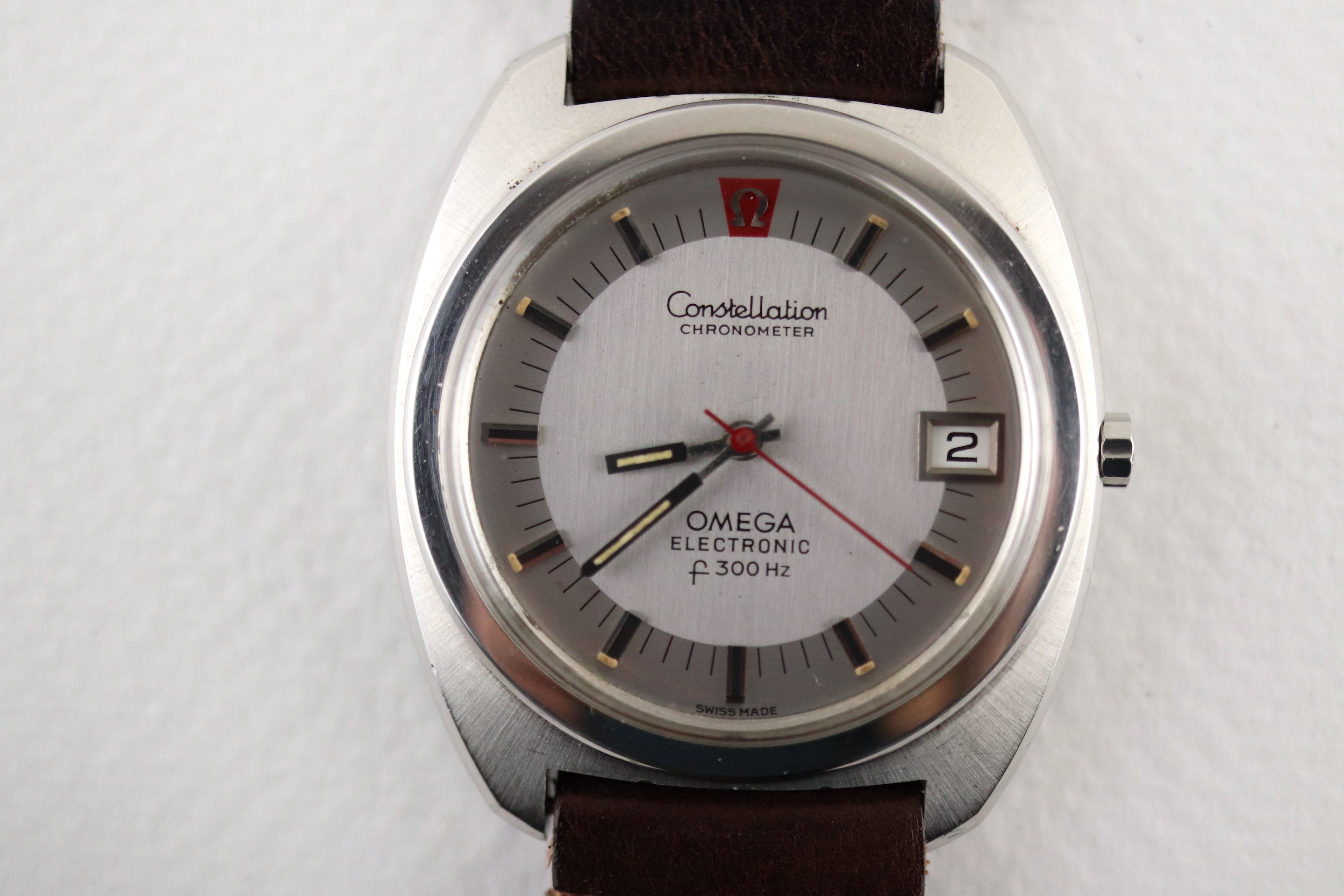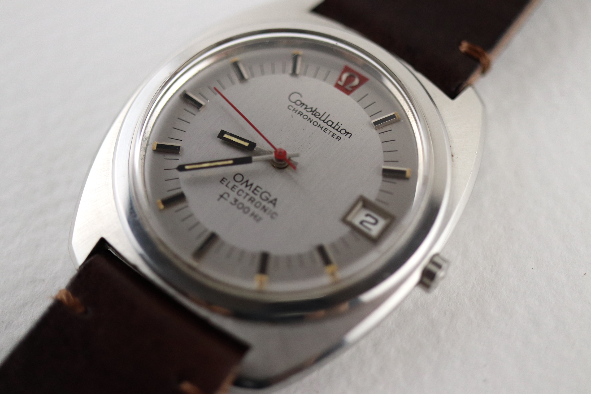 ·For sale, I have an Omega Constellation F300 Ref: 198.002. It has the Caliber 1250 which is an electronic movement. The watch works fine but I don't have any service history. The calendar date changes automatically which often is an issue on these watches. It appears to be all original. New battery installed. The case is very sharp and doesn't appear to have ever been polished. It is missing the gasket on the case back. The serial number would suggest the manufacture date somewhere in 1970. The watch will comes with a new brown leather strap.
