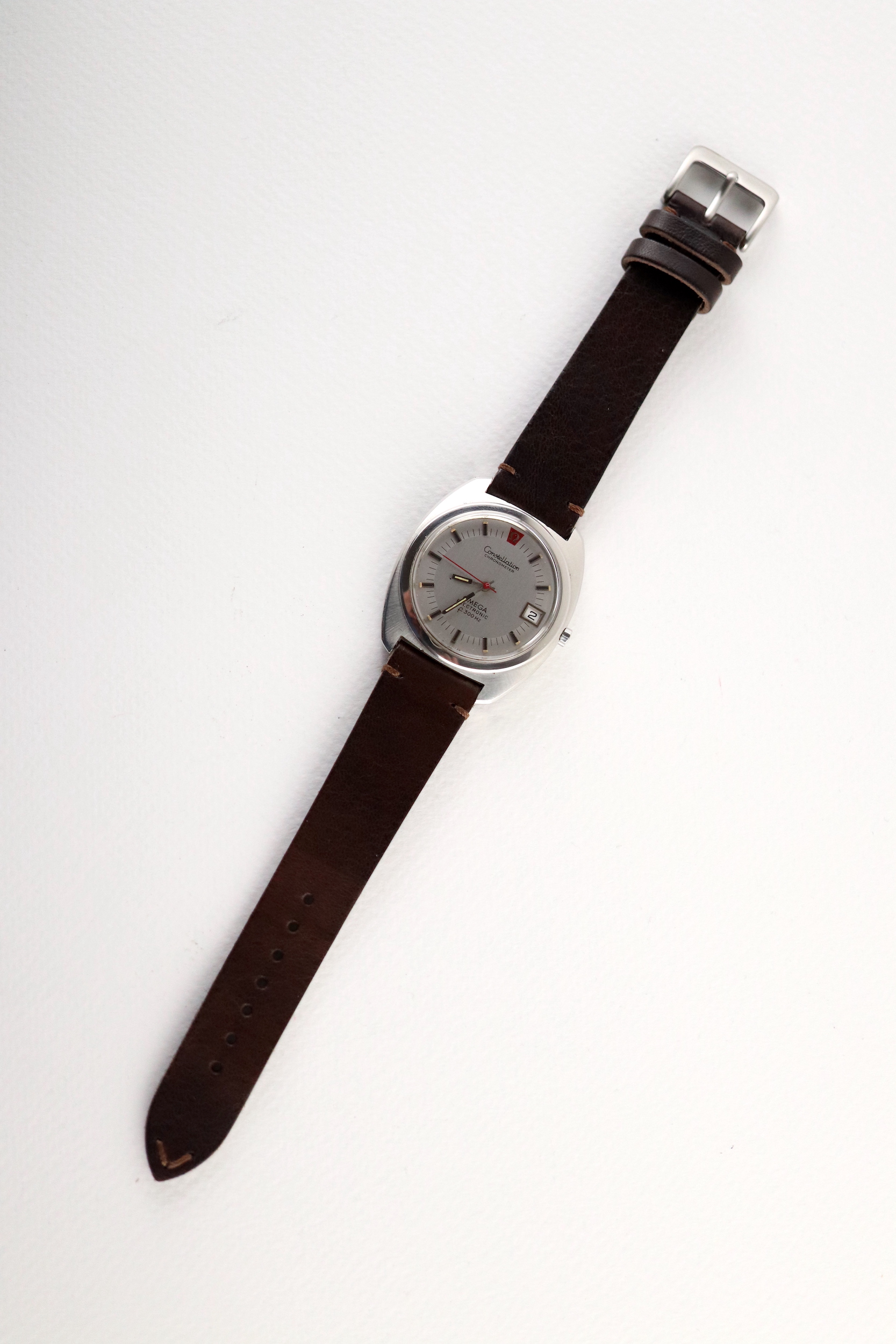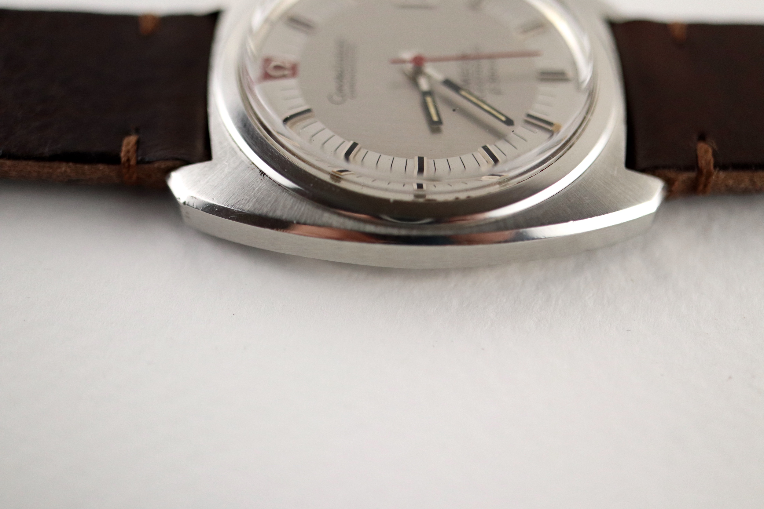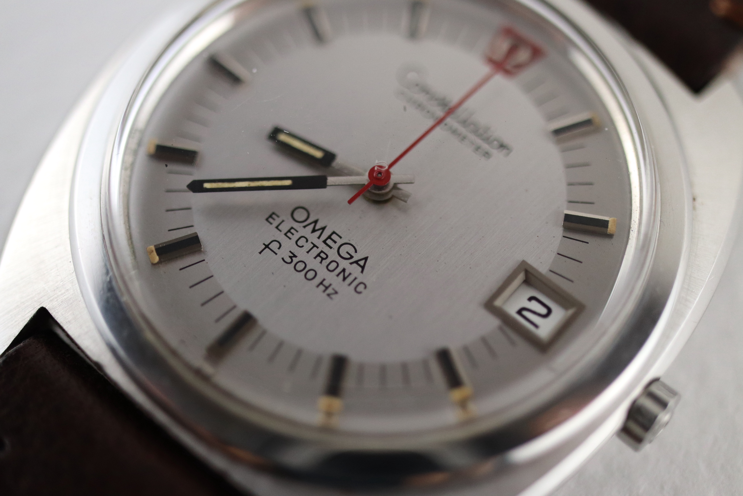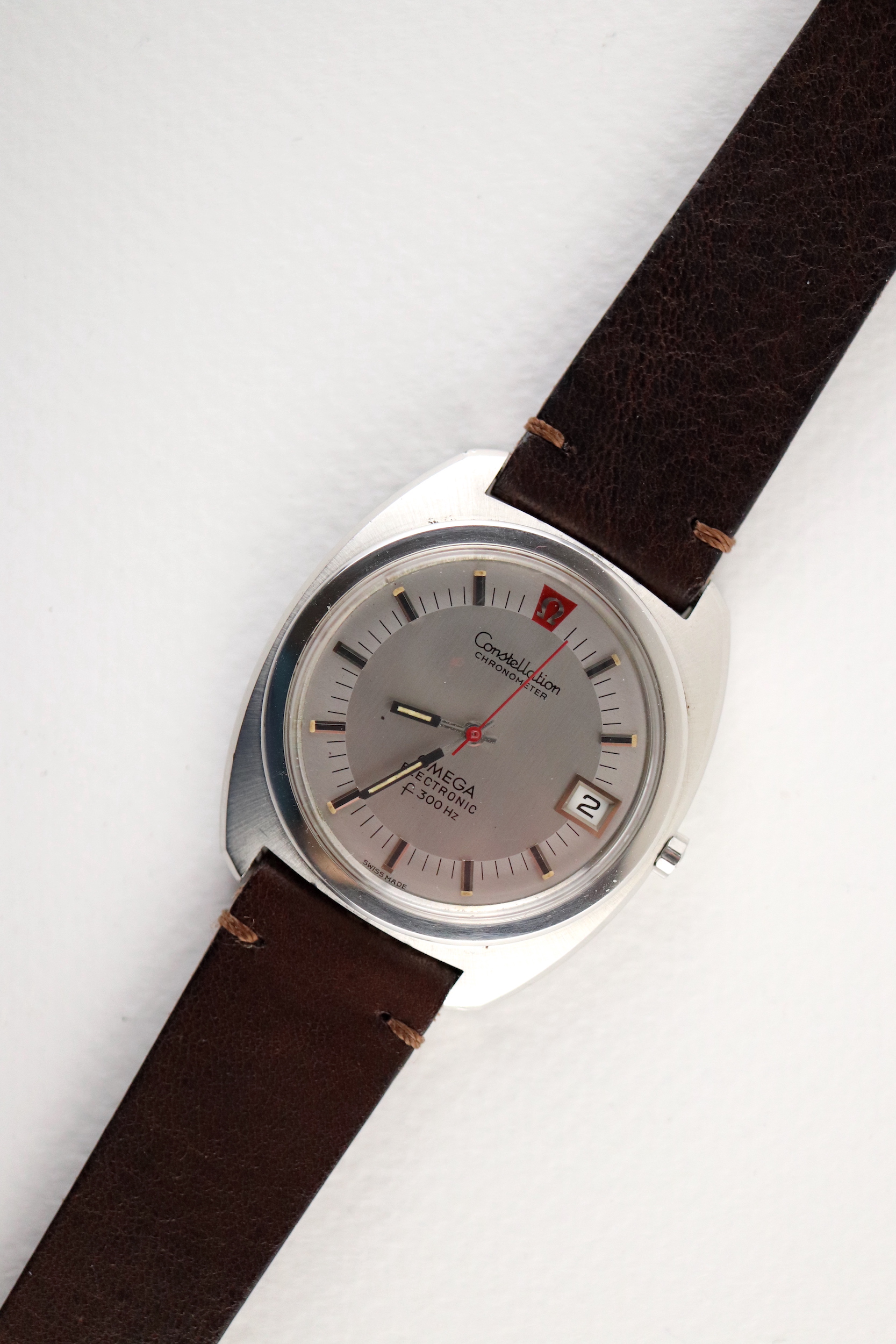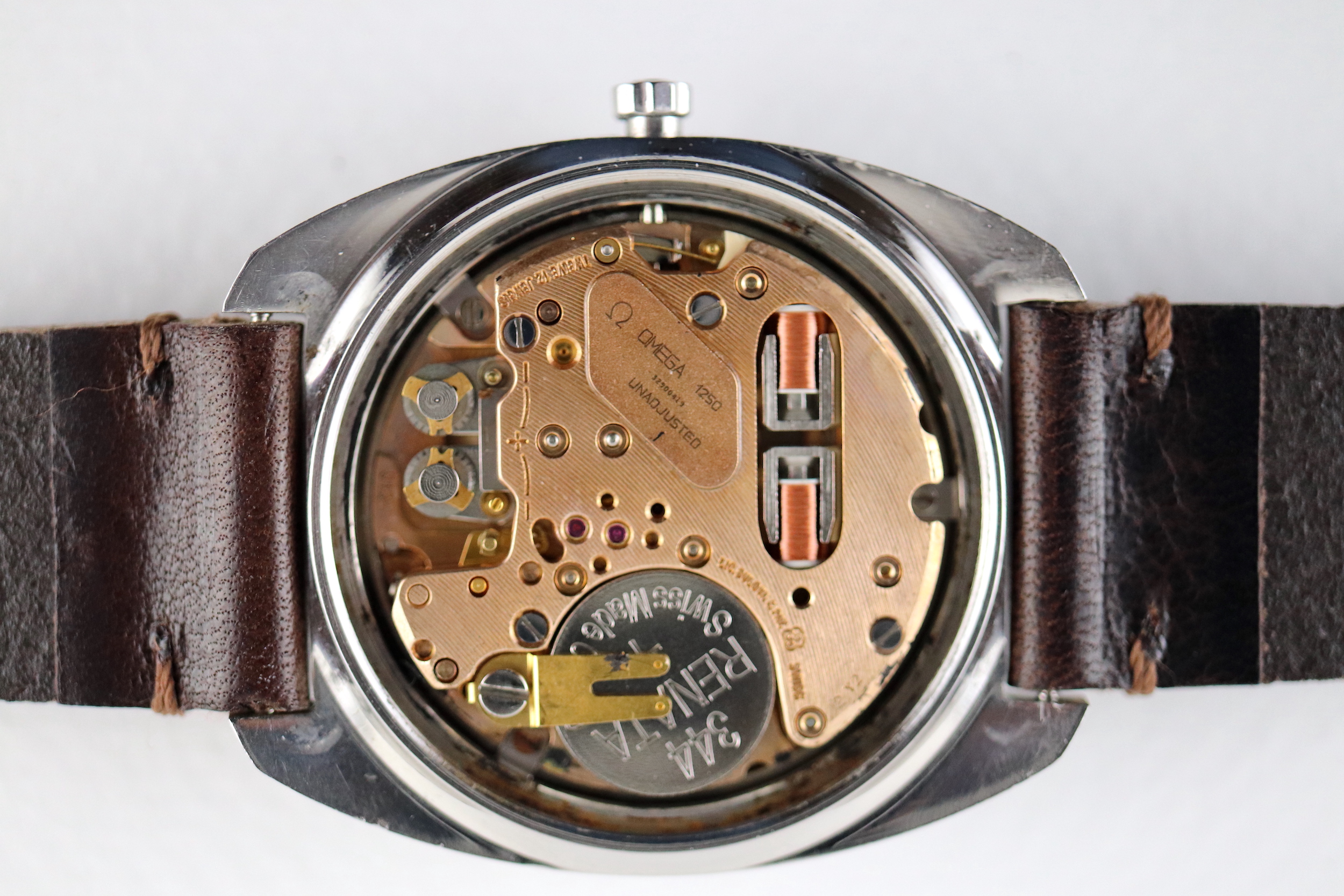 ·For sale, I have an Omega Constellation F300 Ref: 198.002. It has the Caliber 1250 which is an electronic movement. The watch works fine but I don't have any service history. The calendar date changes automatically which often is an issue on these watches. It appears to be all original. New battery installed. The case is very sharp and doesn't appear to have ever been polished. It is missing the gasket on the case back. The serial number would suggest the manufacture date somewhere in 1970. The watch will comes with a new brown leather strap.