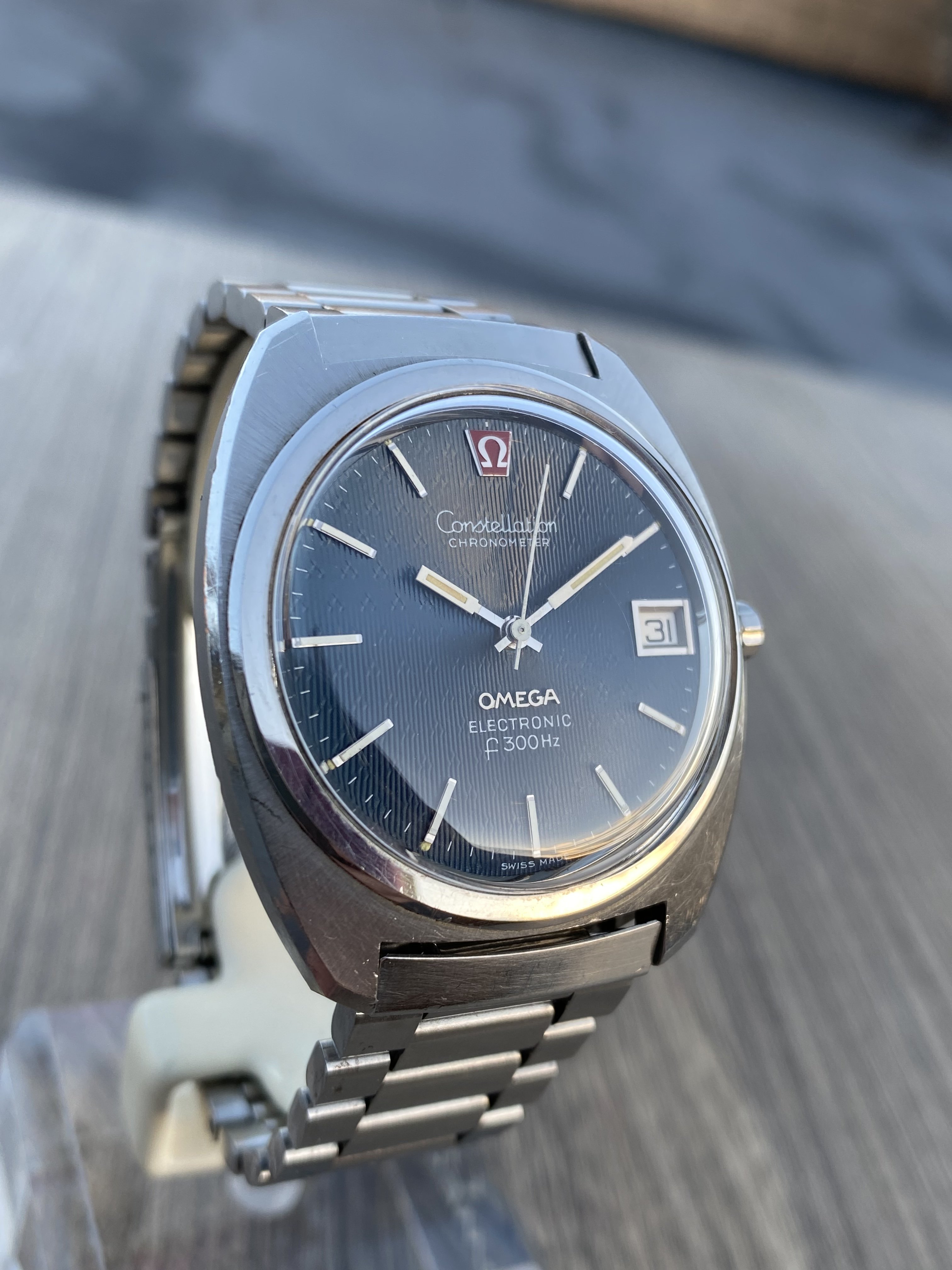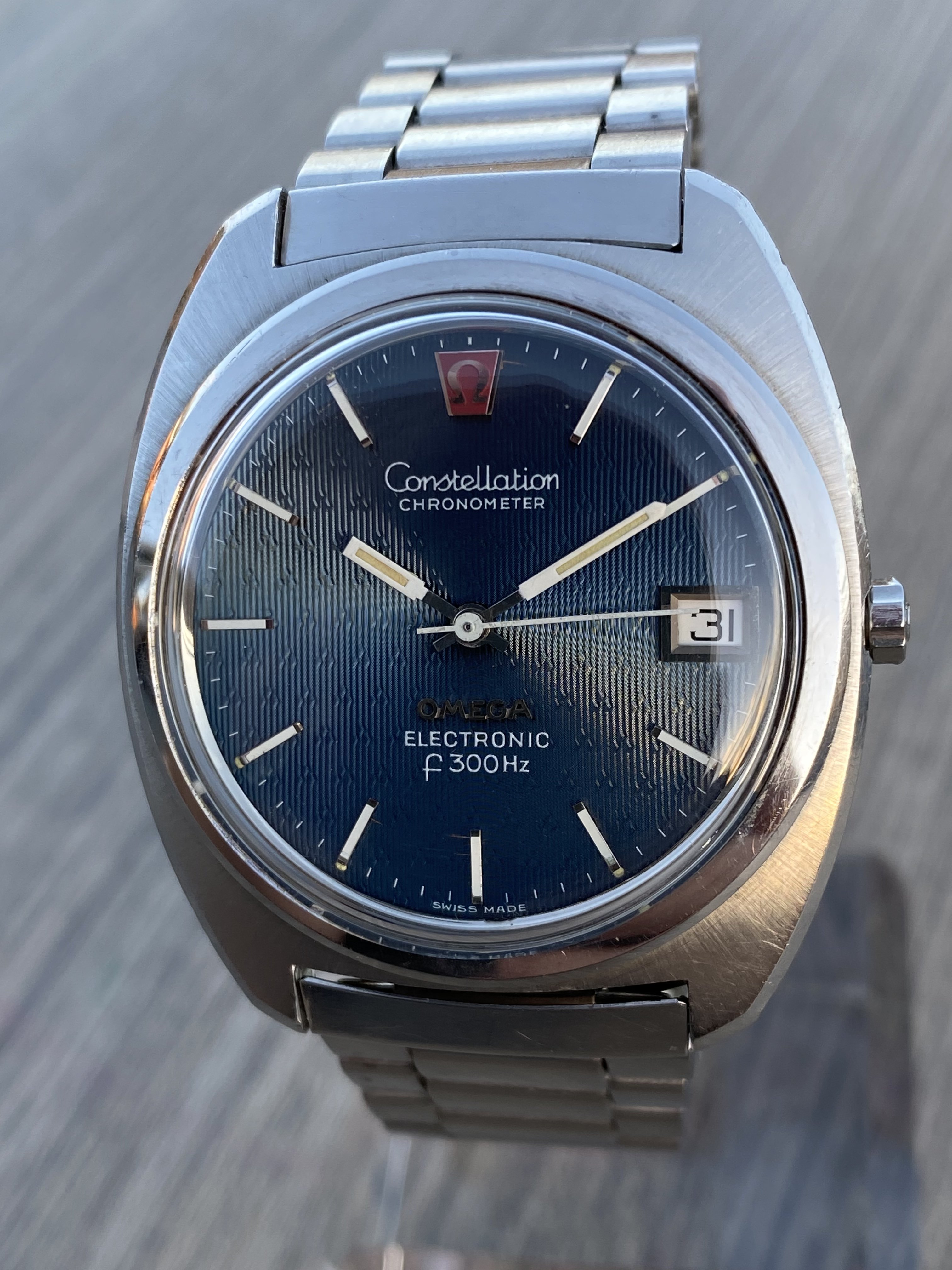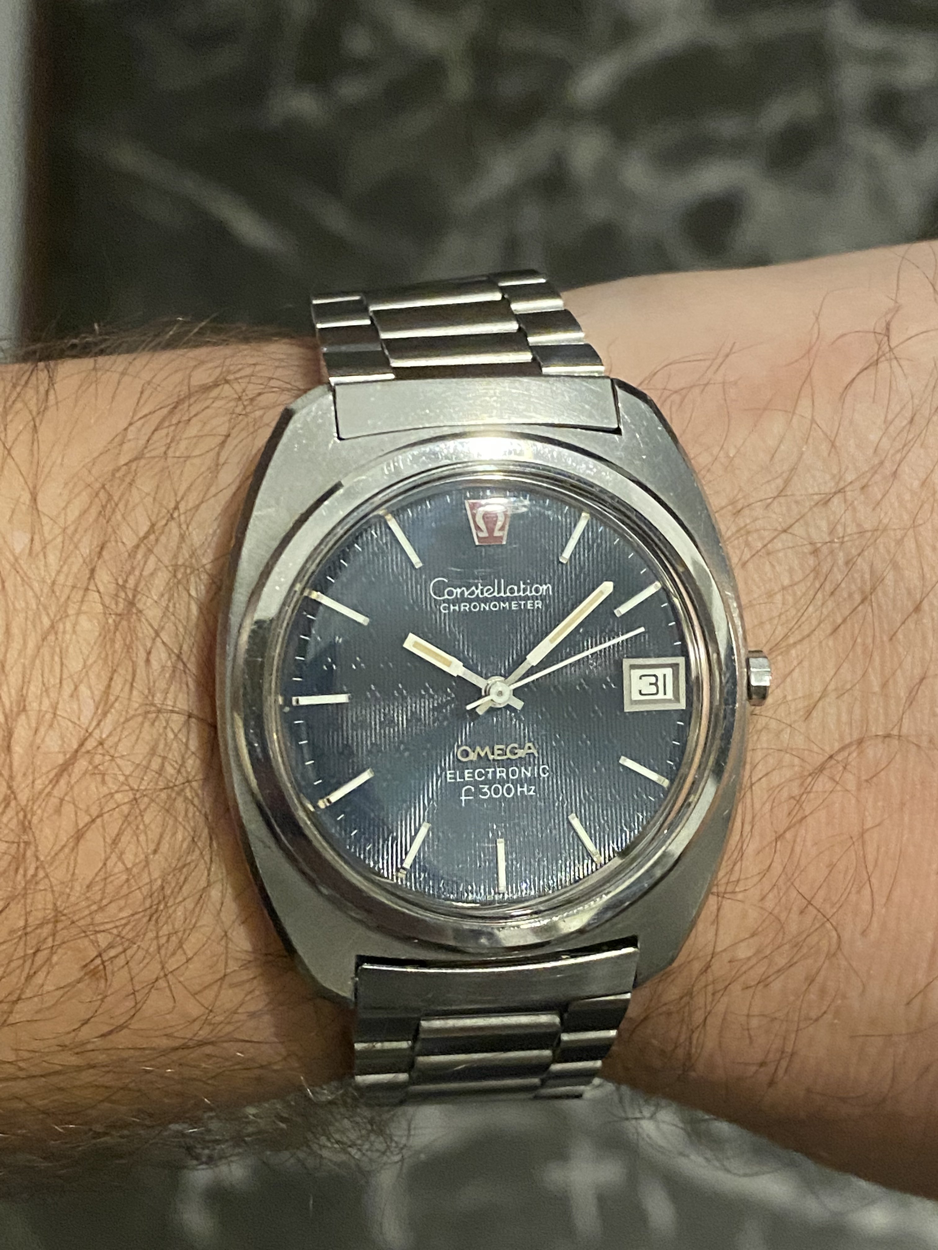 ·Selling my nice Omega 198.002 f300Hz hummer in nice pre-owned condition with original case finish. Exquisite blue dial with a very rare triangular guilloche pattern. Crystal is generic (no logo), battery was changed last year and it’s still ticking strong. I believe the watch is gaining a couple of minutes per month, which AFAIK means it is running within chronometer specs. Service history is unknown but it’s definitely working without issues.