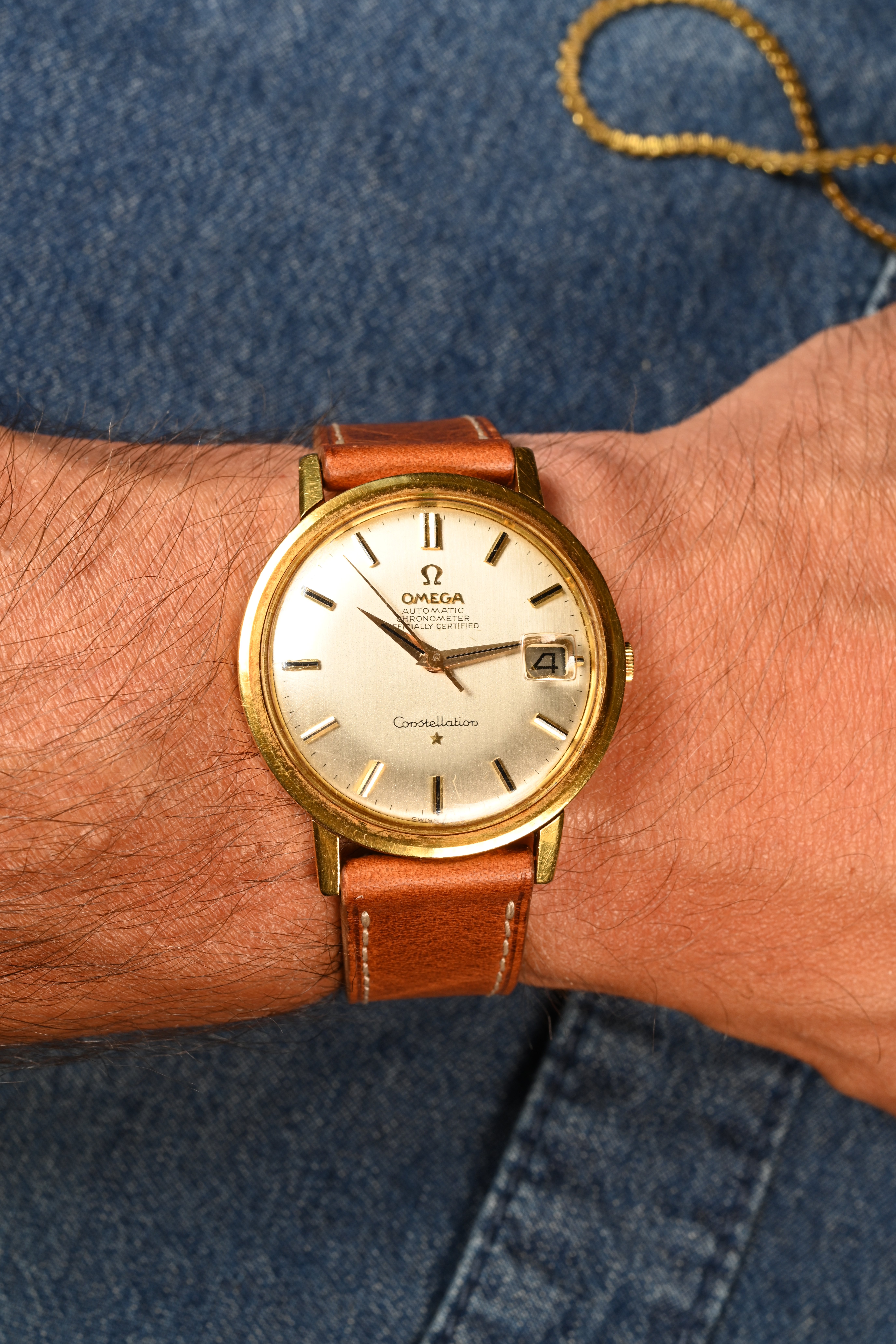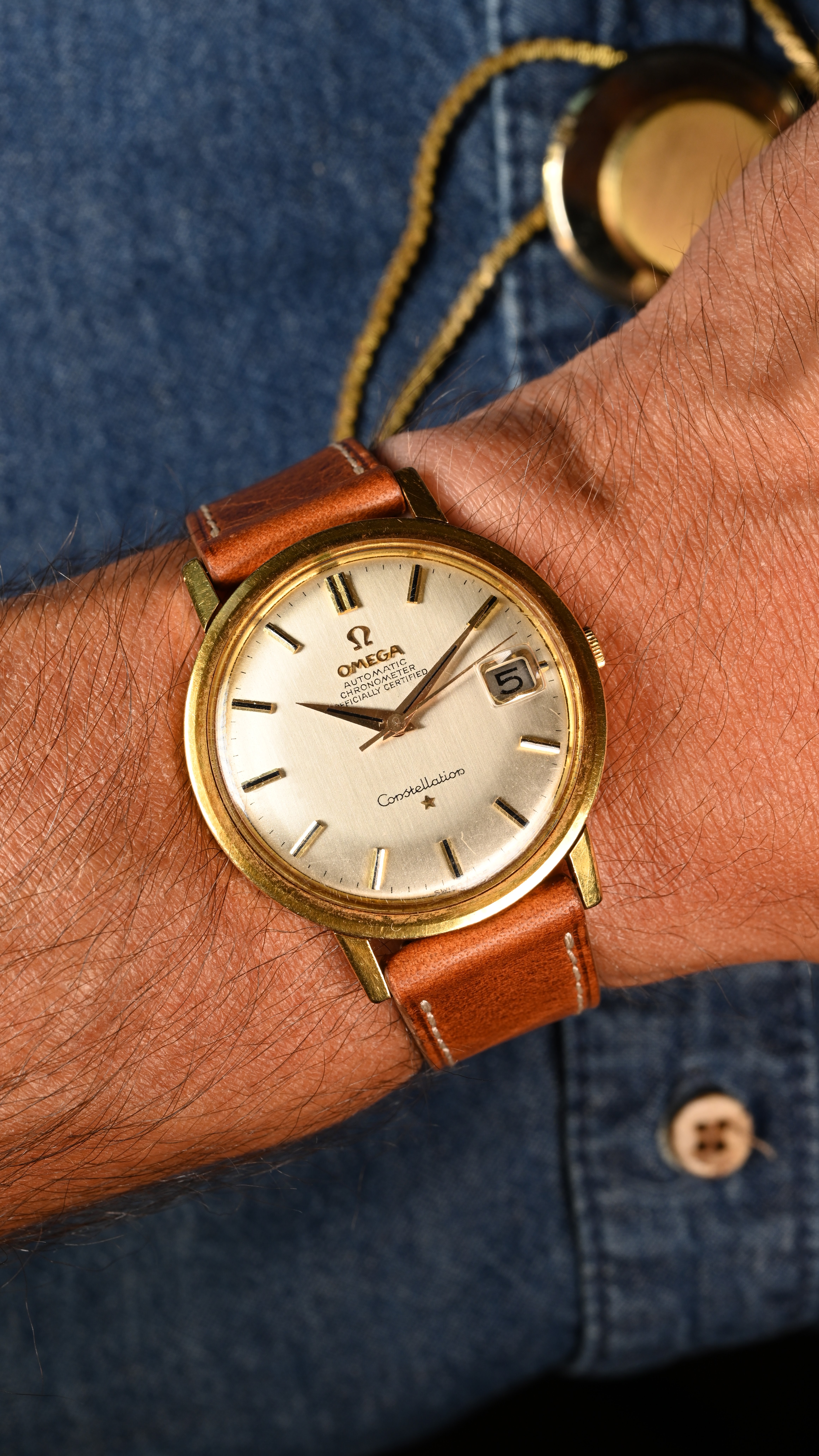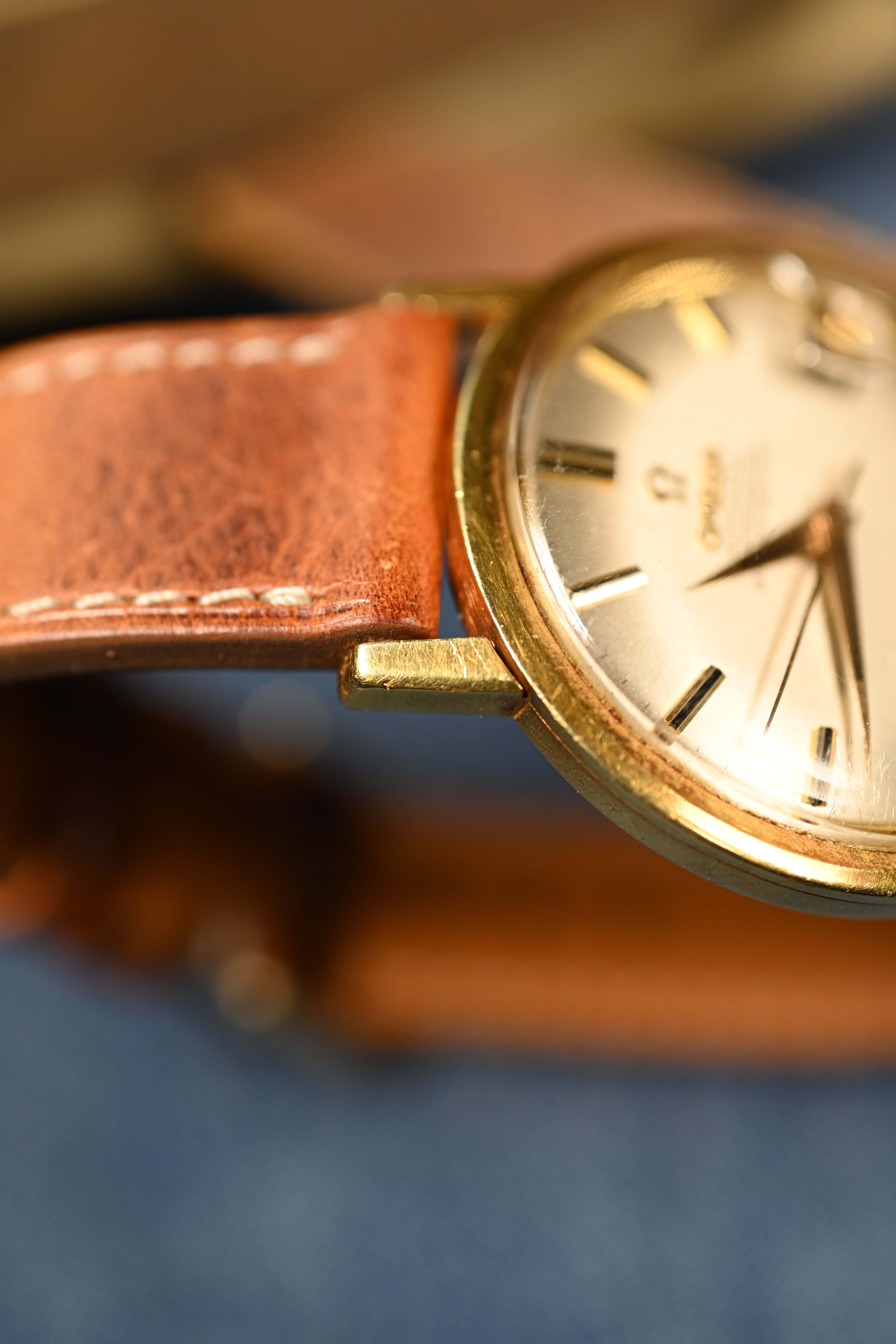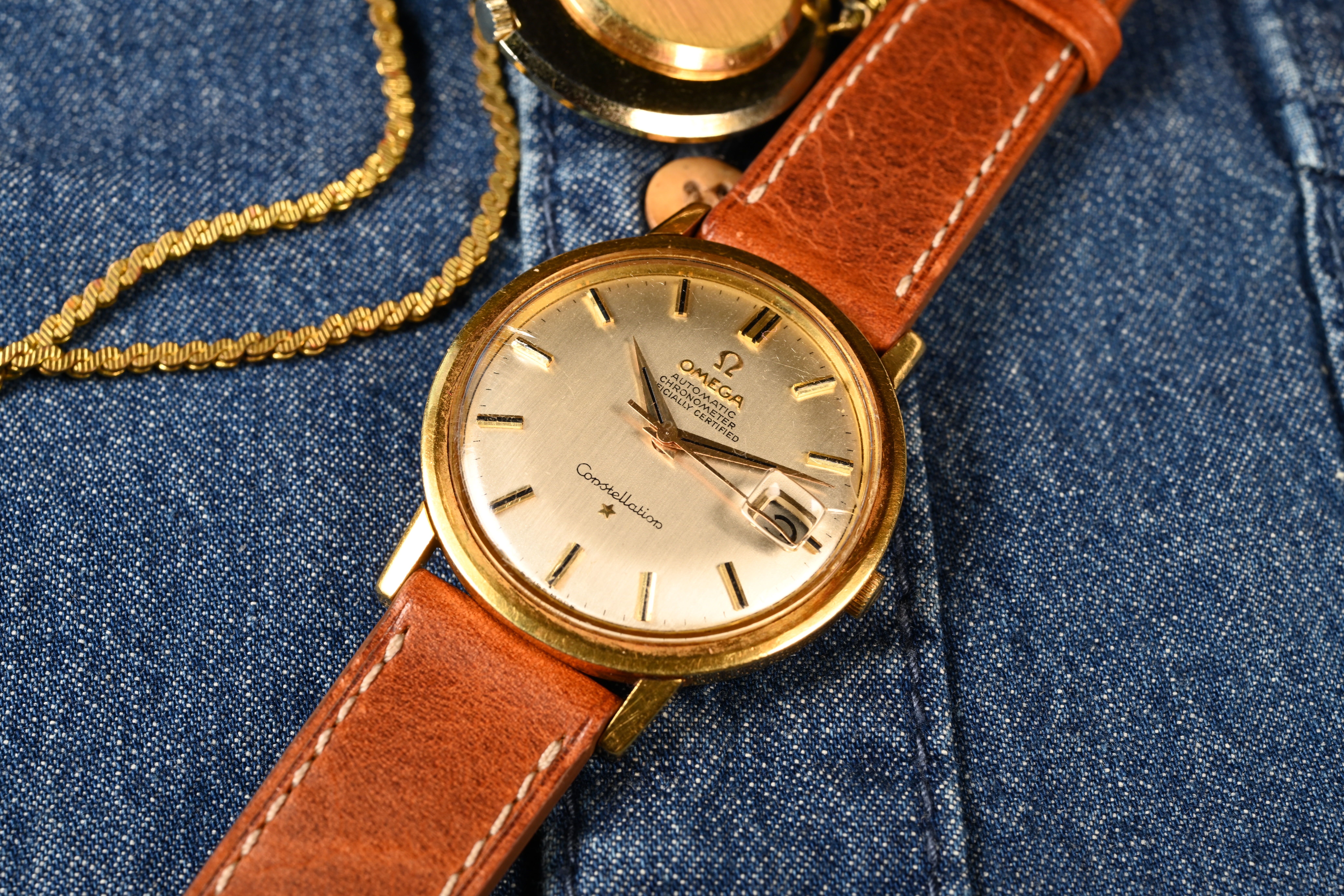 ·A very special solid 18kt yellow gold Omega Constellation. On the outside this looks like any other hidden crown Omega Constellation, save perhaps for its yellow gold case. Setting this Constellation apart from others however is its British manufactured case hallmarked indicating its origin in a little city known as London. The fancy "S" makers mark was first registered into London's Assay office in 1946 by a gentleman by the name of David Shackman. The registration location for the corporation in conjunction with hallmarks indicating the assay office all correctly match and result in a very neat vintage watch indeed.
