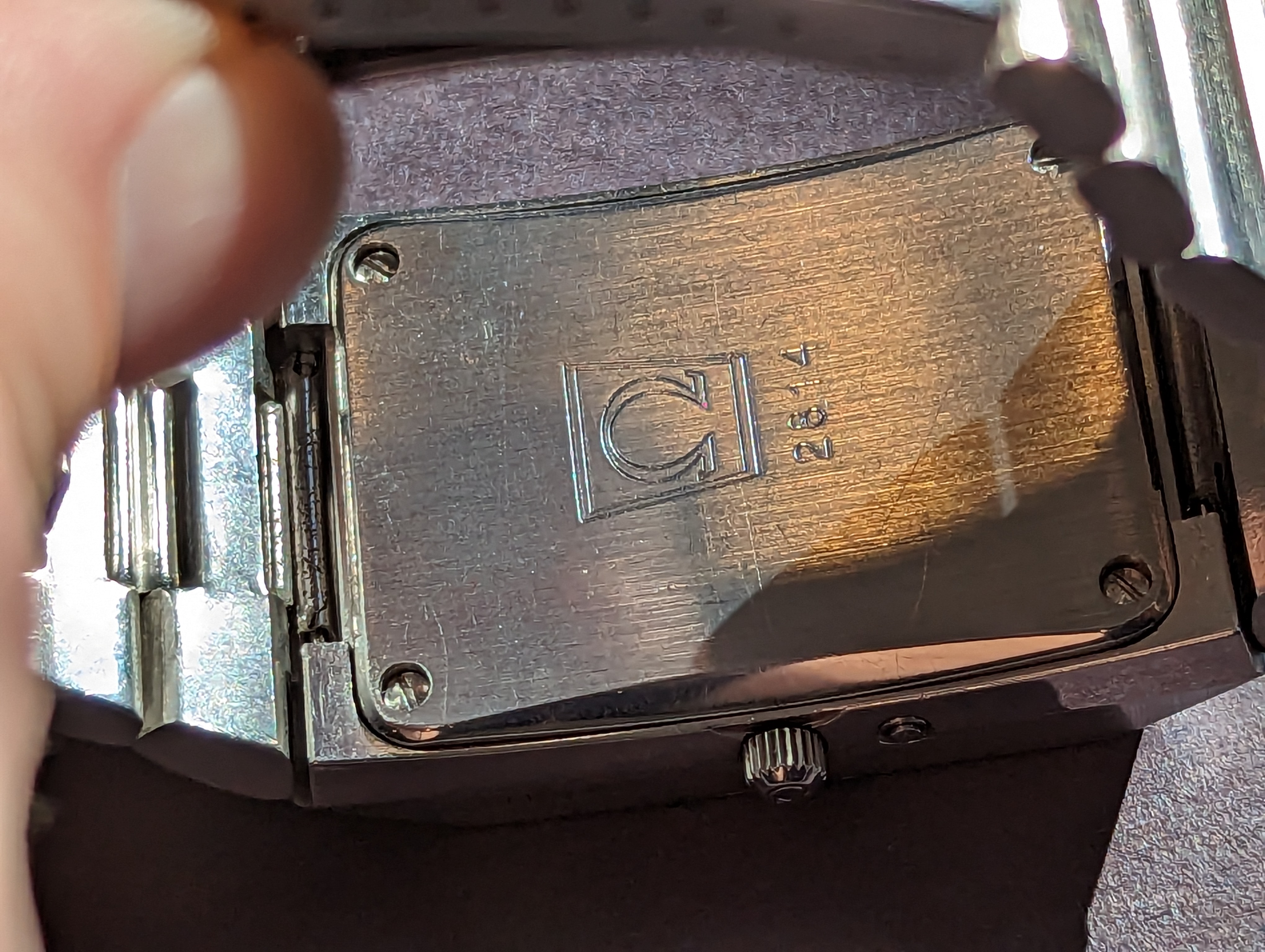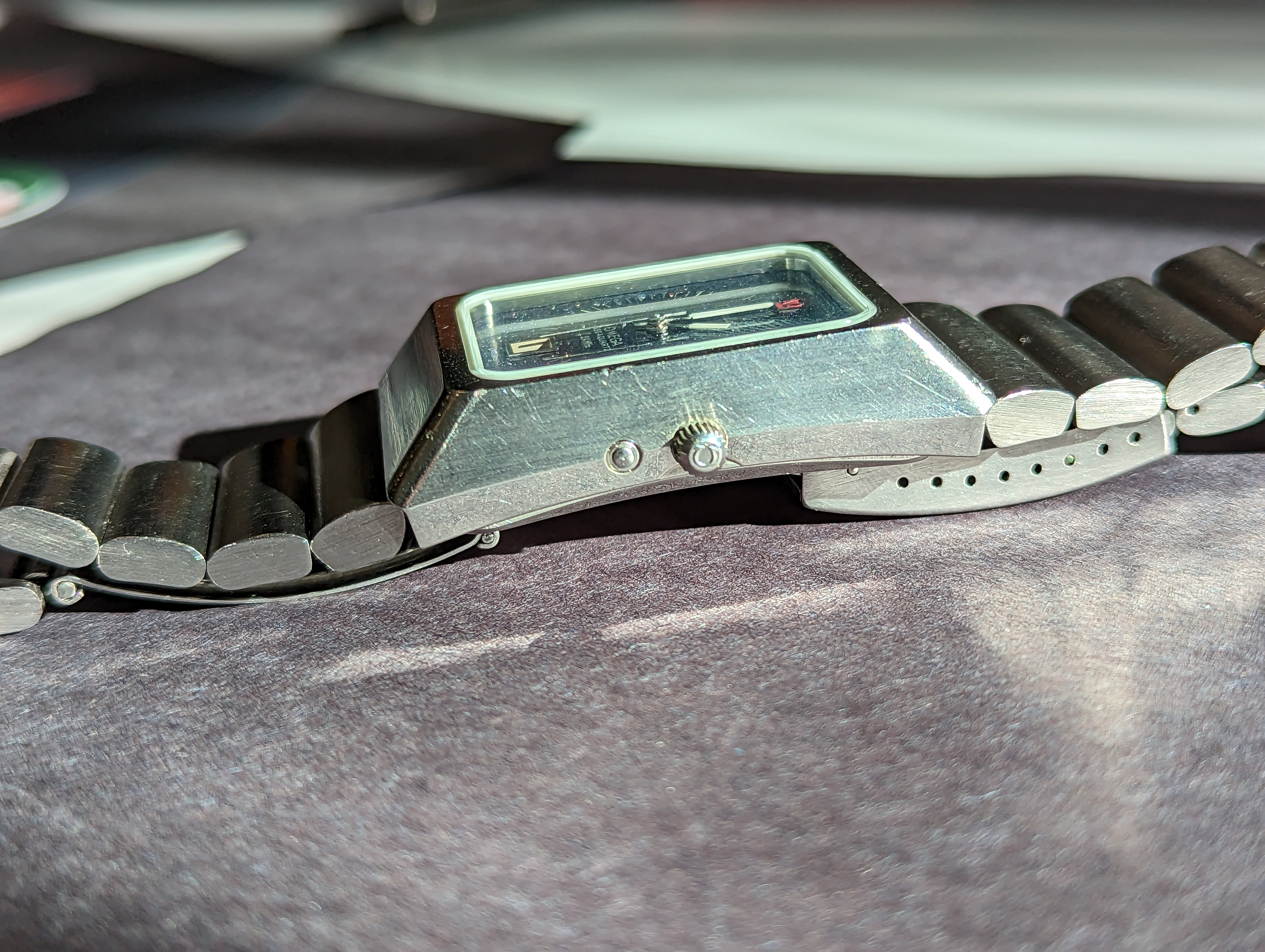 Movement: Original calibre 1510 quartz movement. This is the most accurate non-thermocompensated quartz movement ever made. It runs accurately to the original spec, of +/- 1 second per month . The button below the crown is the hacking button, which stops the movement so you can set it accurately. It's a 3 position crown. The middle position allows you to advance the hour hand one hour at a time for quick setting while traveling. The movement is clean, with no signs of battery leakage. I replaced the battery today, so it will not need another for probably a year.