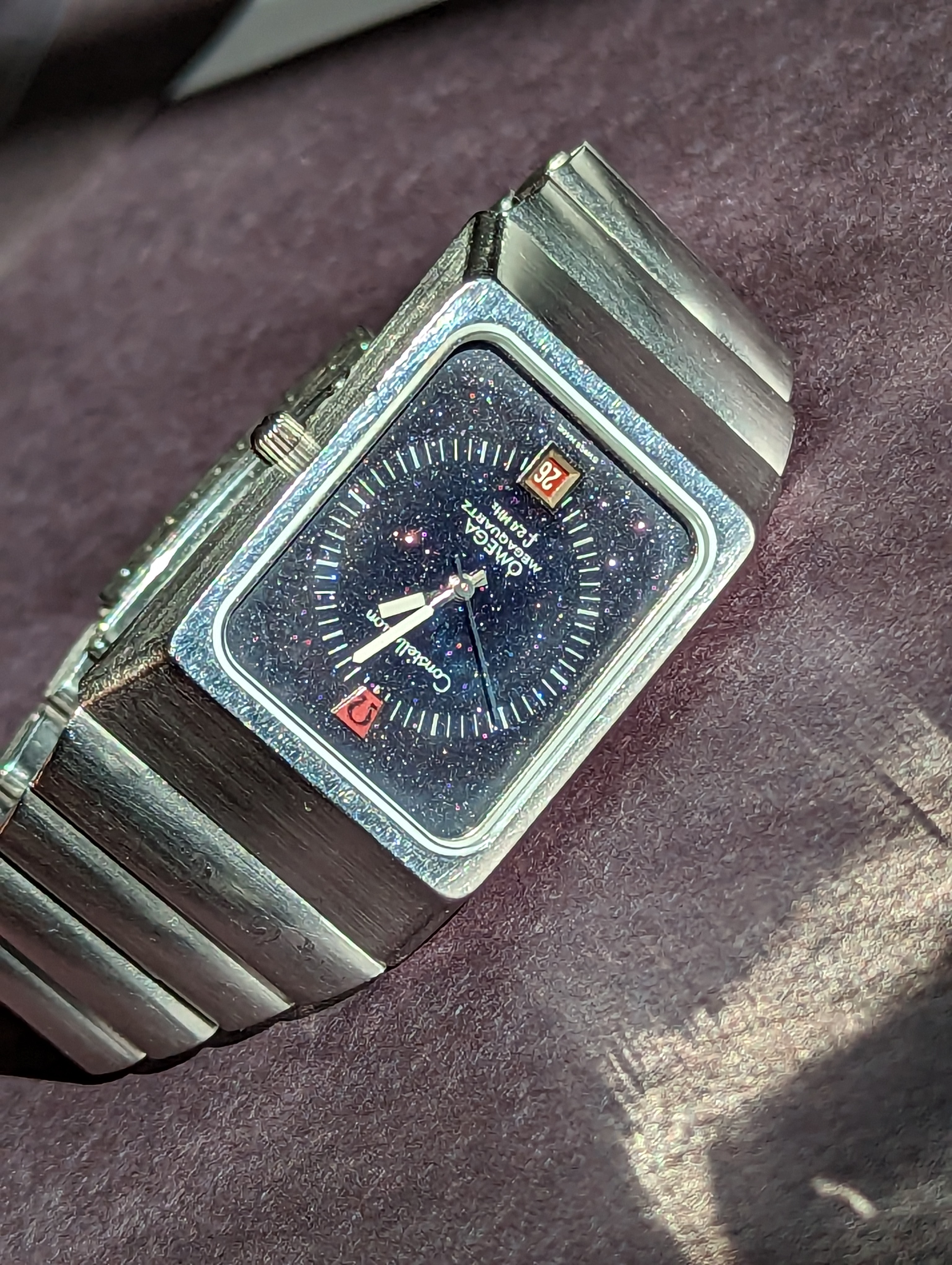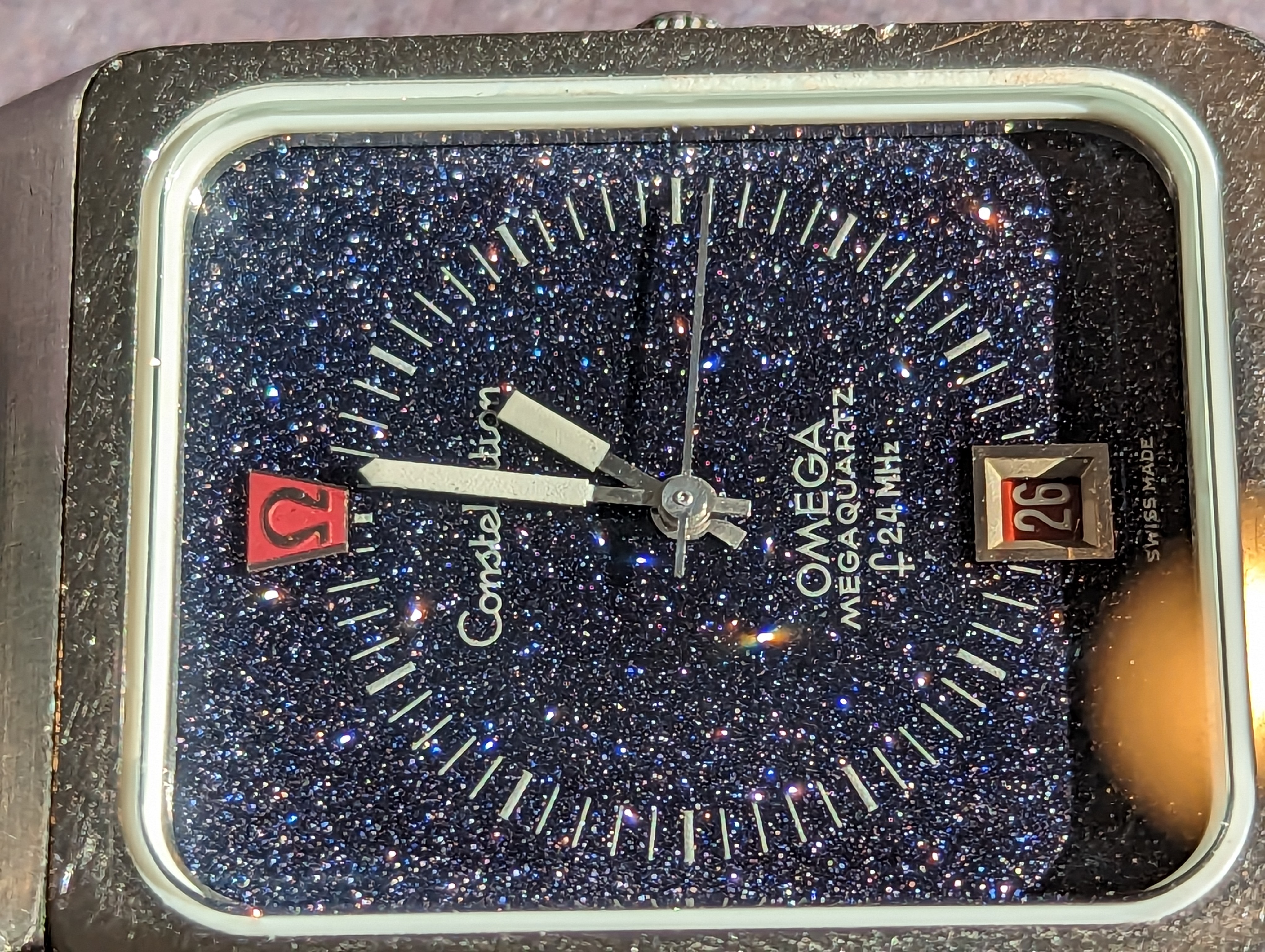 Dial: The dial is the star of this watch. it's a bluish-purple aventurine dial with the signature stardust gold flecks. It sparkles like glitter and looks amazing. These typically have problems with cracks developing in the dials, however there are no cracks on this example. It's clean with all printing intact and a beautiful applied red and gold Omega logo at the top.
