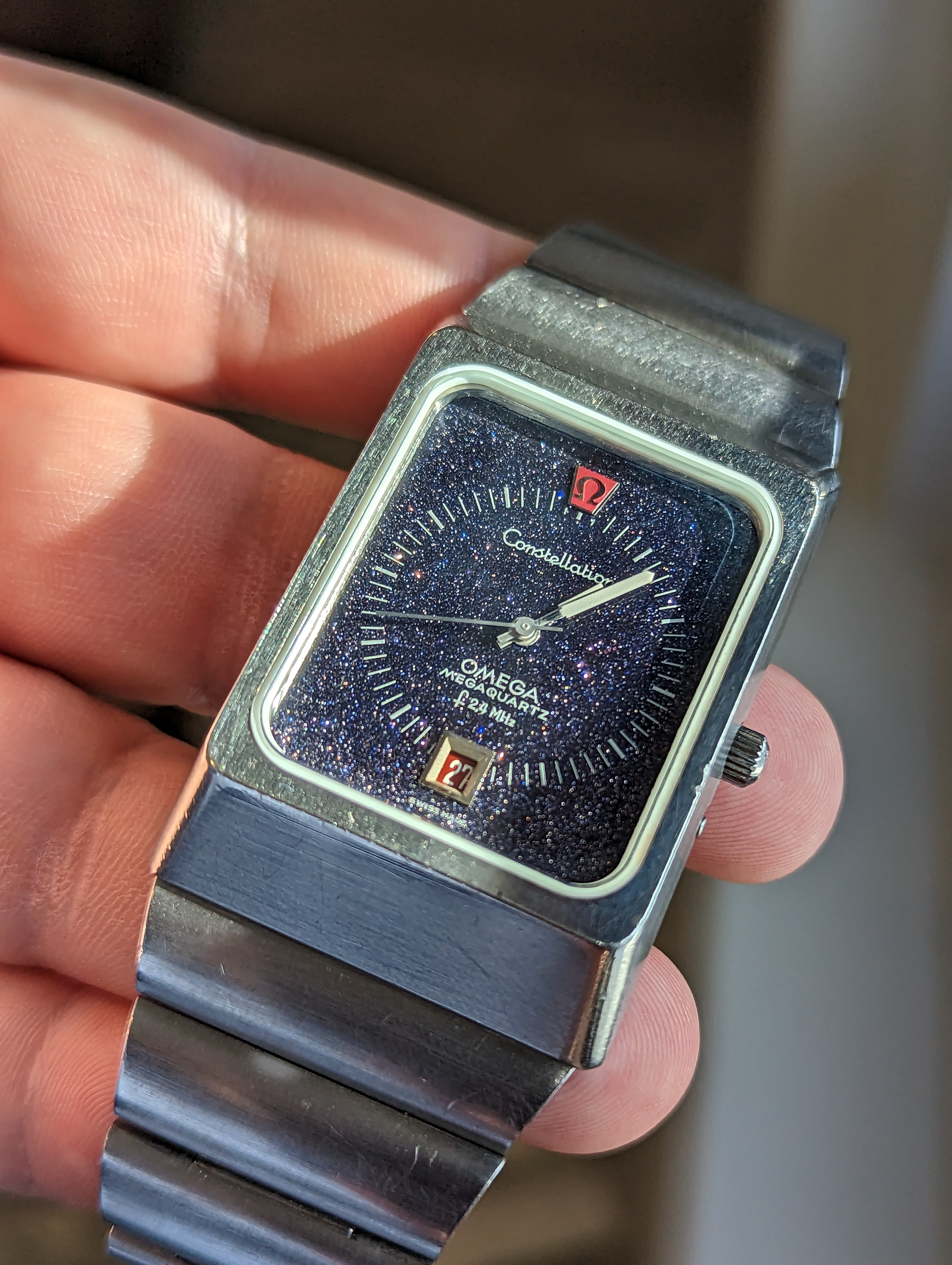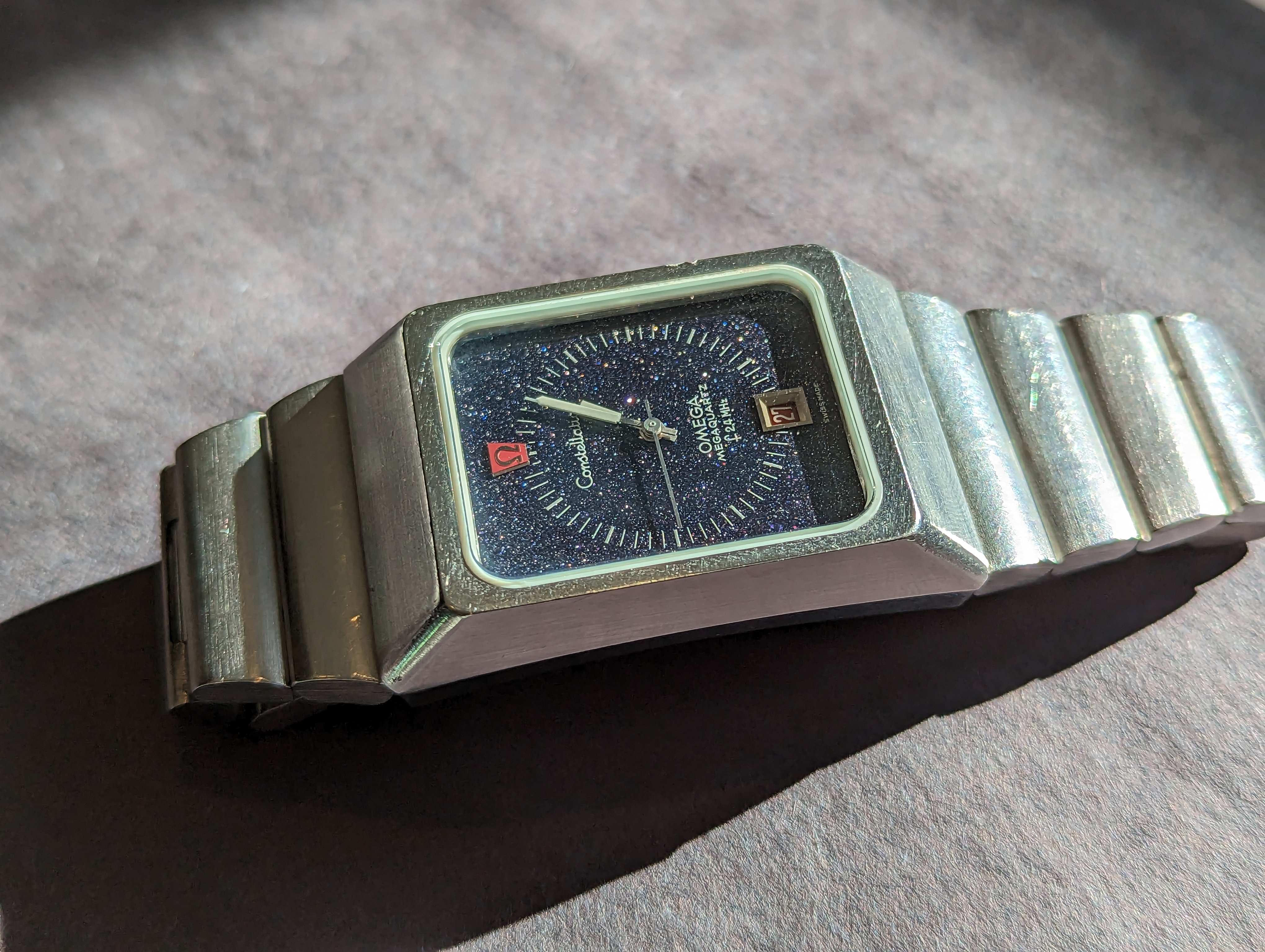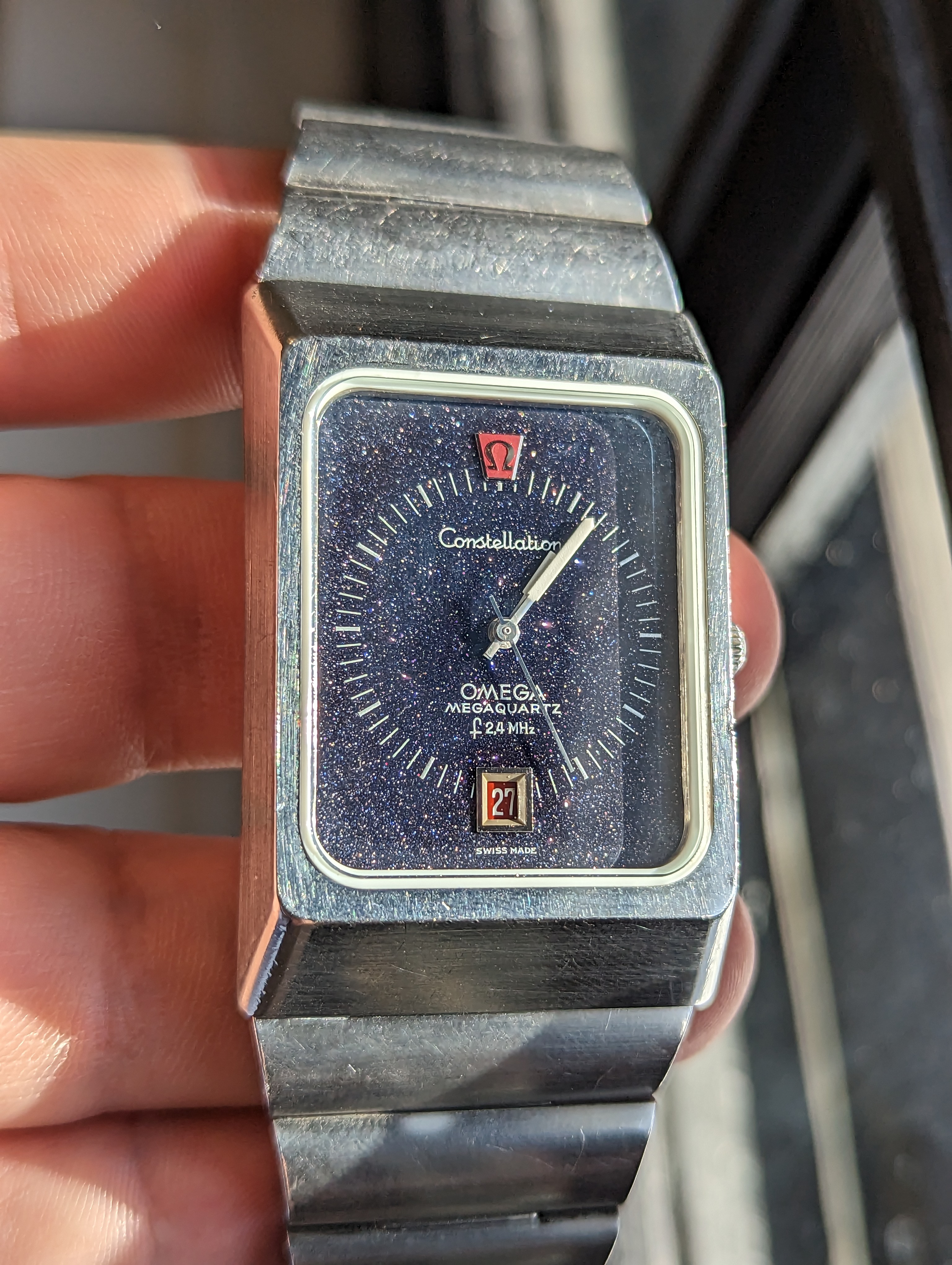 For sale is this very nice Omega Constellation Megaquartz f2.4 mhz Aventurine Stardust 196.0013. This is a landmark watch in the development of quartz technology. After the Beta 21 was released in 1970 by a consortium that included Omega and several other manufacturers, Omega began R&D of its own quartz movement. The result is the calibre 1500 series, which vibrated at an astonishing 2.4 mhz, making it still one of the most accurate, highest frequency quartz movement families ever made. I believe this one dates from 1974. These were Omega's most expensive watches at the time (several times more expensive than a Speedmaster Professional). This is a rare horological milestone that doesn't come up for sale often.