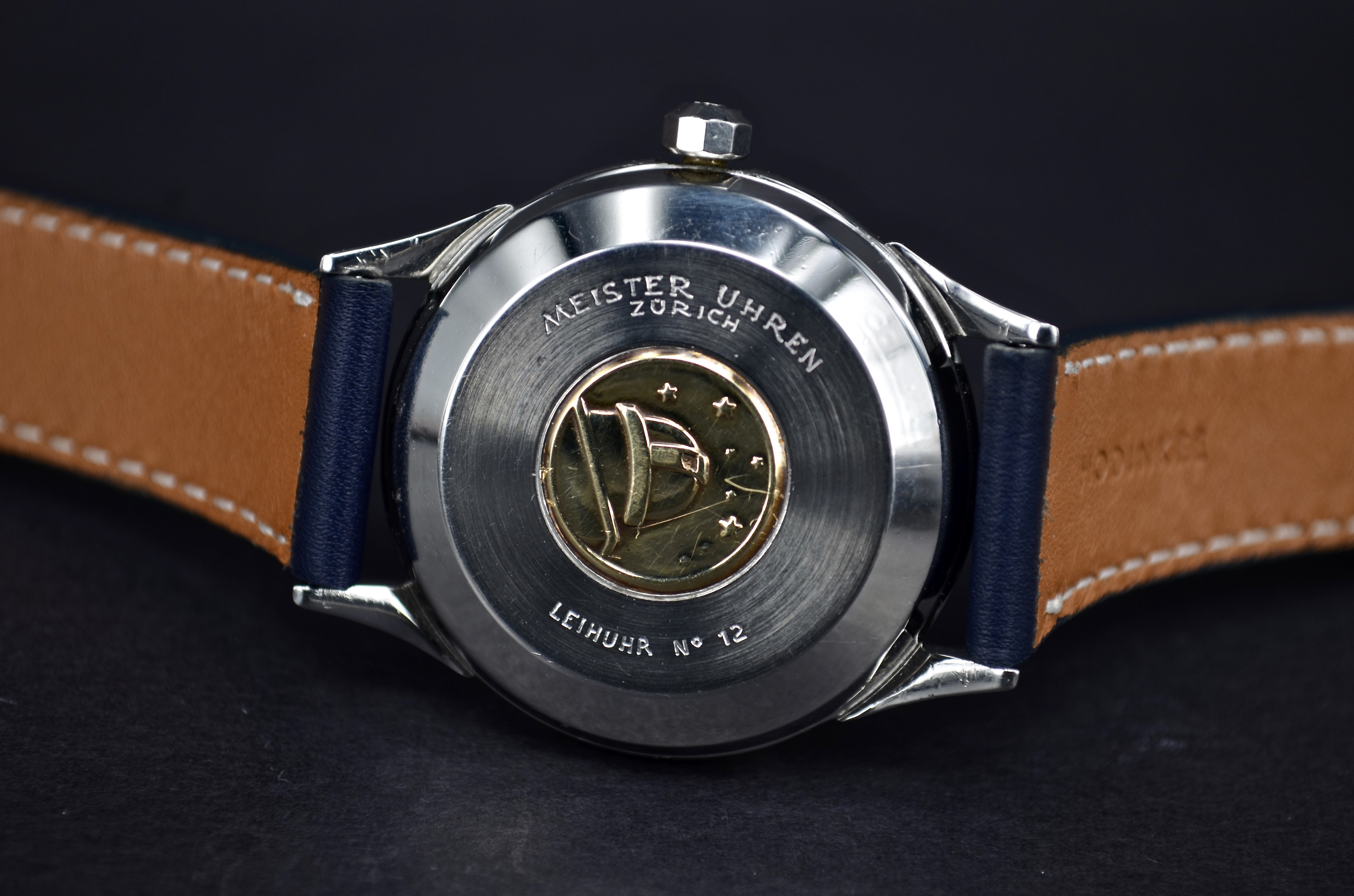 Dial: Silver Pie Pan with 'Meister' written on the dial with silver hour batons