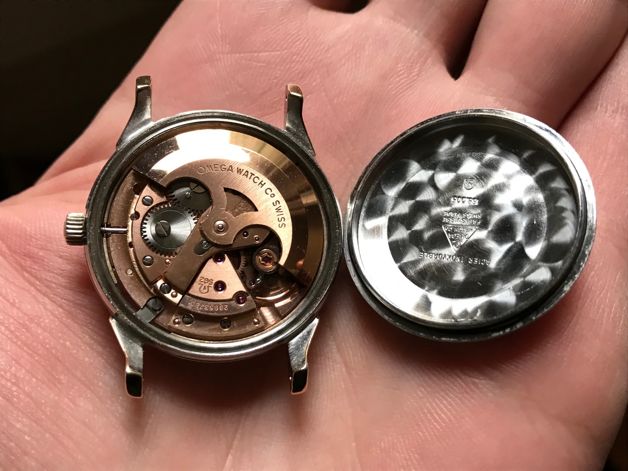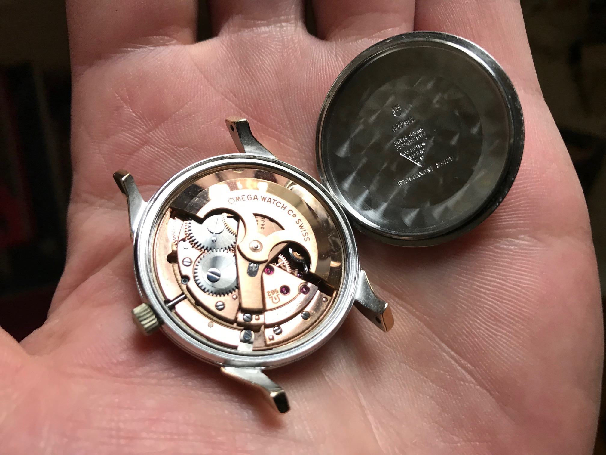 The automatic 562 Caliber with date feature is in beautiful condition ...and works fine though i never serviced it.Outside caseback is in great shape too and i do not see any watchmaking marks inside the caseback.Stamped 168.005