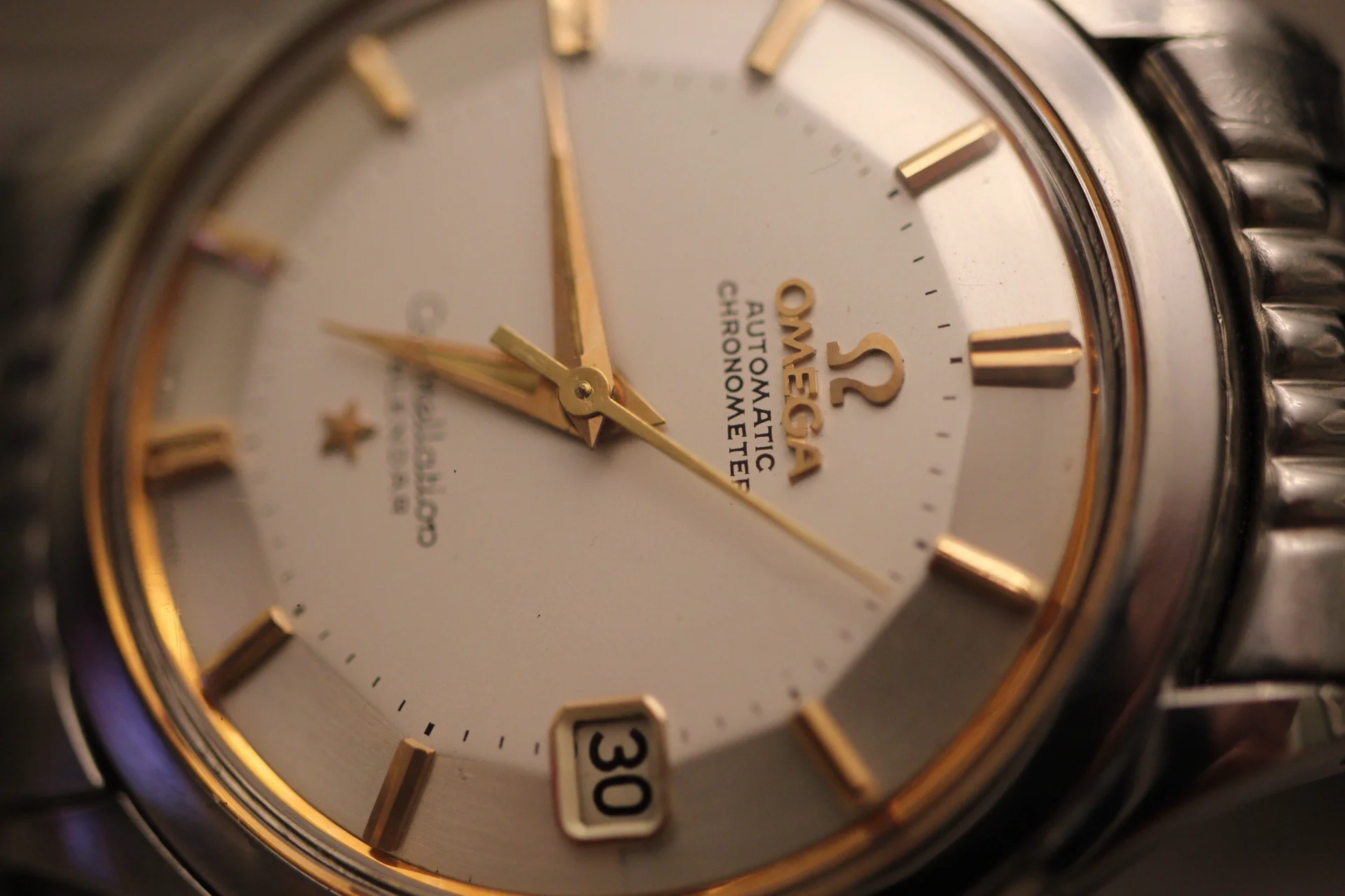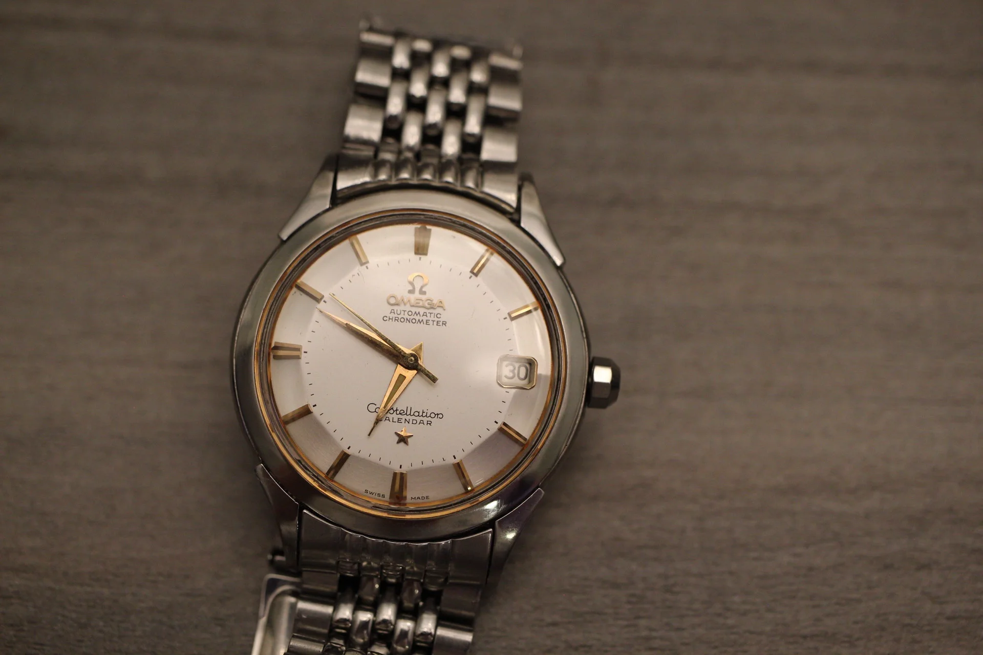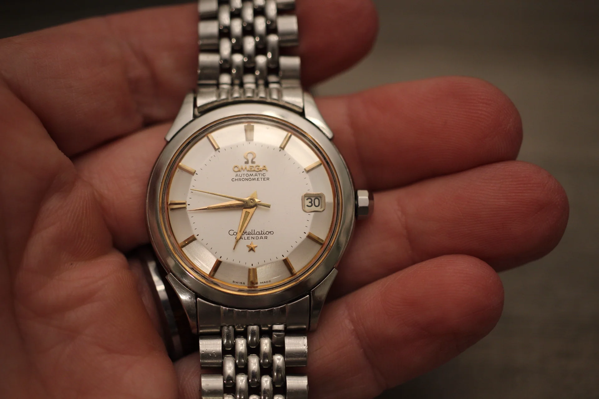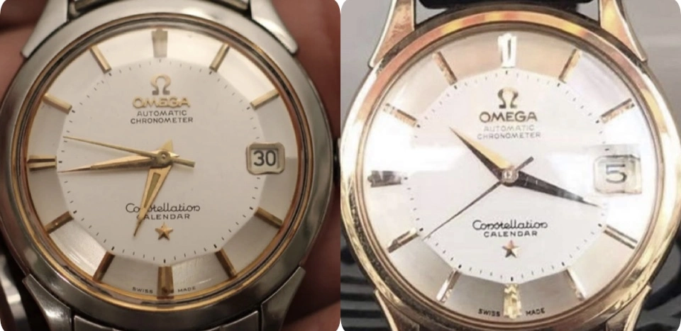 The owner states this is a 1958 Omega Constellation Pie Pan, ref: 2943-2-SC. The owners say the everything is original but I could not find any variations of this watch. The watch below are the same on different straps. Some of the problems I found is: