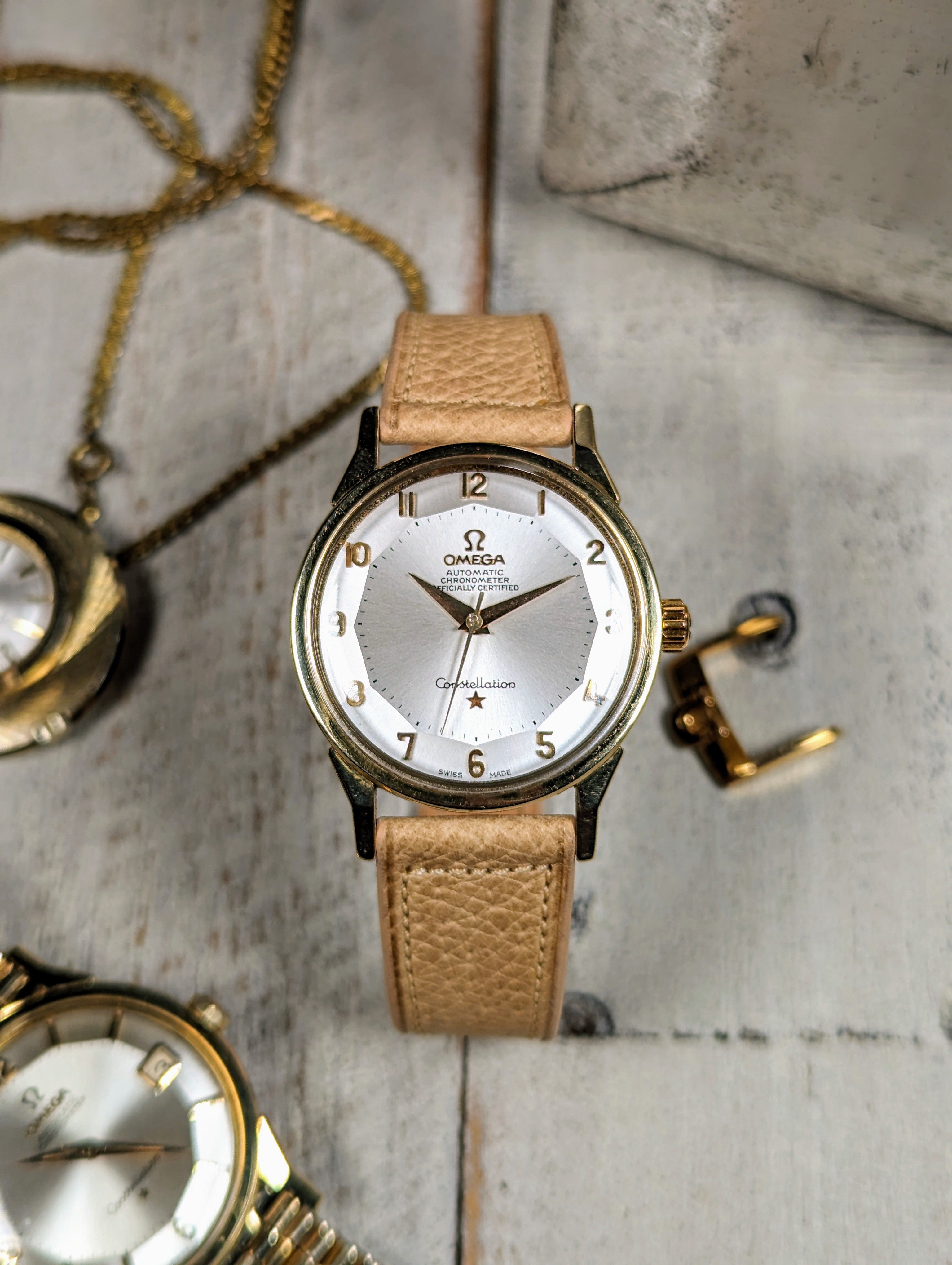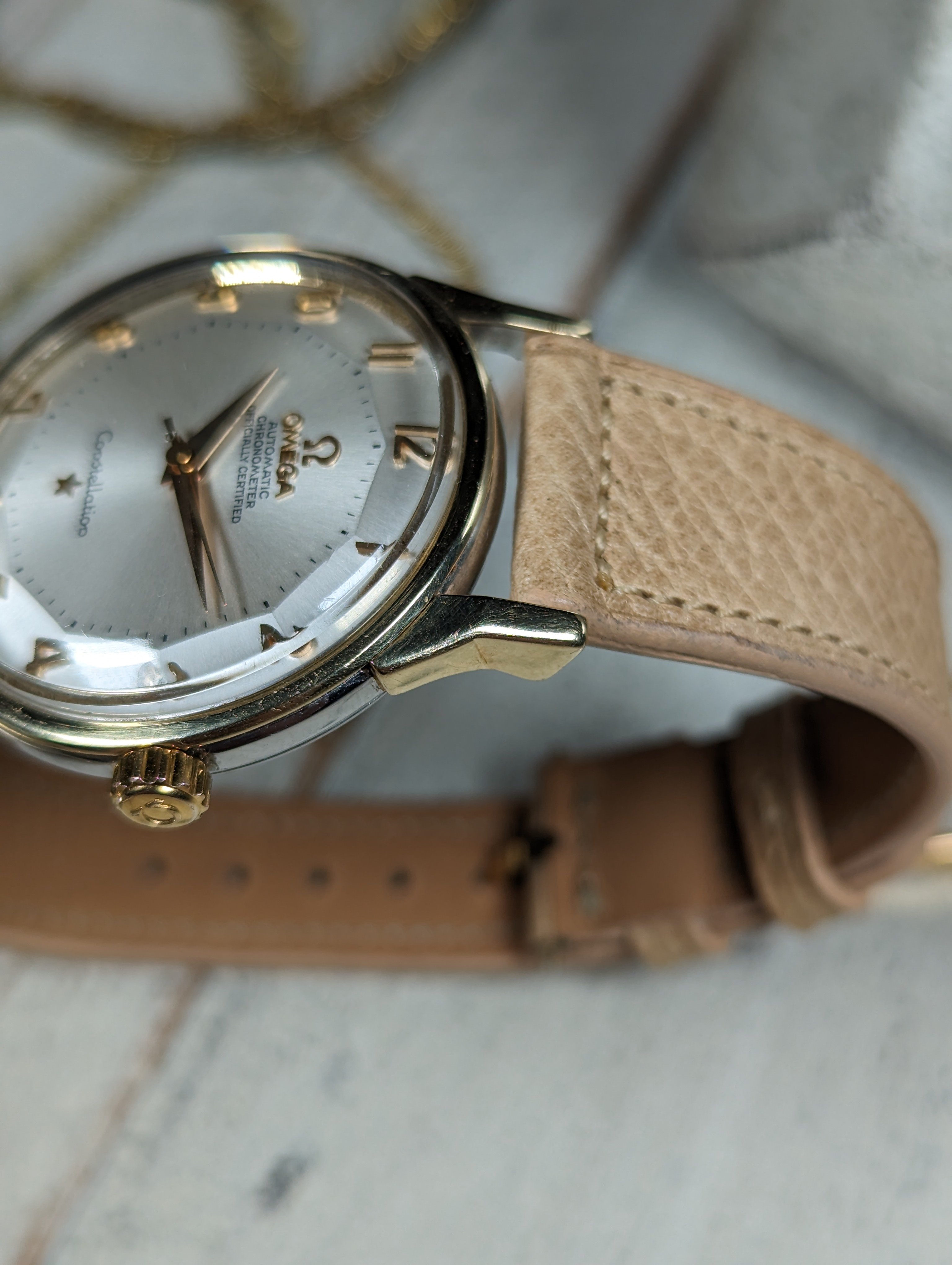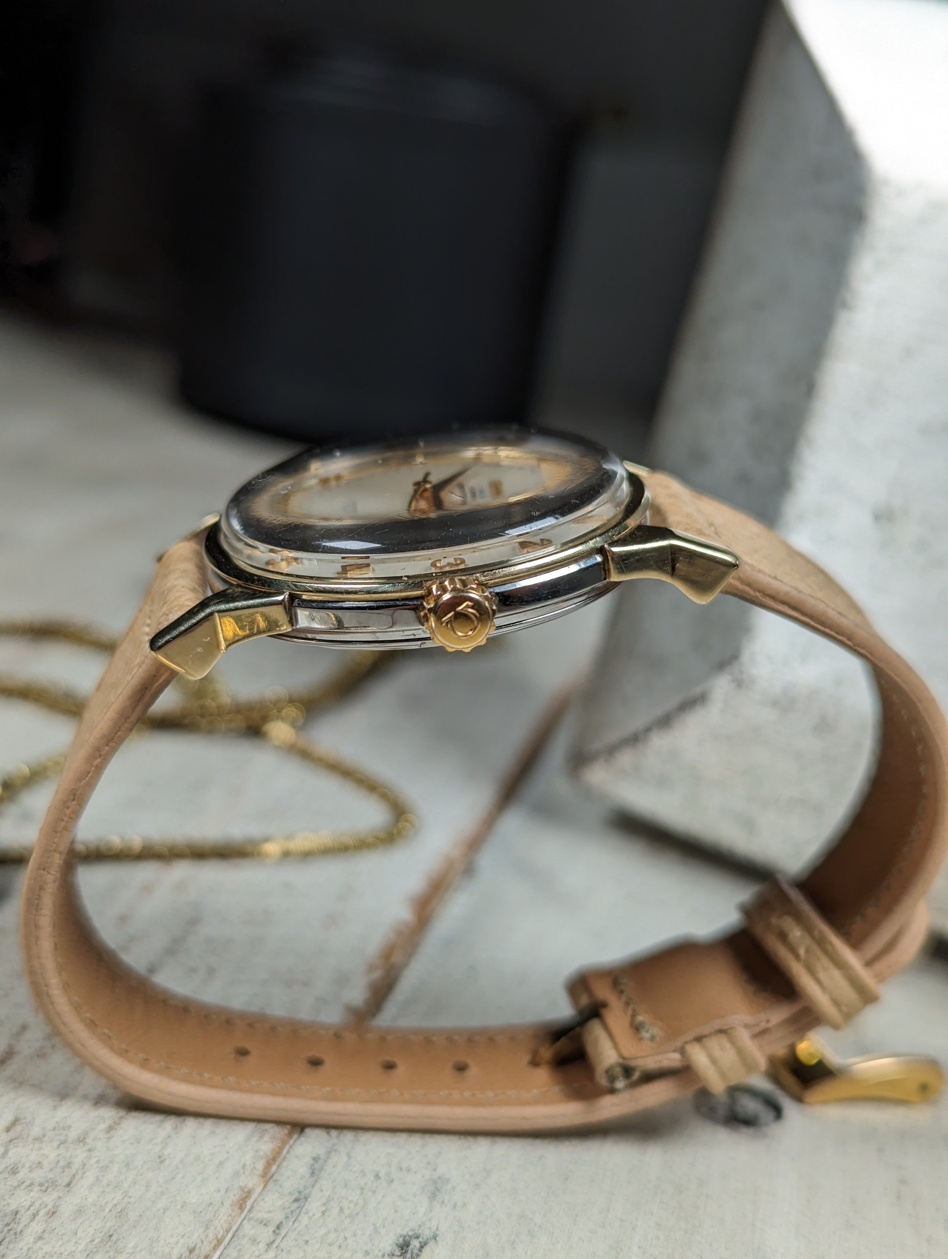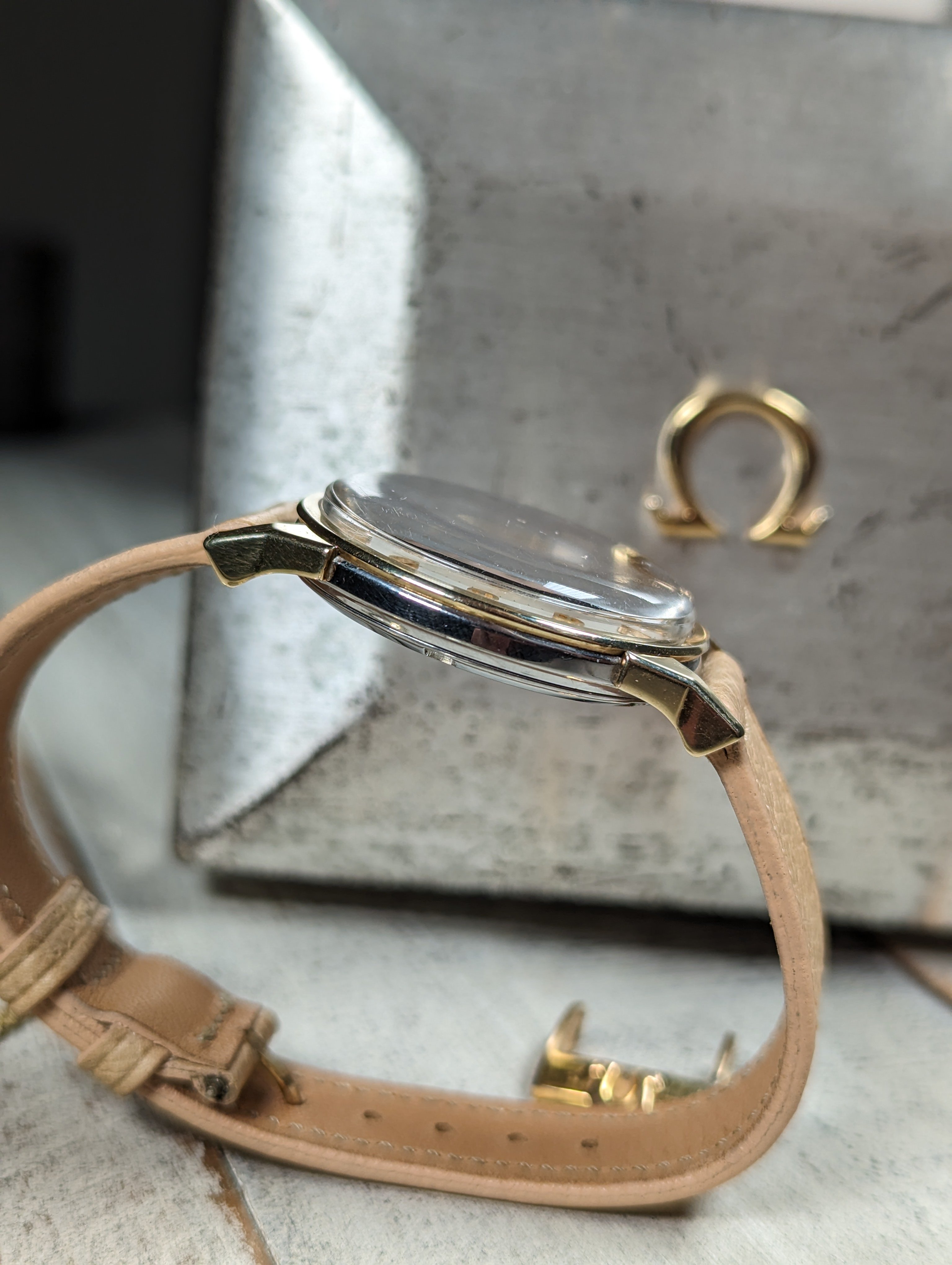 CASE: The gold capped over steel case measures 34mm in diameter. The case has previously been polished in the past. The crown has been replaced. The case is completed by the watches original, omega signed crystal.