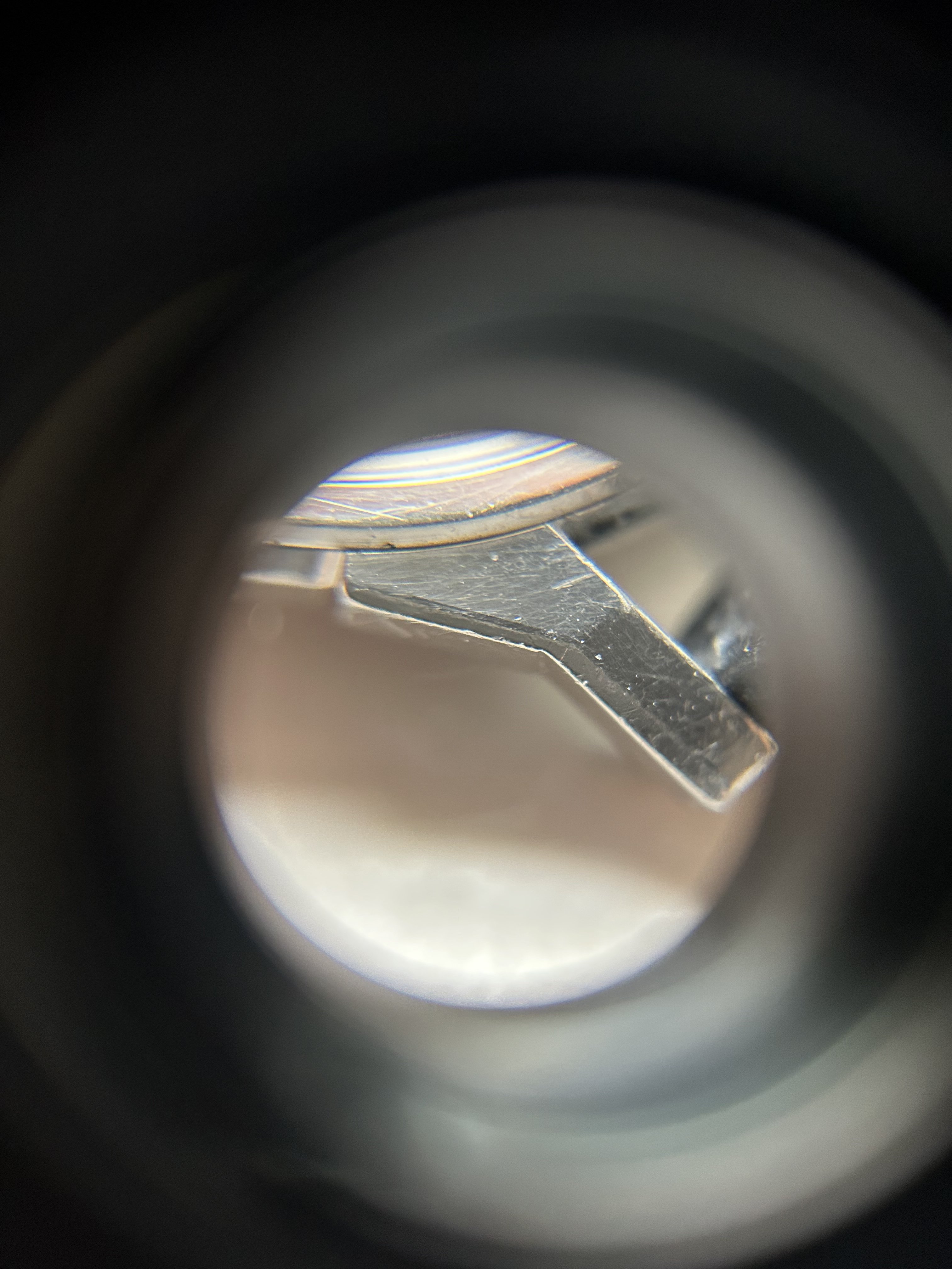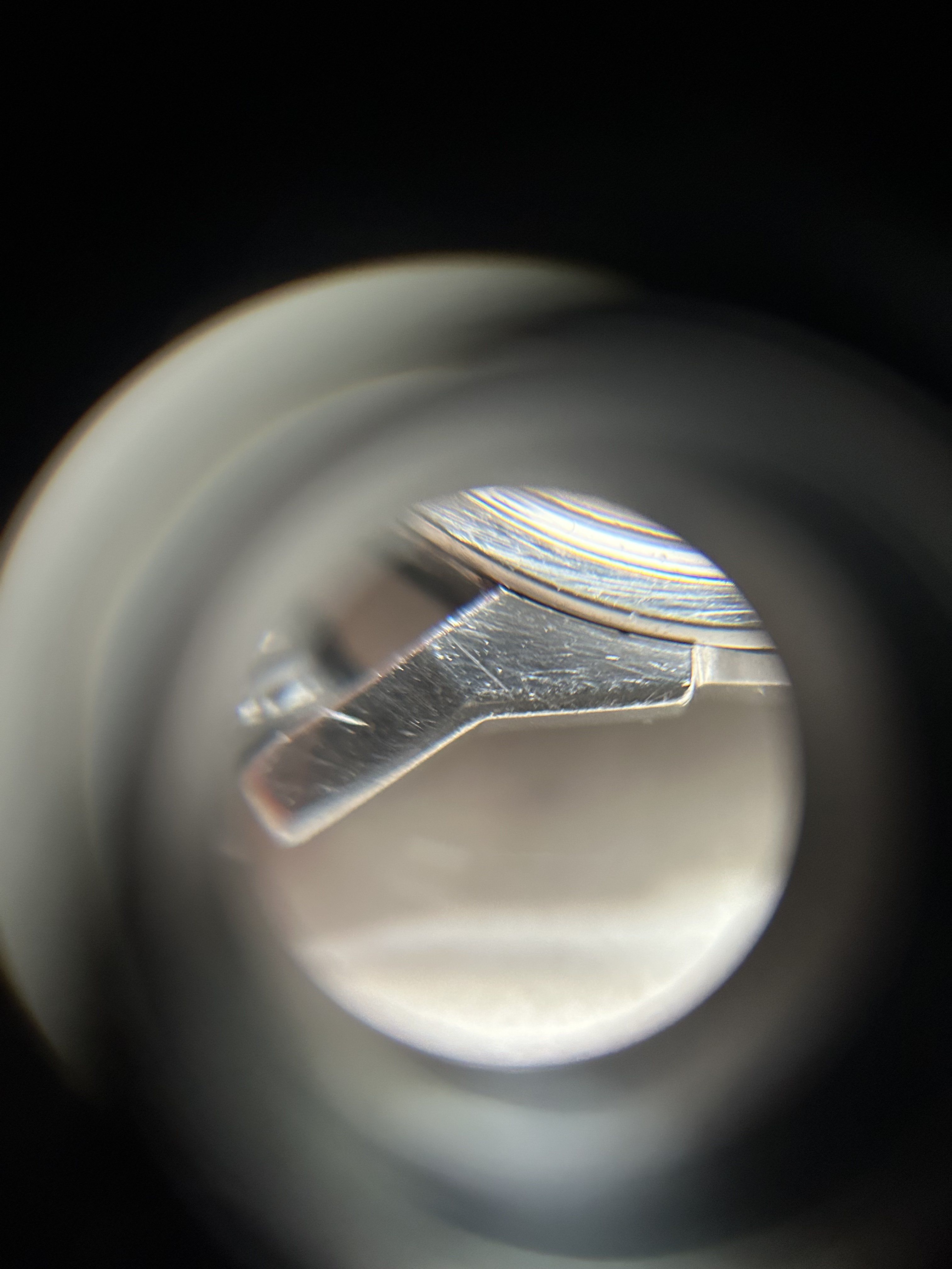 Dial: when viewed face on, the dial is very clean, and indeed in practice when wearing. It has taken on a subtly warm tone. From certain angles there are some small spots, but these are hardly visible when wearing. I have included a darker low contrast photo which shows this - however, as you’ll see, the photo is artificially darkened and so is not representative of real life; indeed it is deliberately unflattering but I include it so there’s no surprises. The loupe photos show the dial face on in natural light, and how it is in very nice condition.