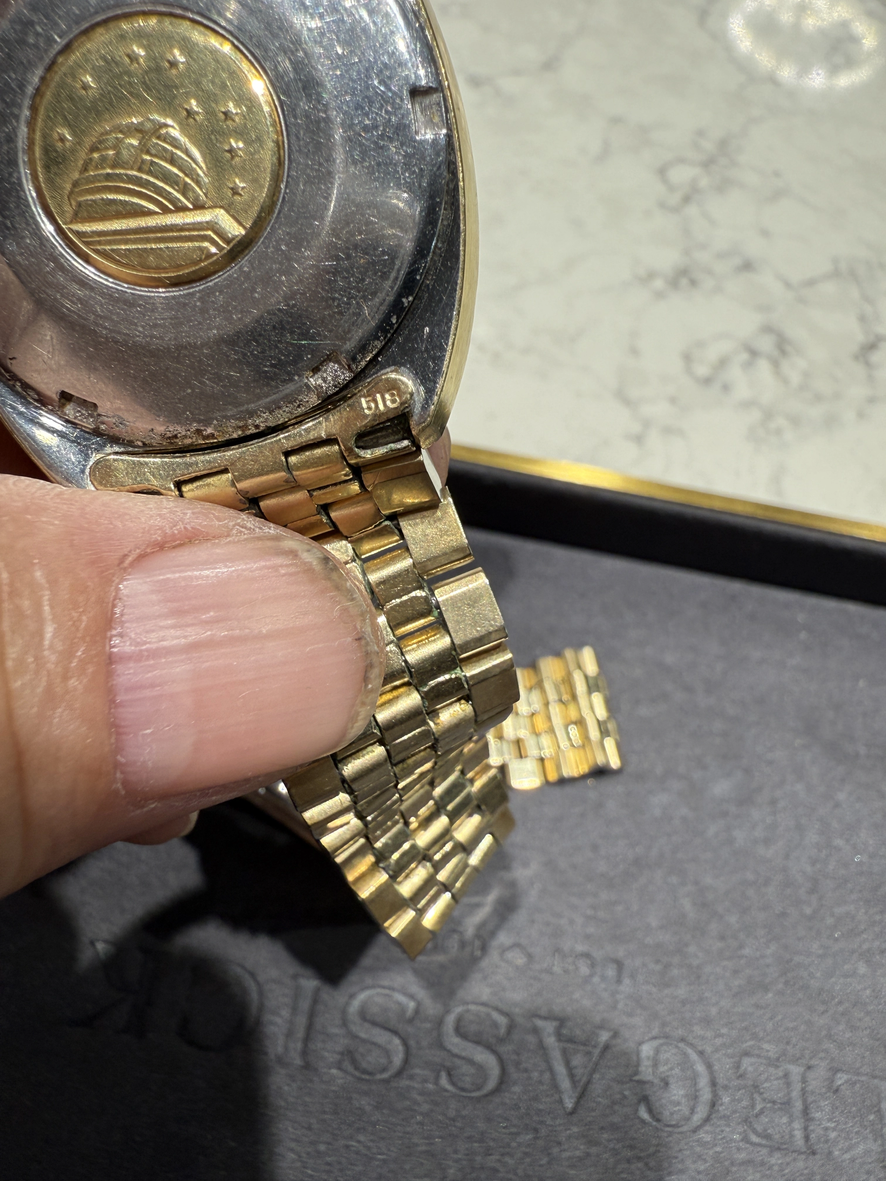 I am having my late grandfathers watch serviced and cleaned but I am missing the end link on his Constellation. 518. Description below. I only need the end but will take the full bracelet if someone has one. Any assistance would be greatly appreciated.